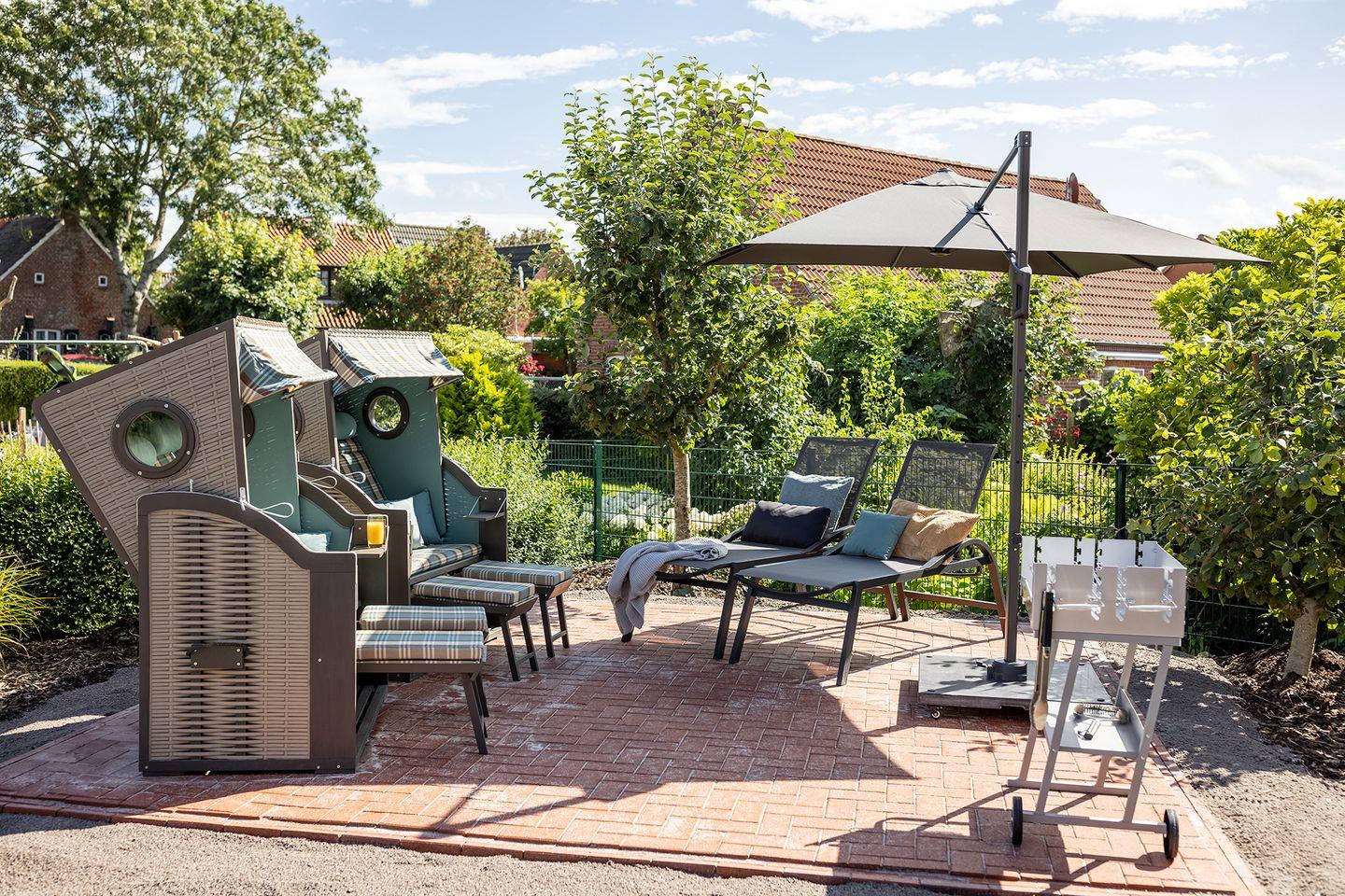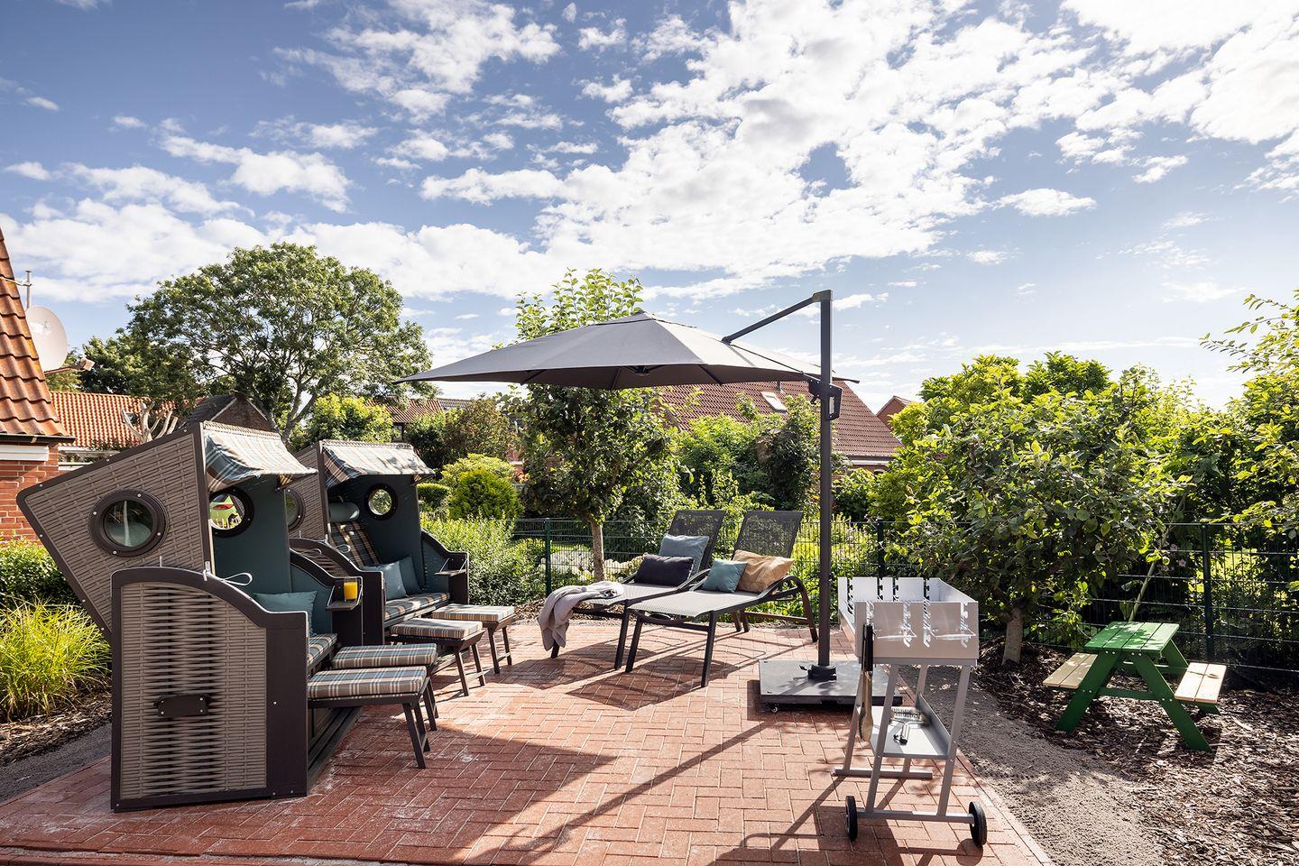Der Garten bietet einen wunderschönen Freisitz mit zwei Strandkörben, zwei Relax-Liegen und großem Sonnenschirm. Vor dem Wintergarten befindet sich noch eine windgeschützte Terrasse, so dass bei schönem Wetter die Mahlzeiten auch im Freien genossen werden können. Natürlich steht auch ein Grill zur Verfügung. Das Grundstück bietet Parkmöglichkeiten für mehrere Fahrzeuge (max. 4), sogar für einen Besucher mit Wohnmobil. Eine Wallbox für Gäste mit E-Auto ist vorhanden. Fahrräder können in einem abschließbaren Schuppen geparkt werden.