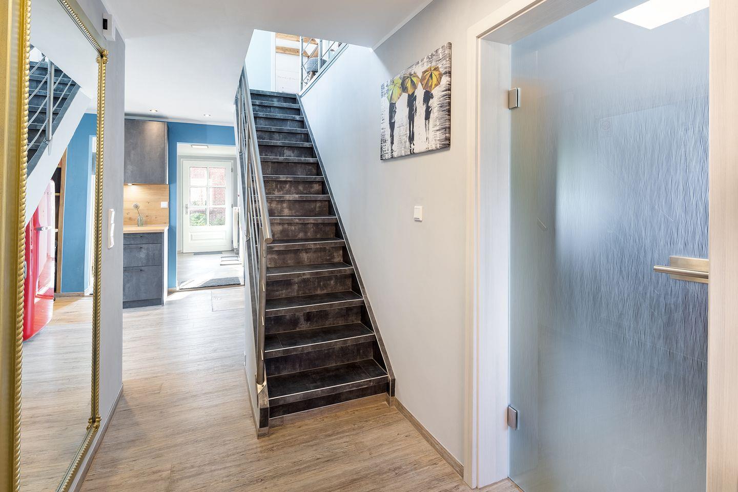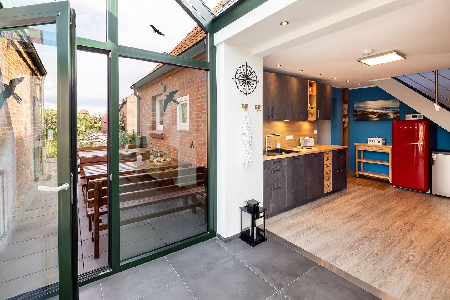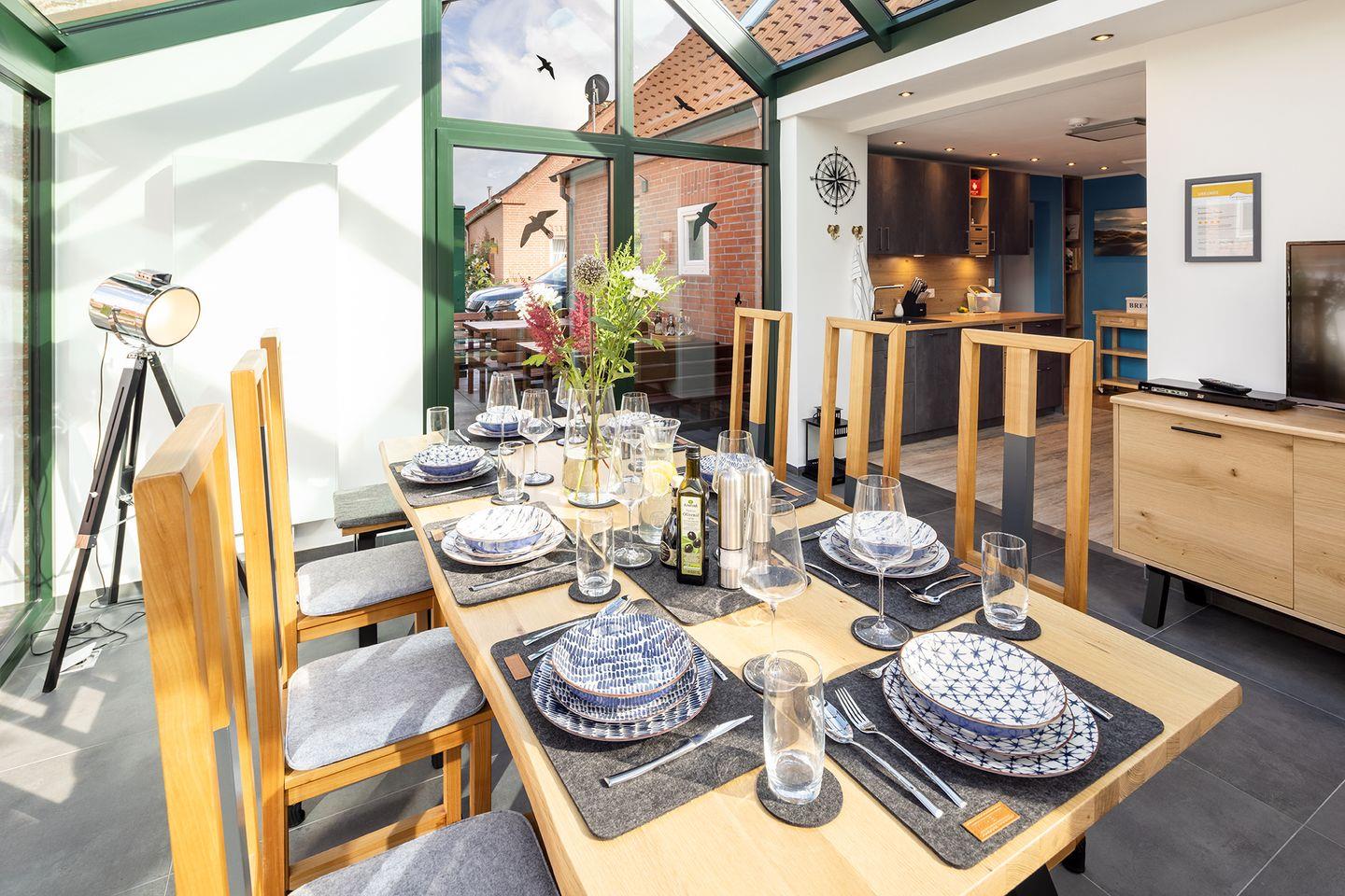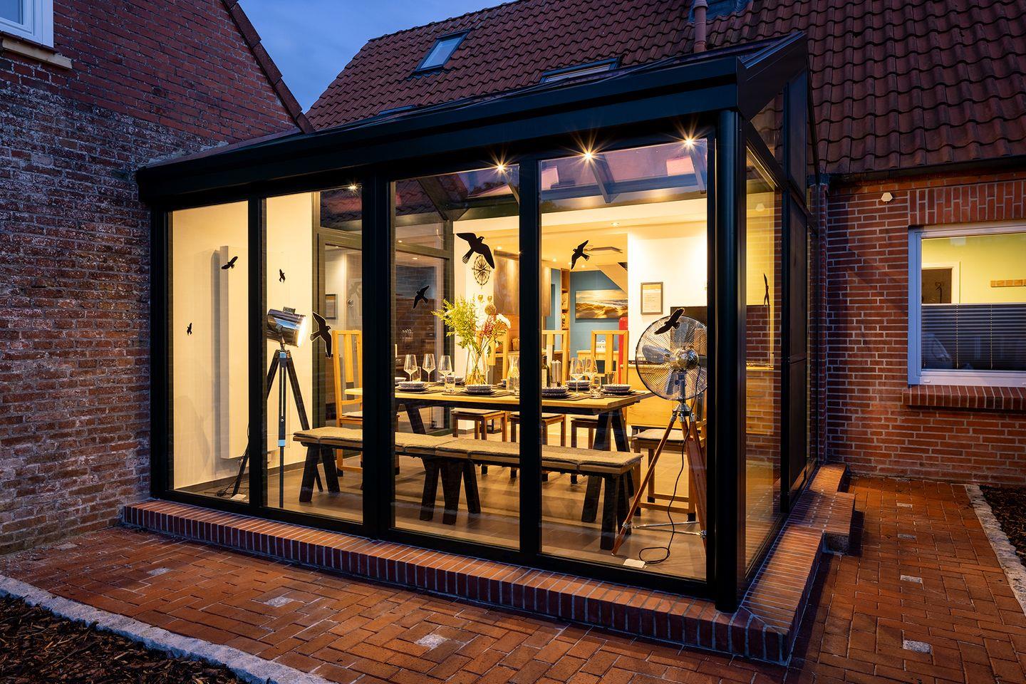 Modernes Auszeithaus in Pilsum mit Sauna, Wintergarten und rollstuhlgerechtem Bad für erholsamen Urlaub an der Nordsee.