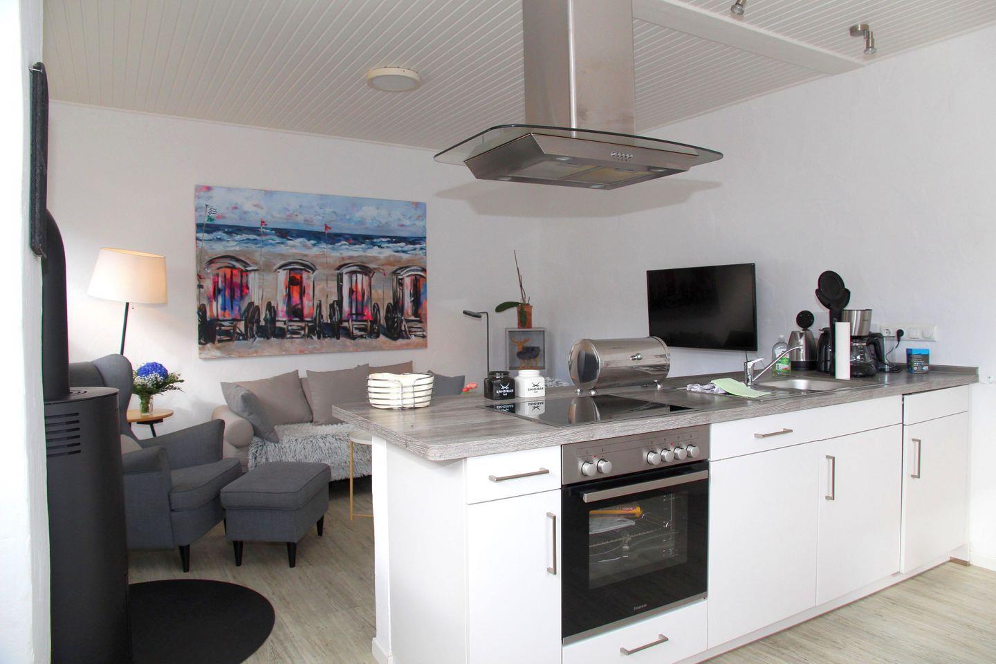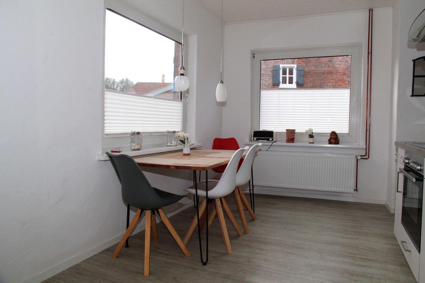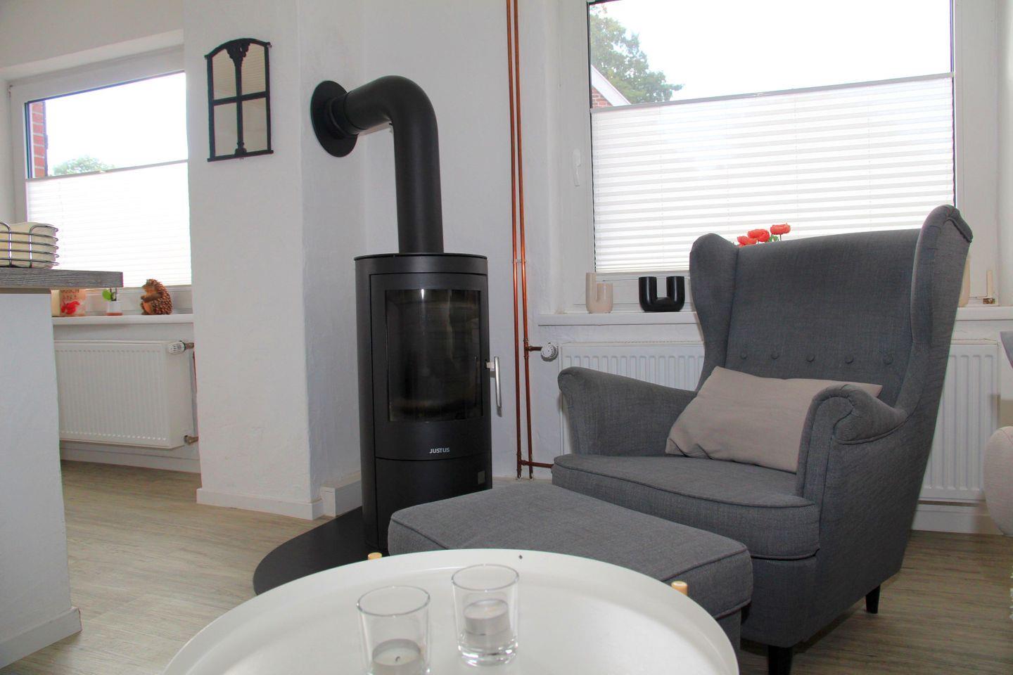 Das historische Friesenhaus wurde mit viel Liebe zum Detail modernisiert und verbindet traditionellen Charakter mit zeitgemäßem Wohnkomfort. Im Erdgeschoss befindet sich ein offener Wohn- und Essbereich mit Sitzgelegenheiten, TV und Kaminofen, der besonders an kühlen Tagen für eine gemütliche Atmosphäre sorgt. Die Küche ist hochwertig ausgestattet mit Spülmaschine, Mikrowelle, Toaster, Wasserkocher, Kaffeemaschine, Nespressomaschine, Herd, Backofen sowie einem Kühlschrank mit Gefrierfach – ideal für gemeinsame Kochmomente. Ebenfalls im Erdgeschoss liegen das moderne Badezimmer mit begehbarer Dusche und Föhn, das separate WC sowie ein Abstellraum.