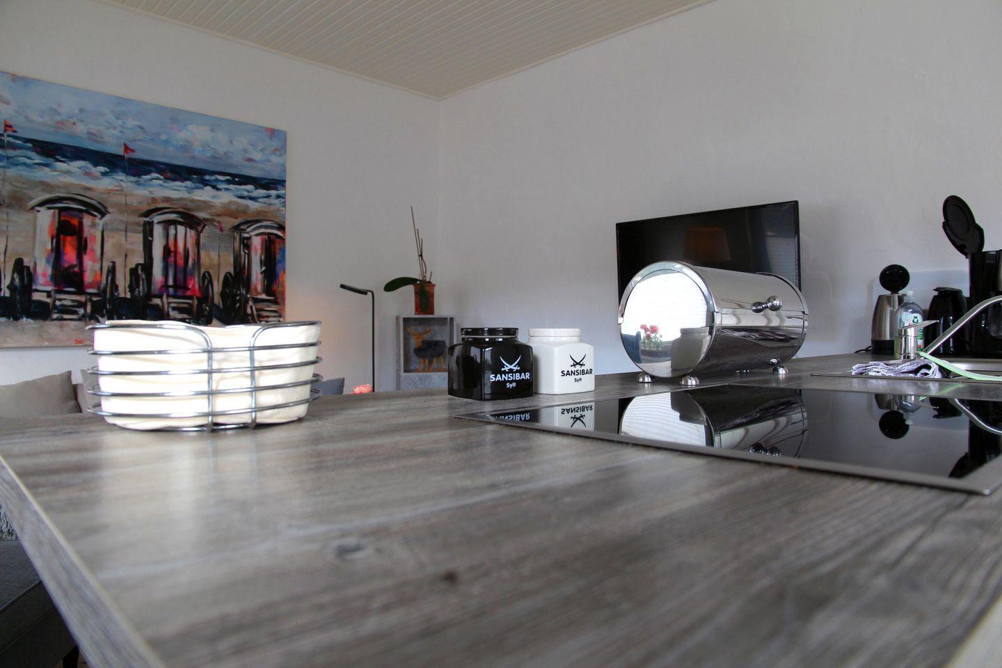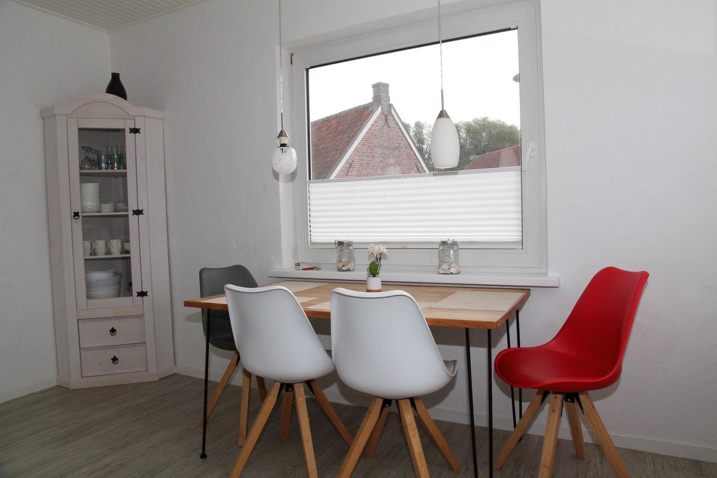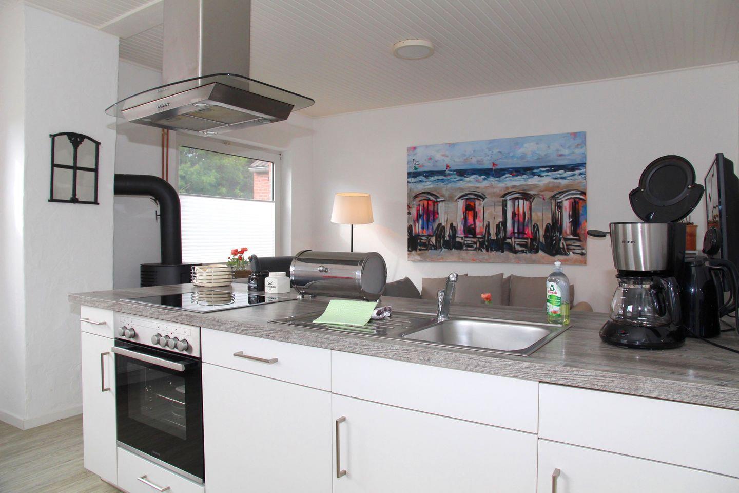 Das historische Friesenhaus wurde mit viel Liebe zum Detail modernisiert und verbindet traditionellen Charakter mit zeitgemäßem Wohnkomfort. Im Erdgeschoss befindet sich ein offener Wohn- und Essbereich mit Sitzgelegenheiten, TV und Kaminofen, der besonders an kühlen Tagen für eine gemütliche Atmosphäre sorgt. Die Küche ist hochwertig ausgestattet mit Spülmaschine, Mikrowelle, Toaster, Wasserkocher, Kaffeemaschine, Nespressomaschine, Herd, Backofen sowie einem Kühlschrank mit Gefrierfach – ideal für gemeinsame Kochmomente. Ebenfalls im Erdgeschoss liegen das moderne Badezimmer mit begehbarer Dusche und Föhn, das separate WC sowie ein Abstellraum.