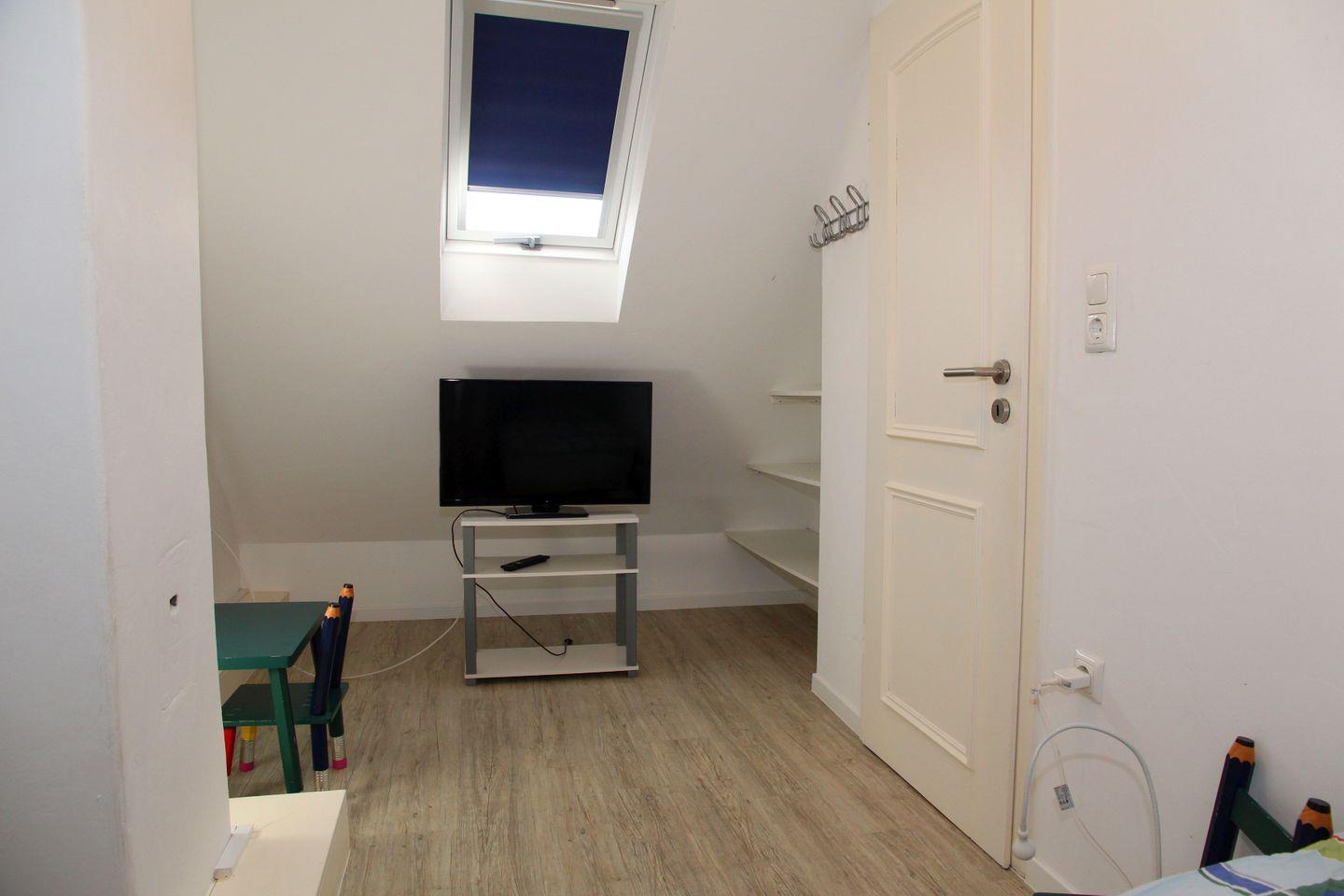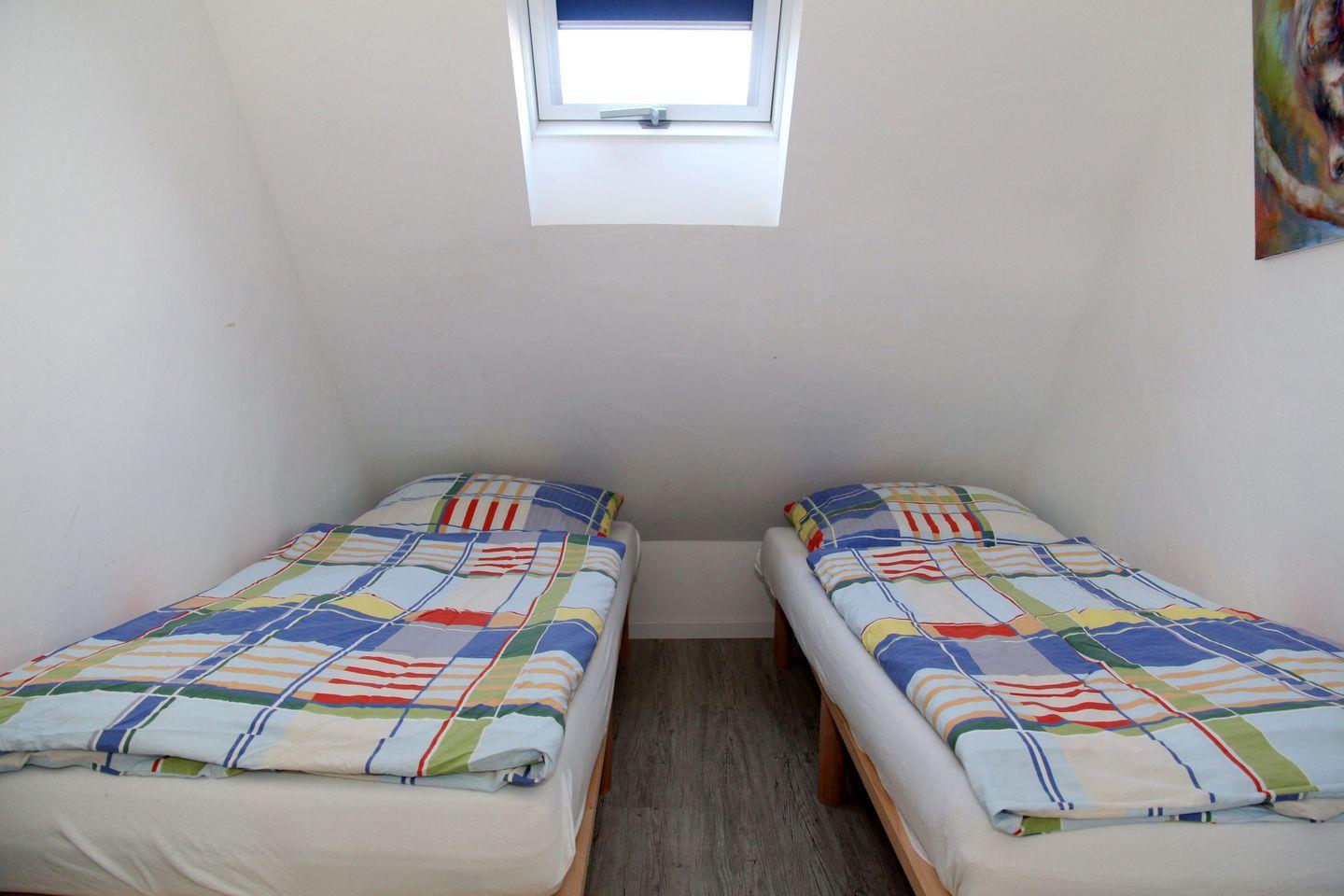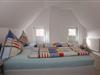 Über eine Holztreppe gelangen Sie in das Obergeschoss, wo sich zwei Schlafzimmer, jeweils mit eigenem TV, befinden. Das Elternschlafzimmer verfügt über ein Doppelbett (1,60 x 2,00 m), Kleiderschrank und Fliegengitter, im Kinderzimmer (zwei Einzelbetten) sorgen Veluxfenster mit Verdunkelungsrollos für erholsamen Schlaf. Alle Räume sind mit einem pflegeleichten Design-Vinylboden ausgestattet, die Wände sind in traditioneller Gipsoptik freundlich hell verputzt.