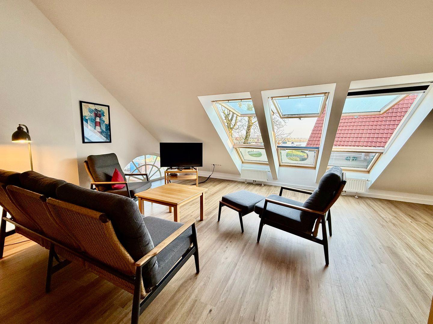 Die großzügige Komfort-Ferienwohnung „Visquard“ liegt im 1. Obergeschoss zur Deichseite und bietet Platz für bis zu 4 Personen auf zwei Ebenen. Genießen Sie den herrlichen Blick über den Kutterhafen und die Hafenausfahrt.
