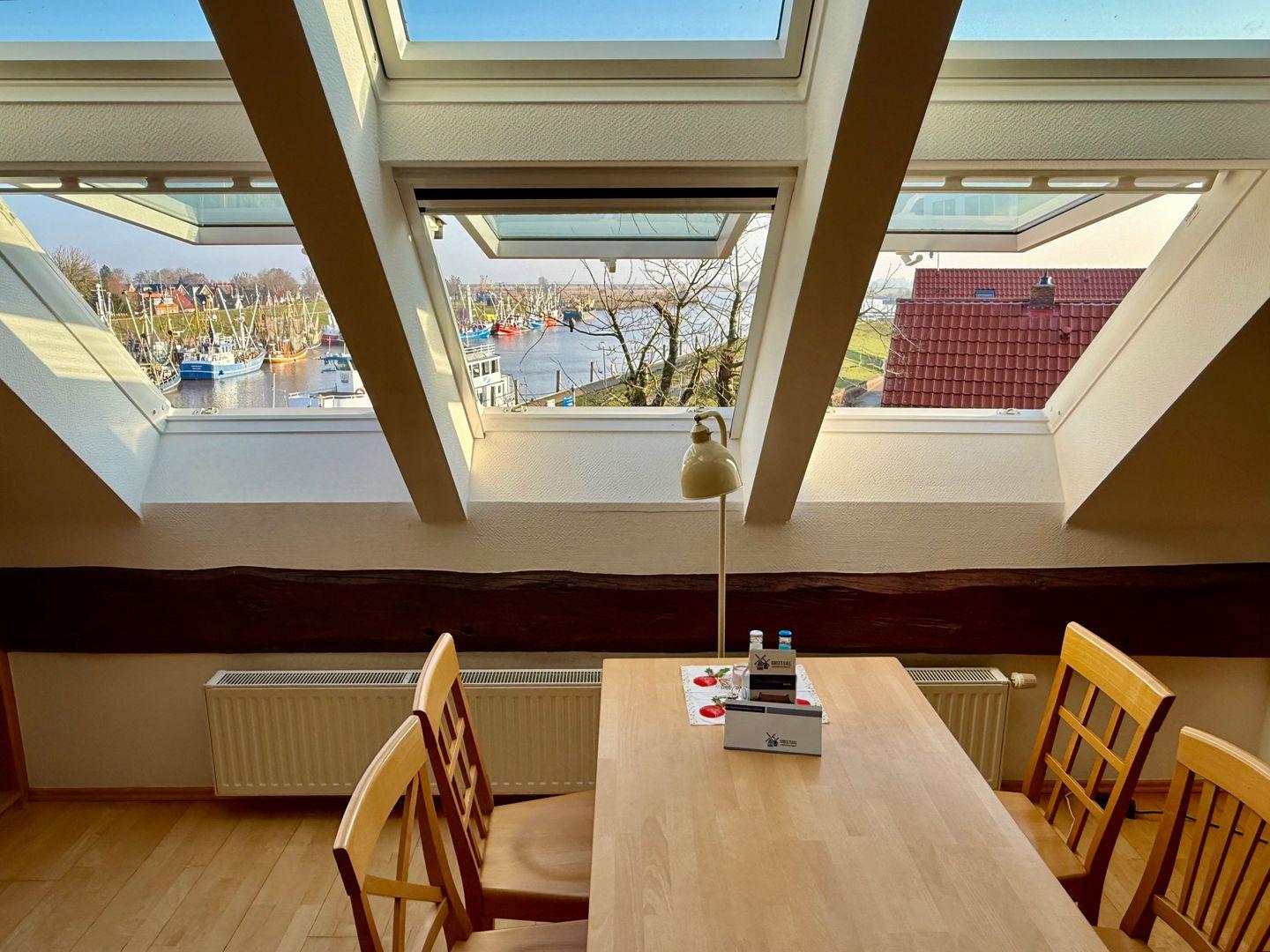 Die ruhige, komfortable Ferienwohnung „Woquard“ liegt oben zur Deichseite und bietet Platz für bis zu 4 Personen. Genießen Sie den Blick auf den Kutterhafen und die Hafenausfahrt.