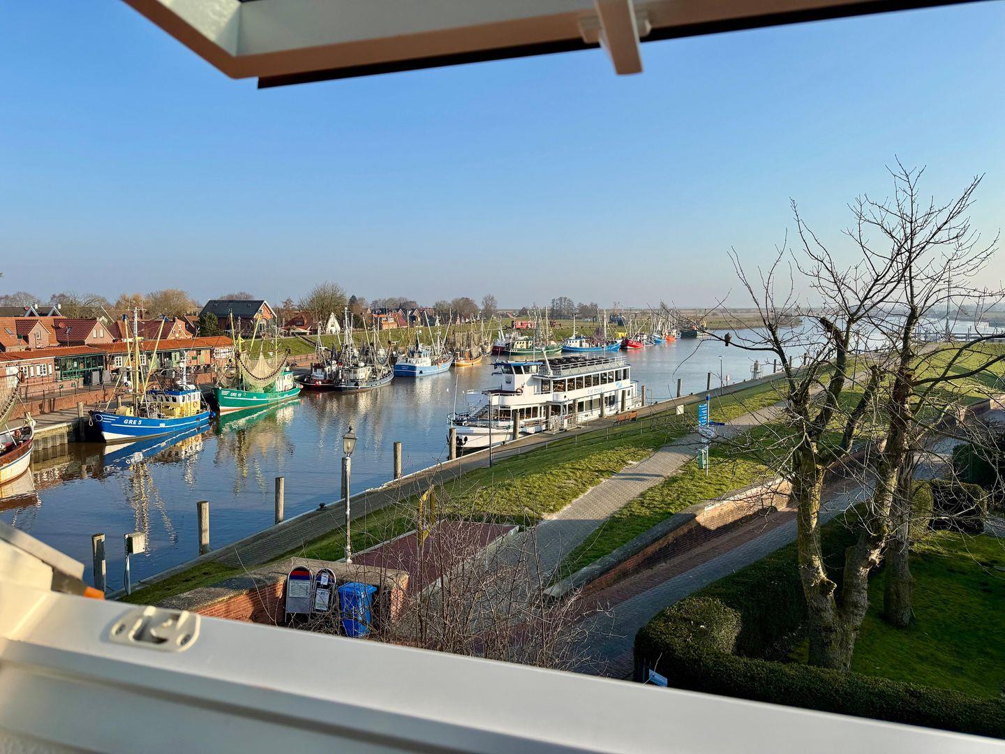 Ferienwohnung Woquard im Amtmannshaus bietet charmanten Komfort am Greetsieler Hafen mit Blick auf den Kutterhafen.