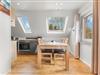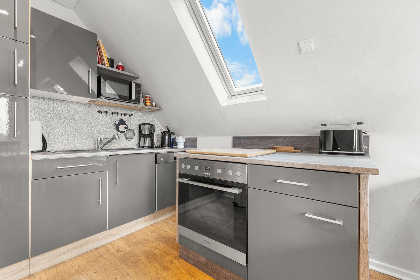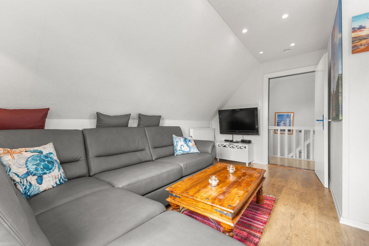 Über eine Treppe gelangen Sie in die Wohnung, wo Sie ein heller und offener Wohnbereich erwartet. Eine gemütliche Sofaecke, eine einladende Essecke sowie eine voll ausgestattete Küche bieten alles, was Sie für einen entspannten Aufenthalt benötigen.