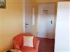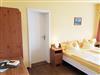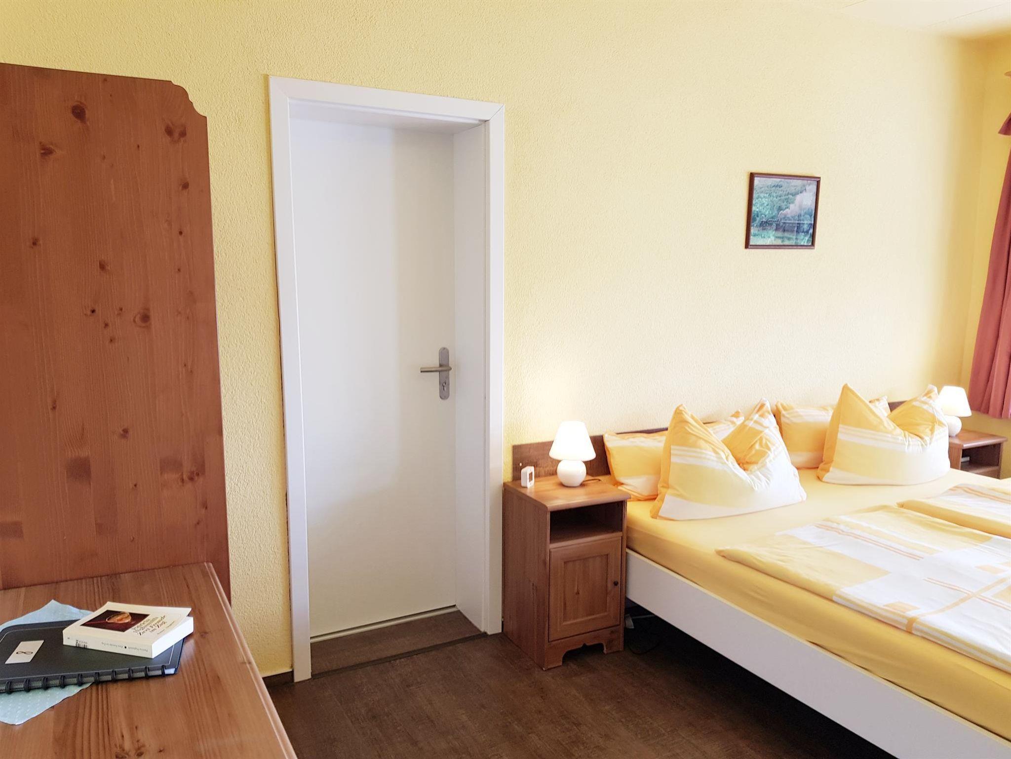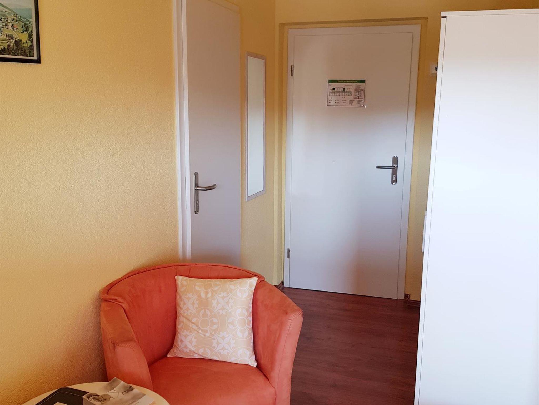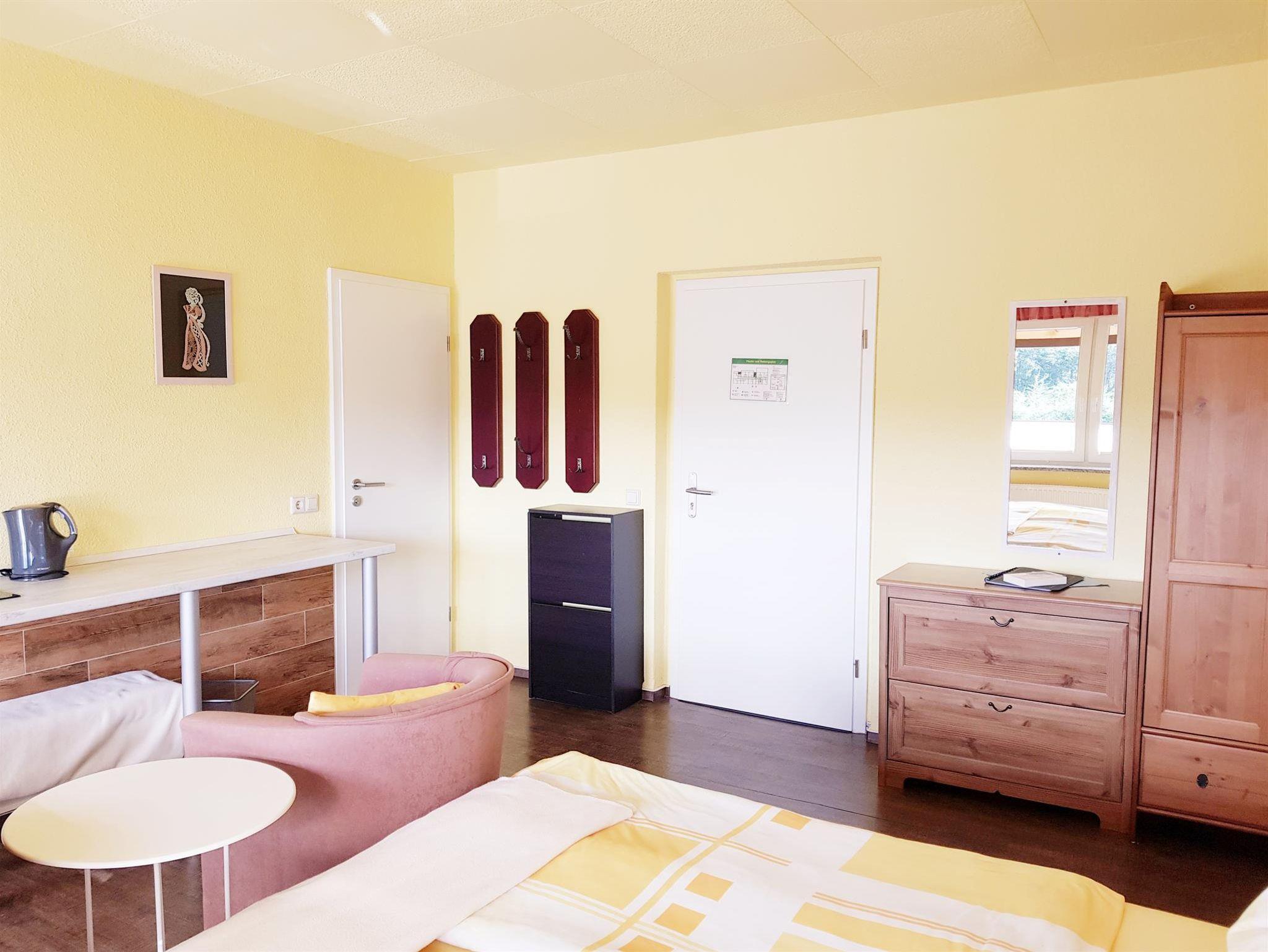 Das Familienzimmer (39 qm; erste Etage; hofseitig - ohne Bahnblick!) besteht aus zwei Räumen mit jeweils eigenen Bädern und zwei Zugängen zum Balkon. Durch eine abschließbare Verbindungstür wird das kleinere, 14 qm große Zimmer mit dem 1,40 m breiten, bezogenen Bett vom größeren Zimmer abgetrennt. Hier gibt es auch eine kleinen Kühlschrank. Im größeren der beiden Zimmer (Bettbreite: 1,80 m; Betten bezogen) befindet sich die Kochnische mit zwei Herdplatten, Kühlschrank mit Gefrierfach, Kaffeemaschine, Wasserkocher, Toaster, Geschirr, Kochgeschirr und Besteck. Es gibt einen ausziehbaren Esstisch mit zwei Stühlen und eine Sitzbank. In beiden Zimmern befinden sich ein Flachbild-TV, ein kleiner Tisch und zwei Sessel. In den Bädern gibt es Dusche/WC, Handtücher, Fön, Kosmetiktücher, Schminkspiegel und flüssige Handseife. Im Bad des größeren Zimmers gibt es zusätzlich noch einen Handtuchheizkörper.