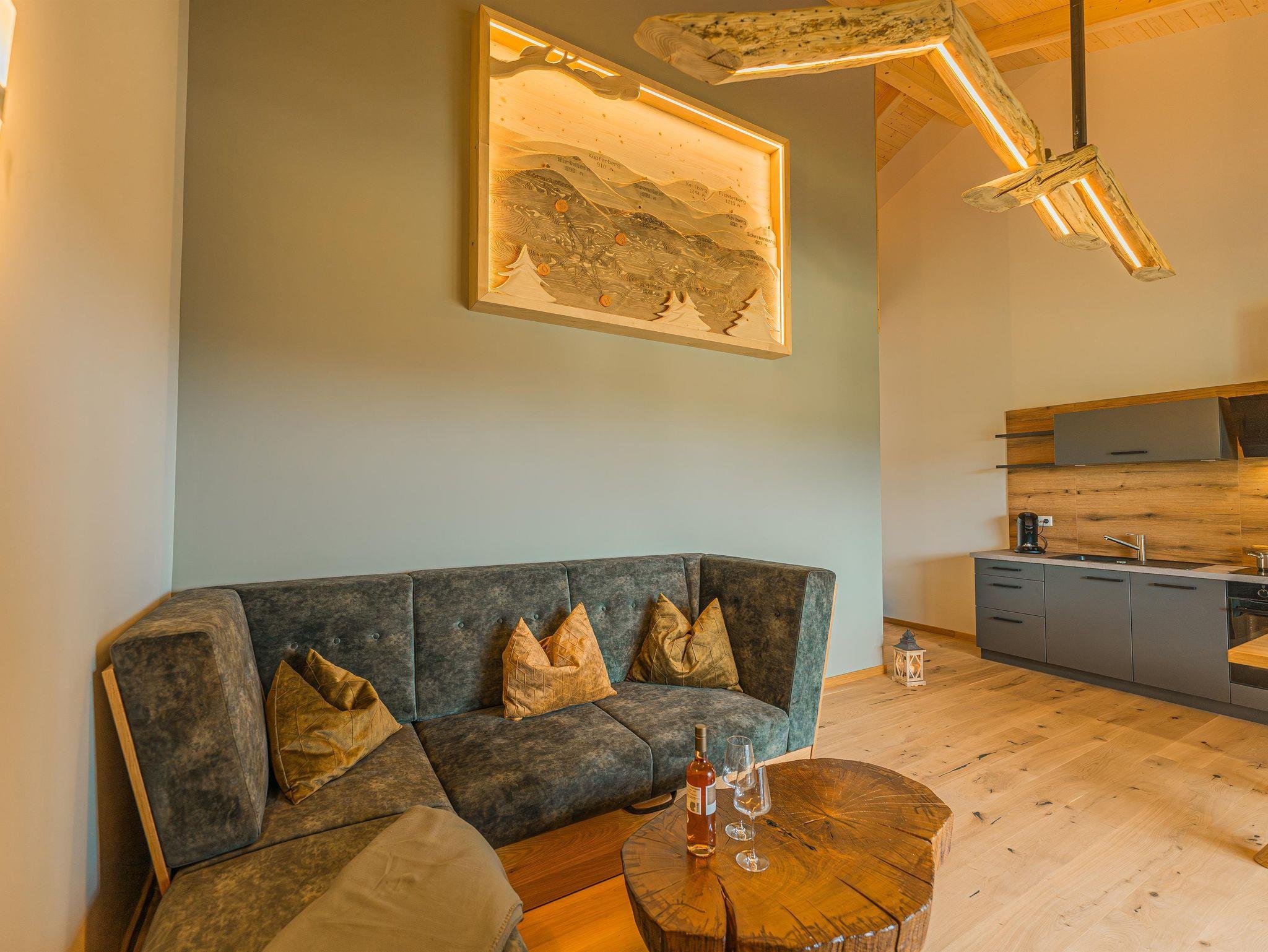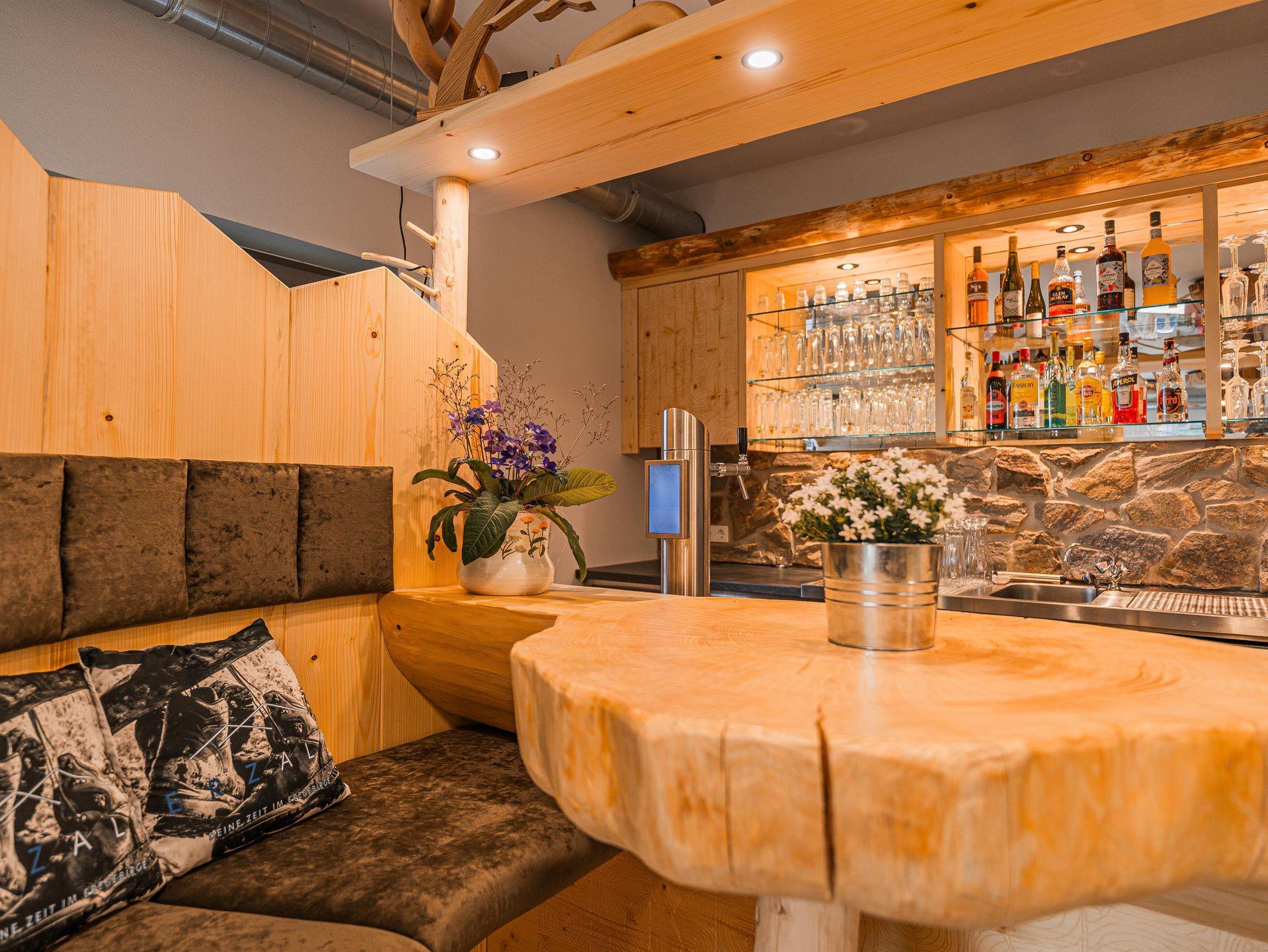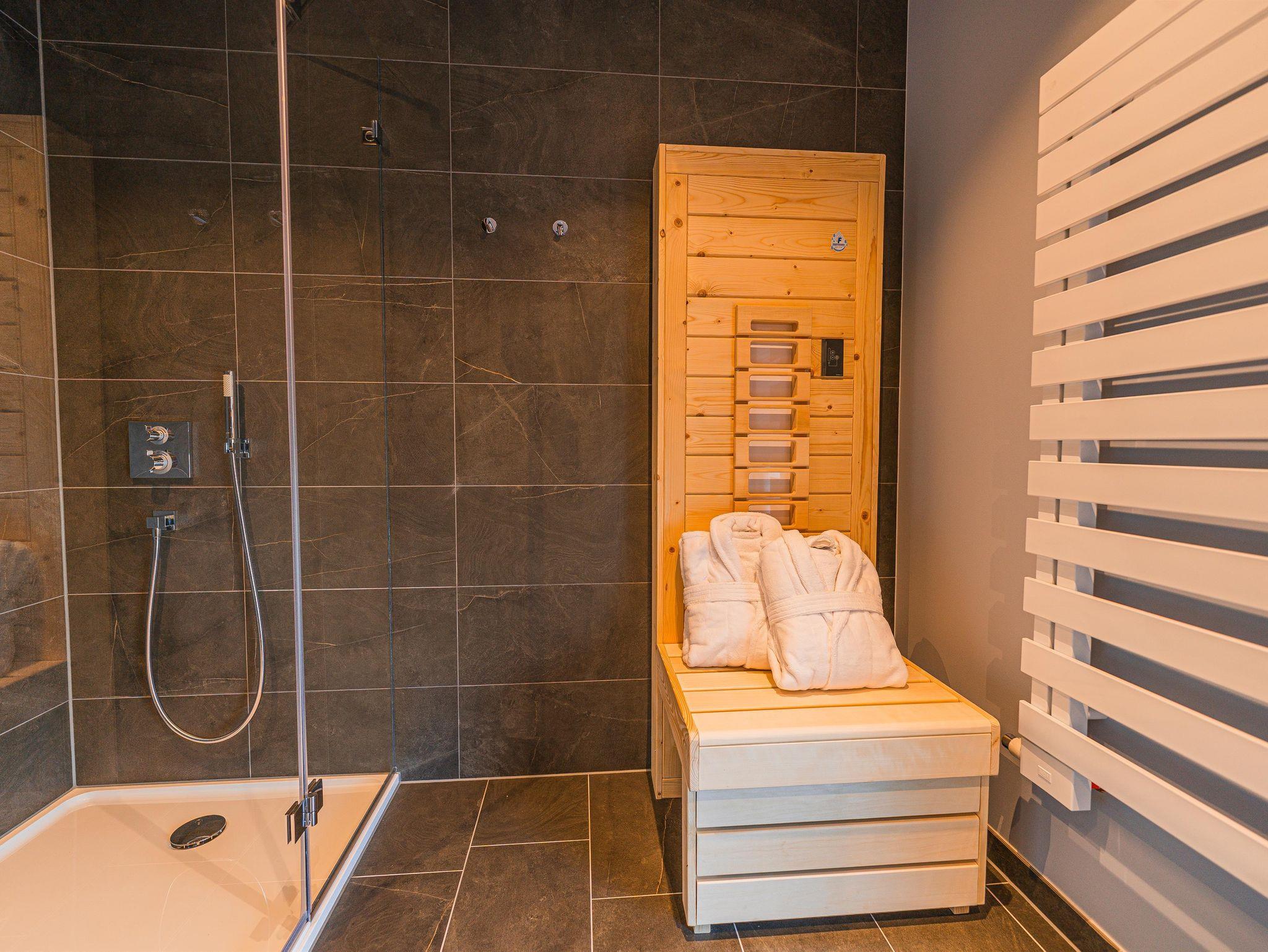 Noch mehr Entspannung findest du in einer der 3 privaten Biosaunas in den großen Wohnungen oder im separaten Erzalmhaus im Wellnessbereich Stollengrotte mit gemütlichem Saunabereich, eigenem Ruheraum und Außenbereich.