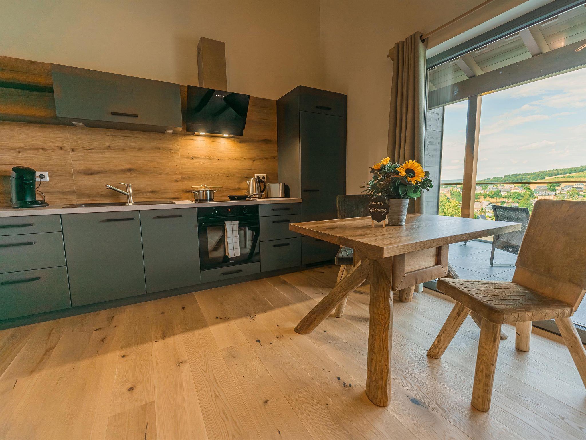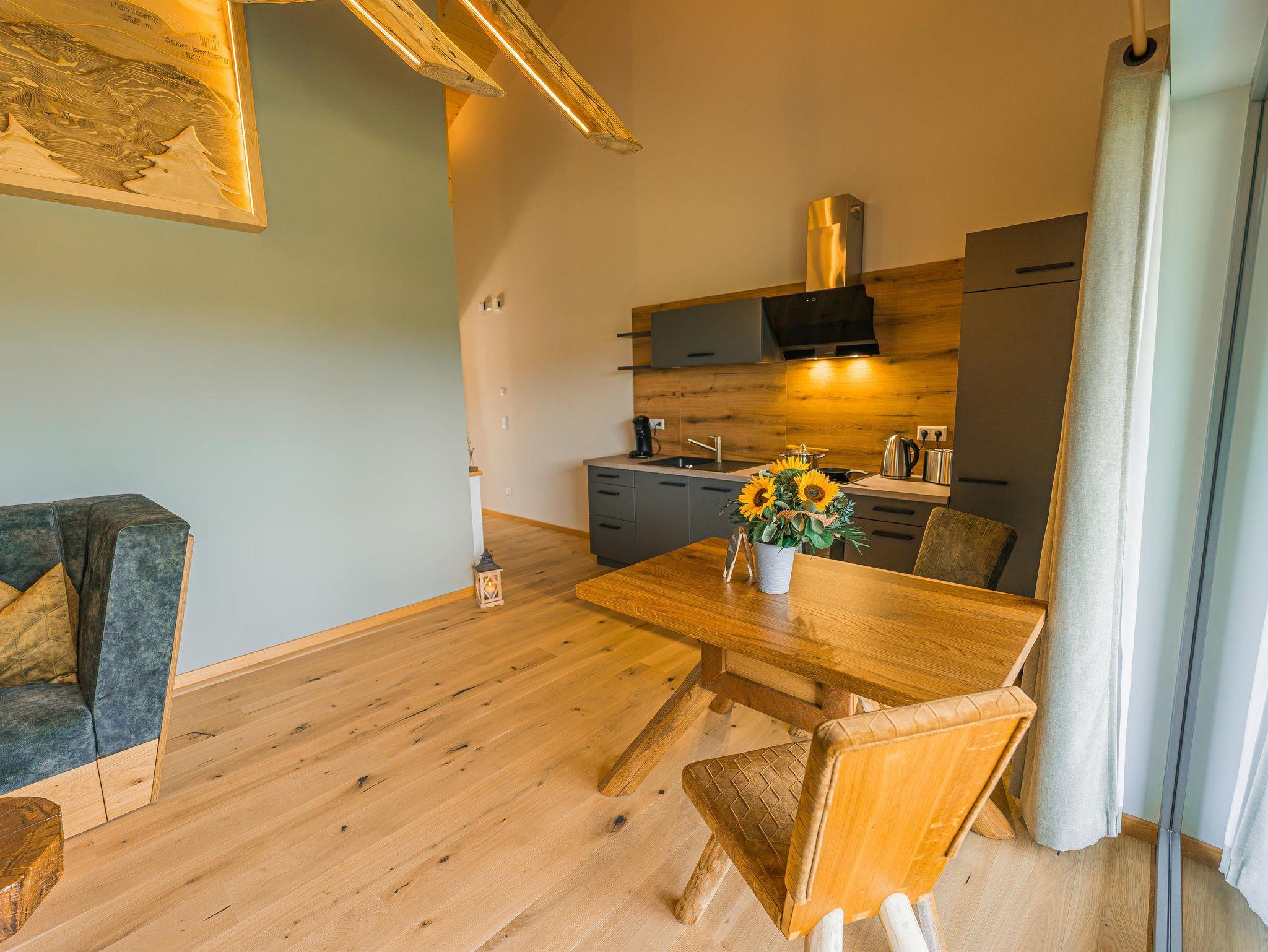 Neben einem Schlafzimmer mit Doppelbett, steht unseren Gästen ein gemütlicher Wohn-Essbereich mit einer modern eingerichteten Küche, sowie gemütlichen Couch/TV Ecke zu Verfügung. Das Bad ist mit einer Regendusche, Waschbecken und einem Infrarotsitz ausgestattet. Das WC ist separat.