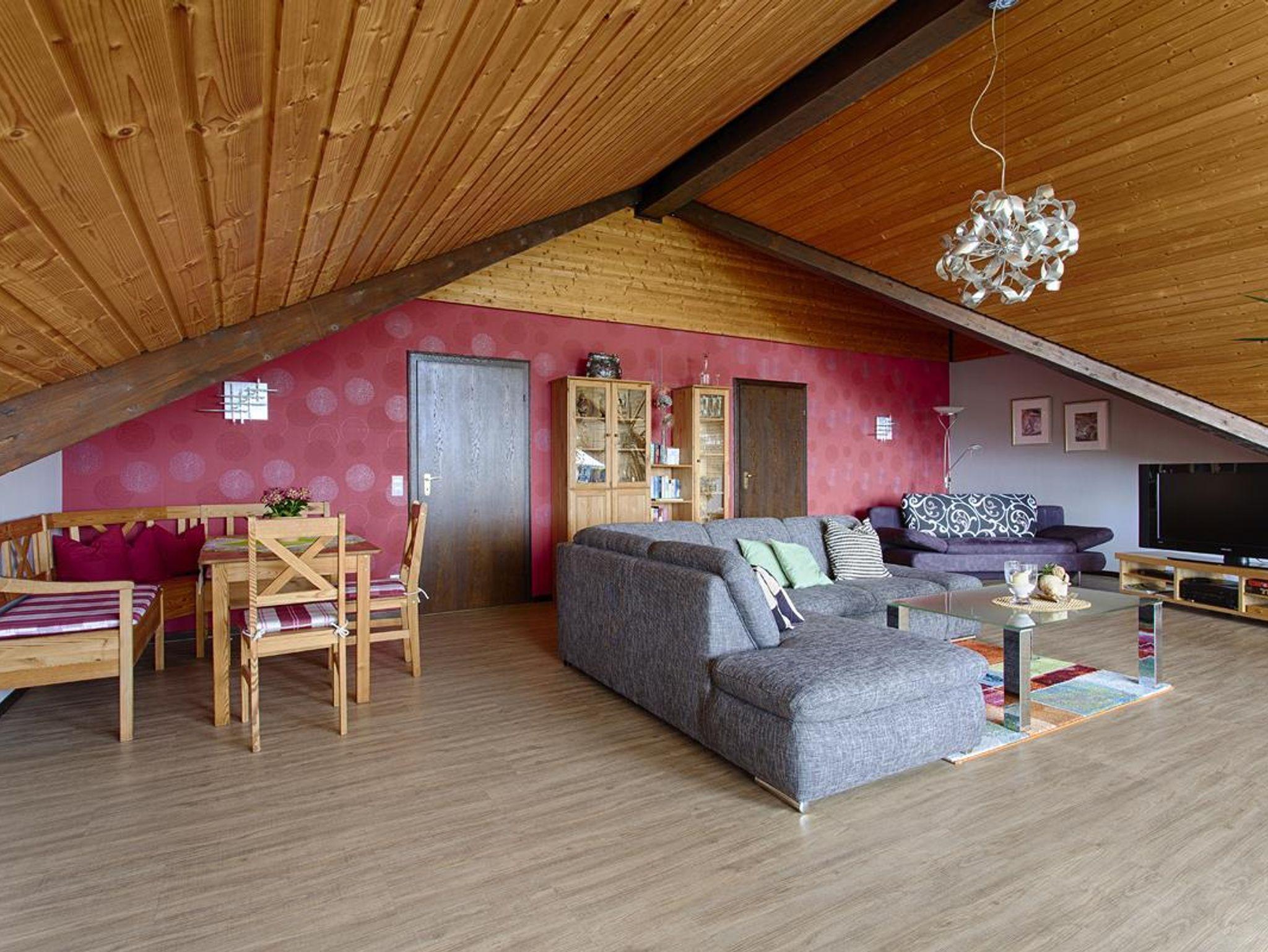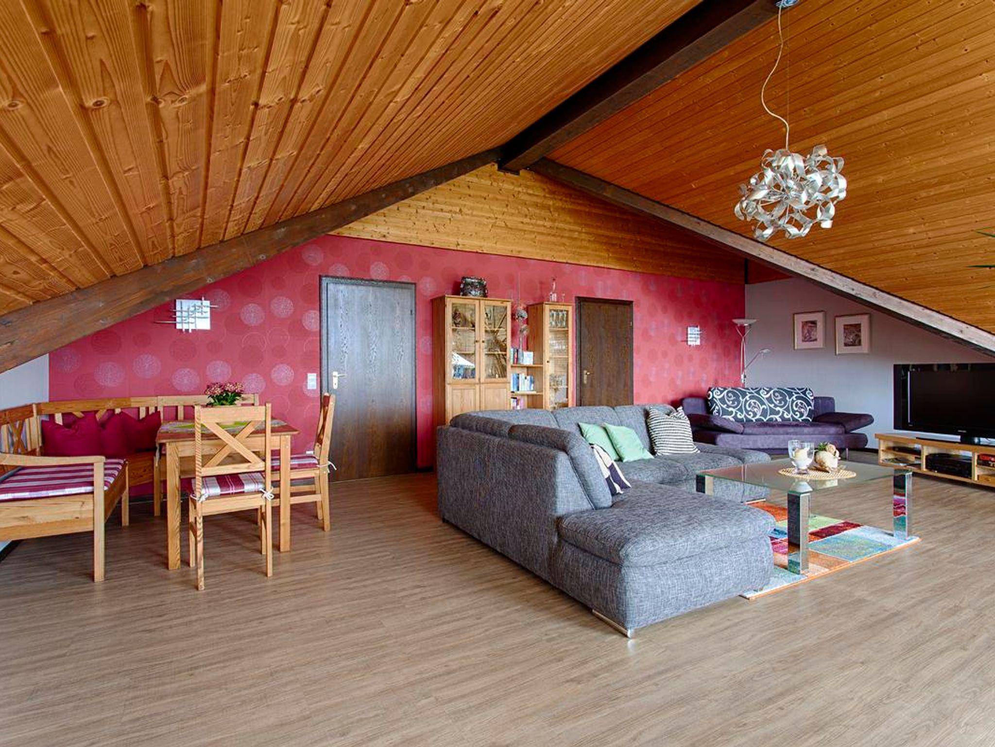 ist von großen Waldgebieten umgeben, die zu ausgedehnten Wanderungen einladen. Unsere 90 qm große, liebevoll eingerichtete Nichtraucher-Ferienwohnung liegt im gemütlichen Dachgeschoss und hat einen überdachten Balkon von 16 qm. Sie verfügt über 2 Schlafzimmer, eins mit einem 2 x 2m großem Doppelbett, eins mit einem 2 x 1,40m Bett. Dusche/Wanne und WC befinden sich im separaten Bad. Im Studiozimmer von 46 qm mit SAT-TV, Radio und gemütlichen Sesseln befindet sich ein ausziehbares 1,40 m breites Schlafsofa. W-Lan ist natürlich vorhanden.