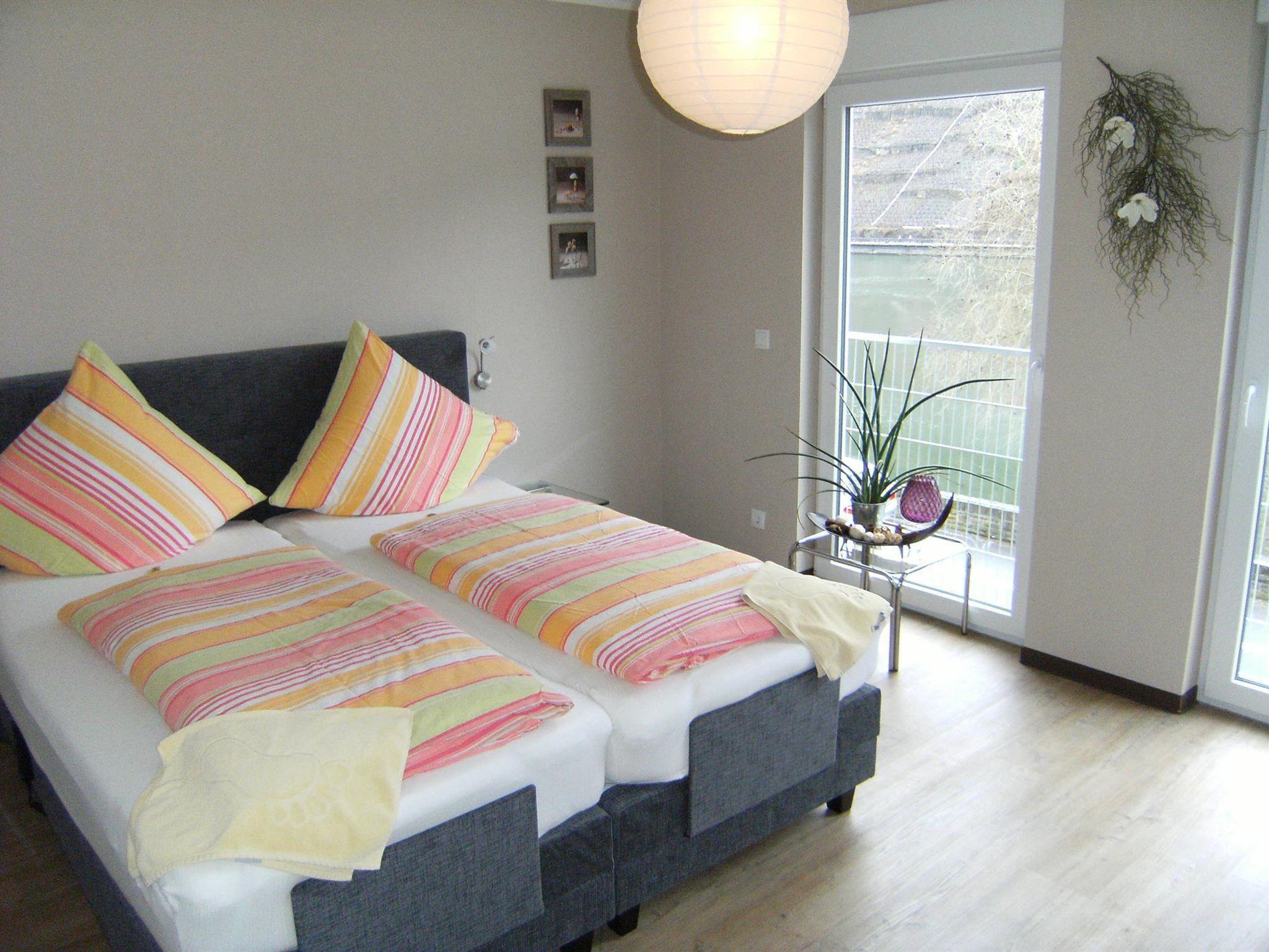 Die Schlafzimmer, zur Mosel als auch zum Innenhof ausgerichtet, sind jeweils mit Boxspringbetten und einem weiteren TV ausgestattet. Ebenfalls befindet sich dort ein Safe. Unser großes, neues und modernes Badezimmer mit begehbarer Dusche bietet alles, was das Herz begehrt. Zur Ausstattung gehört neben einem beheizten Handtuchwärmer, ein Kosmetikspiegel, Kosmetikartikel und ein Fön.