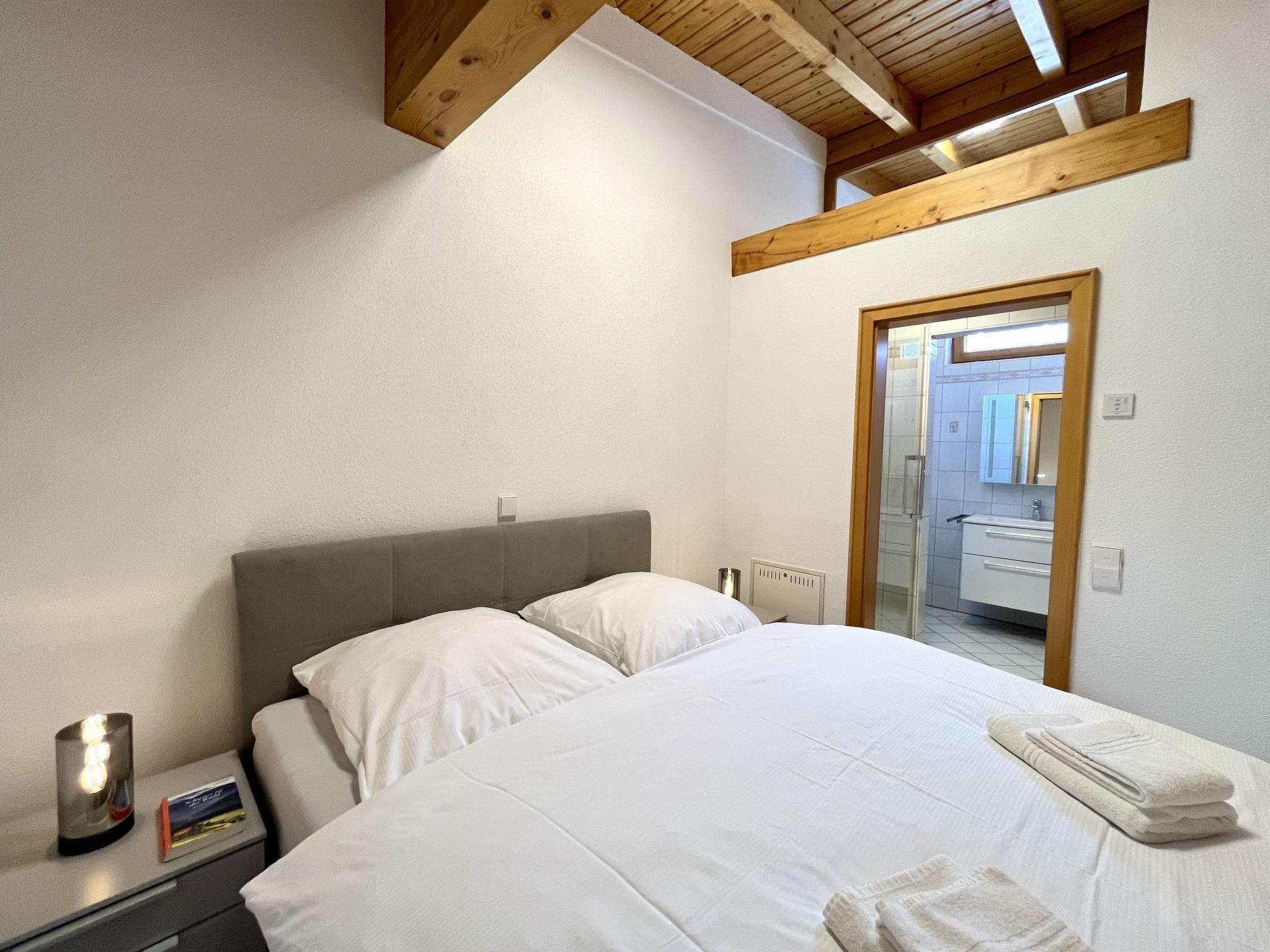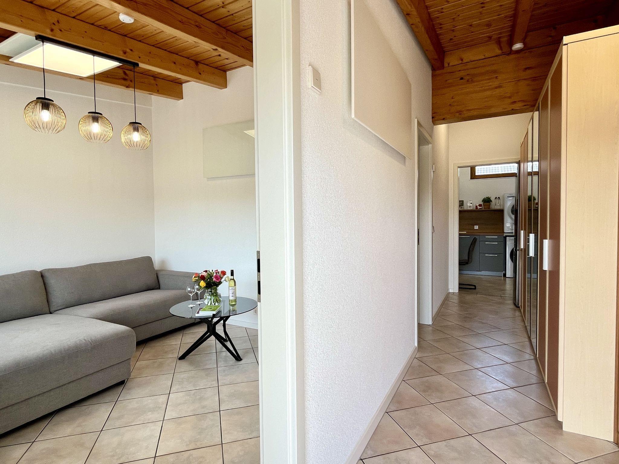"Feingeist", 2-Zimmer-Wohnung 55 m2, im erhöhten Erdgeschoss. Hell, vollständig renoviert im Jahre 2025, schön und modern eingerichtet: Eingang. Wohn-/Schlafzimmer mit 1 Diwanbett (130 cm, Länge 200 cm), Sat-TV (Flachbildschirm). 1 Doppelzimmer mit 1 Doppelbett (160 cm, Länge 200 cm), Sat-TV (Flachbildschirm). Küche (Backofen, Geschirrspüler, 4 Glaskeramikplatten, Toaster, Wasserkocher, elektrische Kaffeemaschine) mit kleinem Esstisch. Dusche/WC. E-Heizung, Fussbodenheizung. Solarstrom. Terrassenmöbel, Sitzplatz. Zur Verfügung: Waschmaschine, Wäschetrockner, Haartrockner. Internet (WLAN, gratis). Parkplatz beim Haus. Bitte beachten: Nichtraucher-Unterkunft. Eigener Eingang, Rauchmelder, Feuerlöscher.