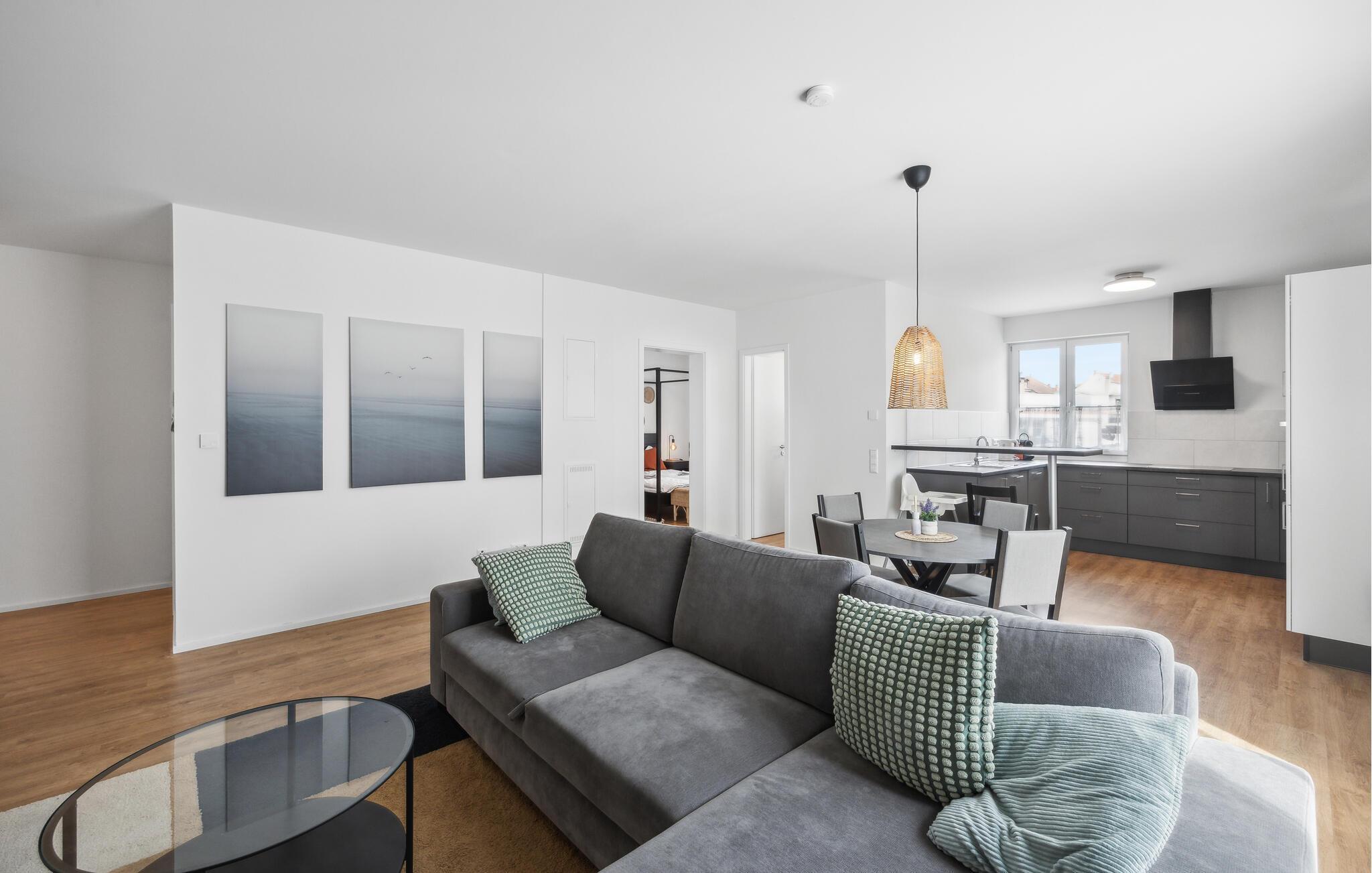 Freuen Sie sich auf Ihren Urlaub in Lörrach in dieser stilvollen Ferienwohnung. Von der geräumigen, modernen Küche über den zentral platzierten bis zum bequemen Sofabereich mit Fernseher finden Sie in dieser Wohnung alles, was Sie für einen gelungenen Urlaub im Dreiländereck benötigen. Frühstücken Sie morgens in aller Ruhe und planen Sie Ihren Tag. Ausflüge in Deutschland, der Schweiz oder in Frankreich sind möglich. Oder vielleicht schauen Sie zunächst erst einen lustigen Film auf dem Sofa oder spielen ein Brettspiel. In dieser einladenden Atmosphäre, die zum Entspannen einlädt, werden Sie sich wohlfühlen.