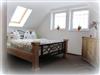 Wohn-/ Schlafzimmer mit einem Doppelbett im Schlafbereich. Das Haus ist ganzjährig nutzbar, da es über eine Zentralheizung und im gesamten EG über eine Fußbodenheizung