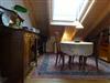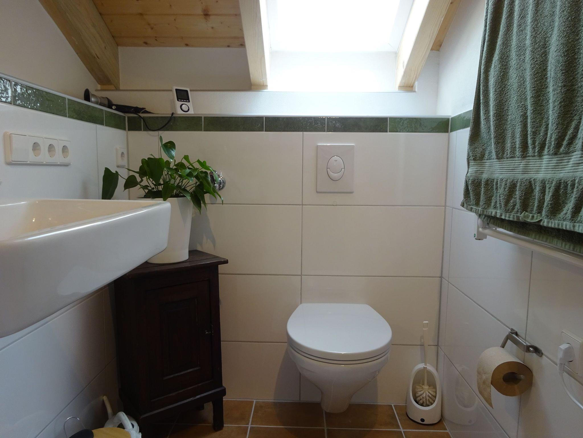 Nur sieben Stufen führen zur Wohnung im ersten Obergeschoss. Durch das Dachfenster eröffnet sich nachts ein Blick auf den Sternenhimmel, tagsüber schweift der Blick durchs Giebelfenster über Wiesen und Wälder. Vor dem Haus lädt eine kleine Terrasse mit Tisch und Stühlen zum Verweilen ein mitten in einer Sackgasse mit fast ländlichem Charakter.