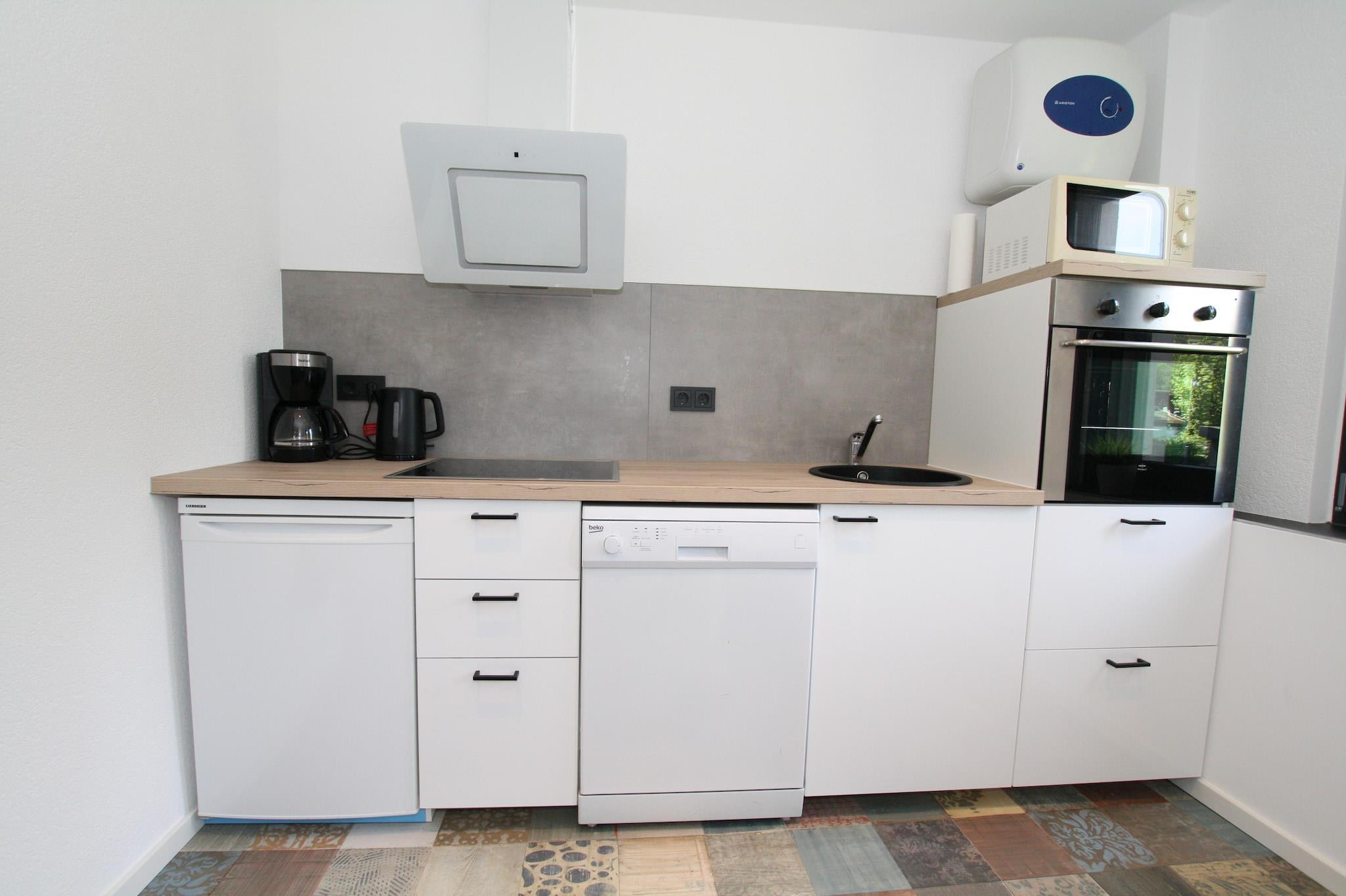 Parterre: (offene Küche(Esstisch, Kochplatte(Ceranfeld), Wasserkocher, Toaster, Kaffeemaschine, Backofen, Mikrowelle, Spülmaschine, Kühl-/Gefrierkombination), Wohn-/Schlafzimmer(Schlafcouch 1 Pers., Doppelbett, TV(Satellit), DVD-Spieler, Radio, CD-Spieler), Badezimmer(Dusche, Toilette, Föhn)) Grill, Heizung(Gas), Terrasse, Gartenmöbel, Parkplatz