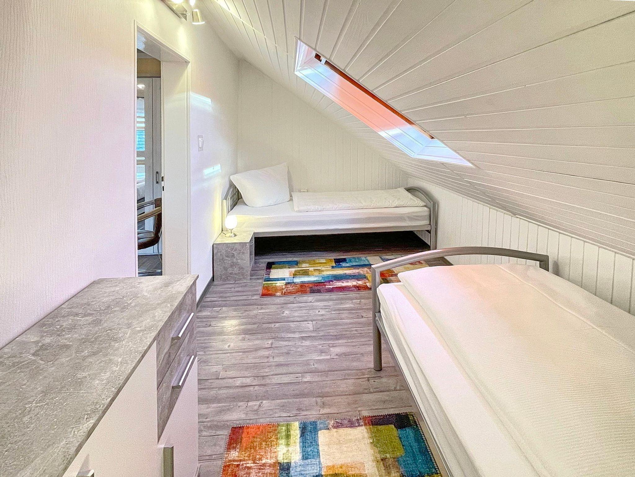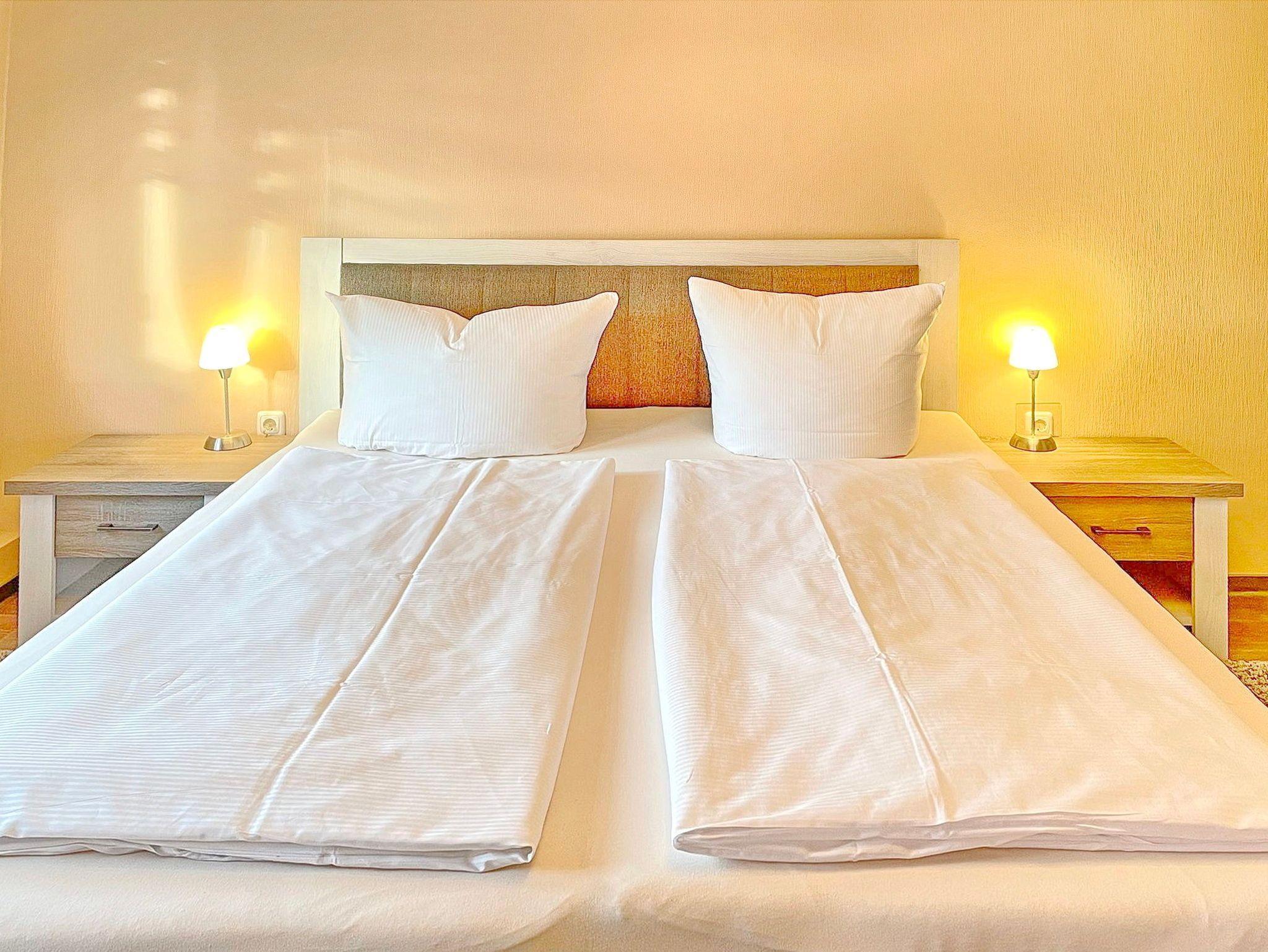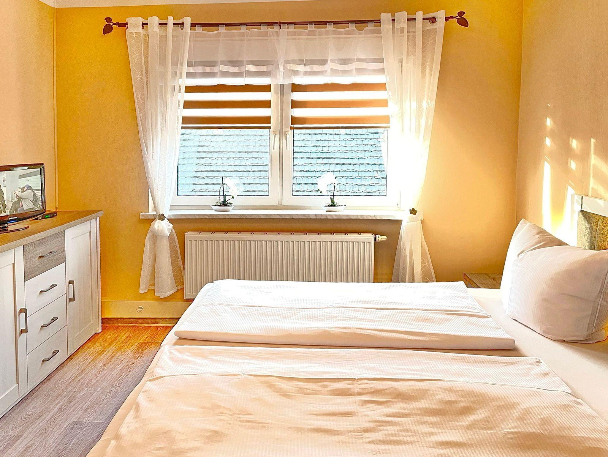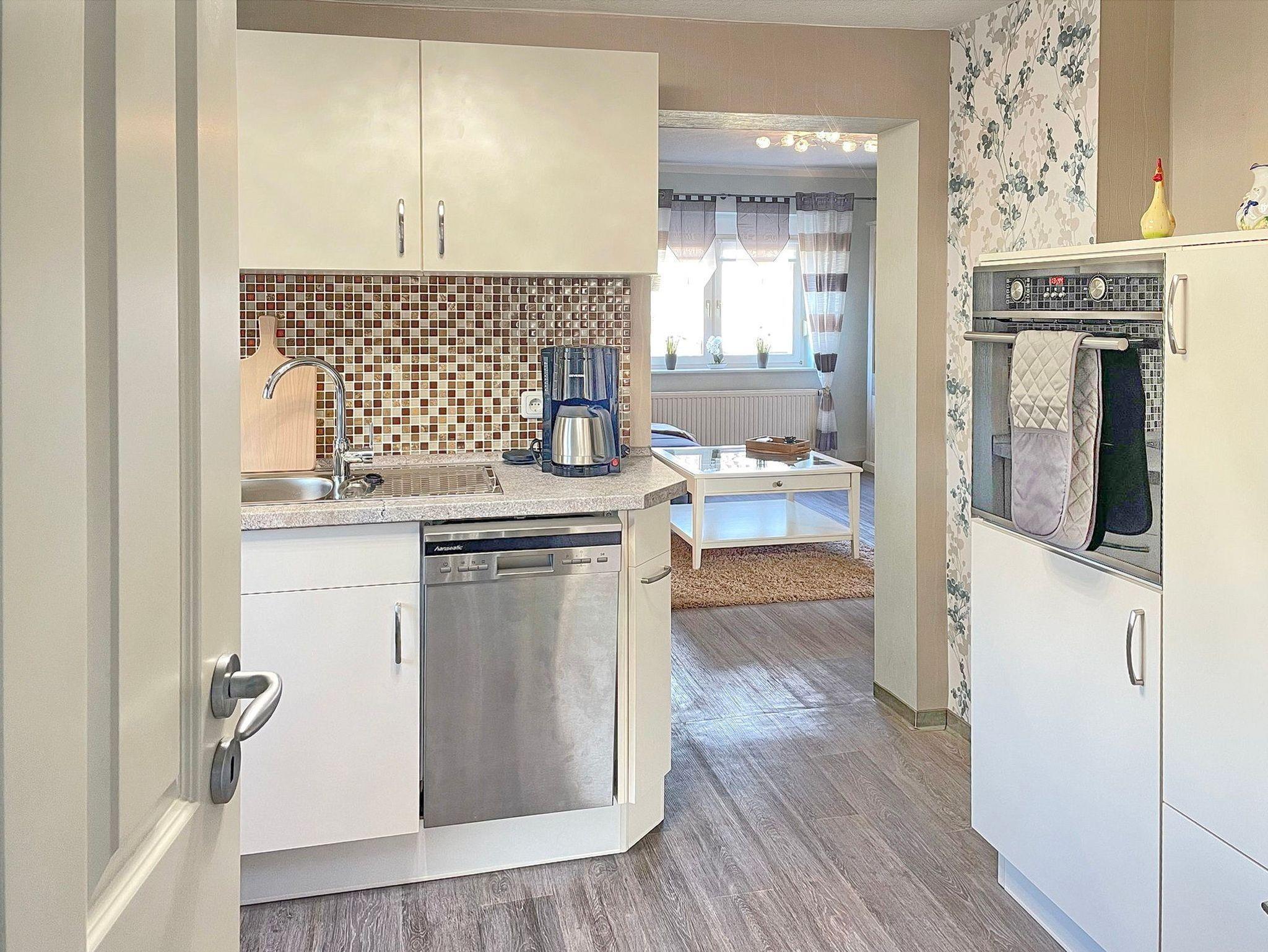 Die ca. 61 qm große Vier-Raum-Wohnung ist ideal ausgestattet für eine vierköpfige Familie. In der voll ausgestatteten Küche befindet sich ein Esstisch der ausreichend Platz für 4 Personen bietet. Diese moderne Einbauküche, bietet Ihnen ein 4 Platten Cerankochfeld, ein Backofen, ein Geschirrspüler, ein Kühlschrank mit Gefrierfach, ein Wasserkocher, ein Toaster und eine Kaffeemaschine. Von dort aus gelangen Sie ins Schlafzimmer mit einem großzügigen Doppelbett (1,80 x 2,00 m), einem großen Kleiderschrank, einer Kommode mit Flachbild-TV. Das Kinderzimmer ist diesem Raum angeschlossen mit einer Trennwand und Tür. Es hat zwei extra stehende Einzelbetten und genug Stauraum für Spielsachen. Das Wohnzimmer der Ferienwohnung ist mit einer XXL gemütlichen Couch ausgestattet, es ist sehr geräumig. Zur Unterhaltung bietet das Wohnzimmer einen Flachbild TV. Im Badezimmer befinden sich eine Dusche, ein WC, Waschtisch mit einem beleuchteten Spiegel und einer Waschmaschine zur kostenfreien Nutzung. Des Weiteren sind ein Föhn sowie Handtuchtrockner vorhanden.