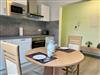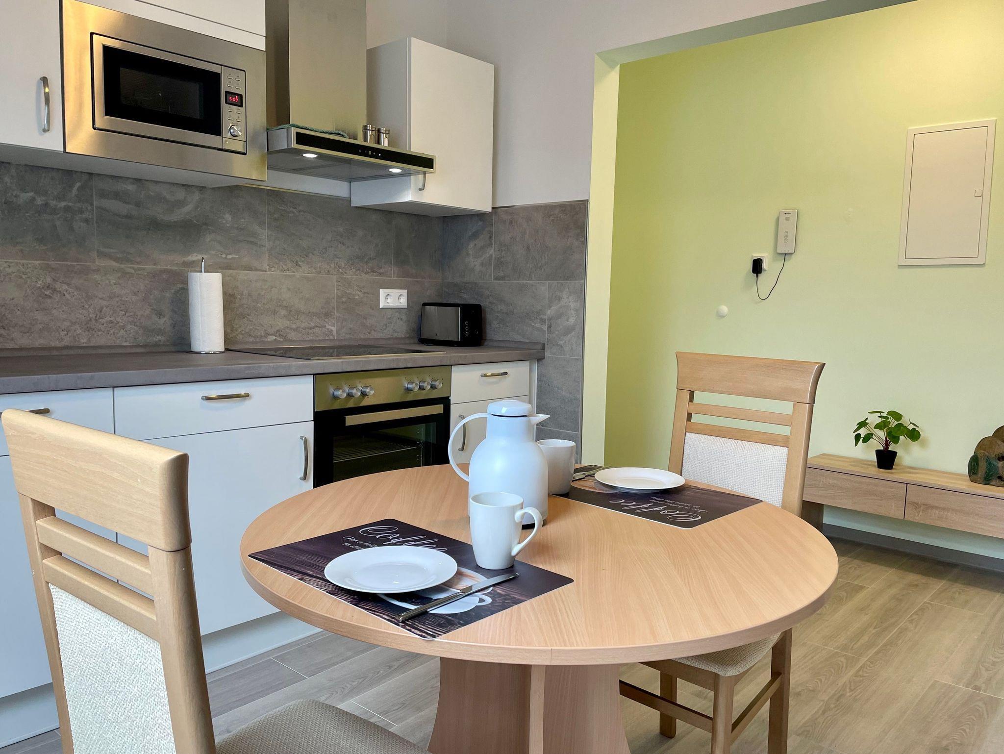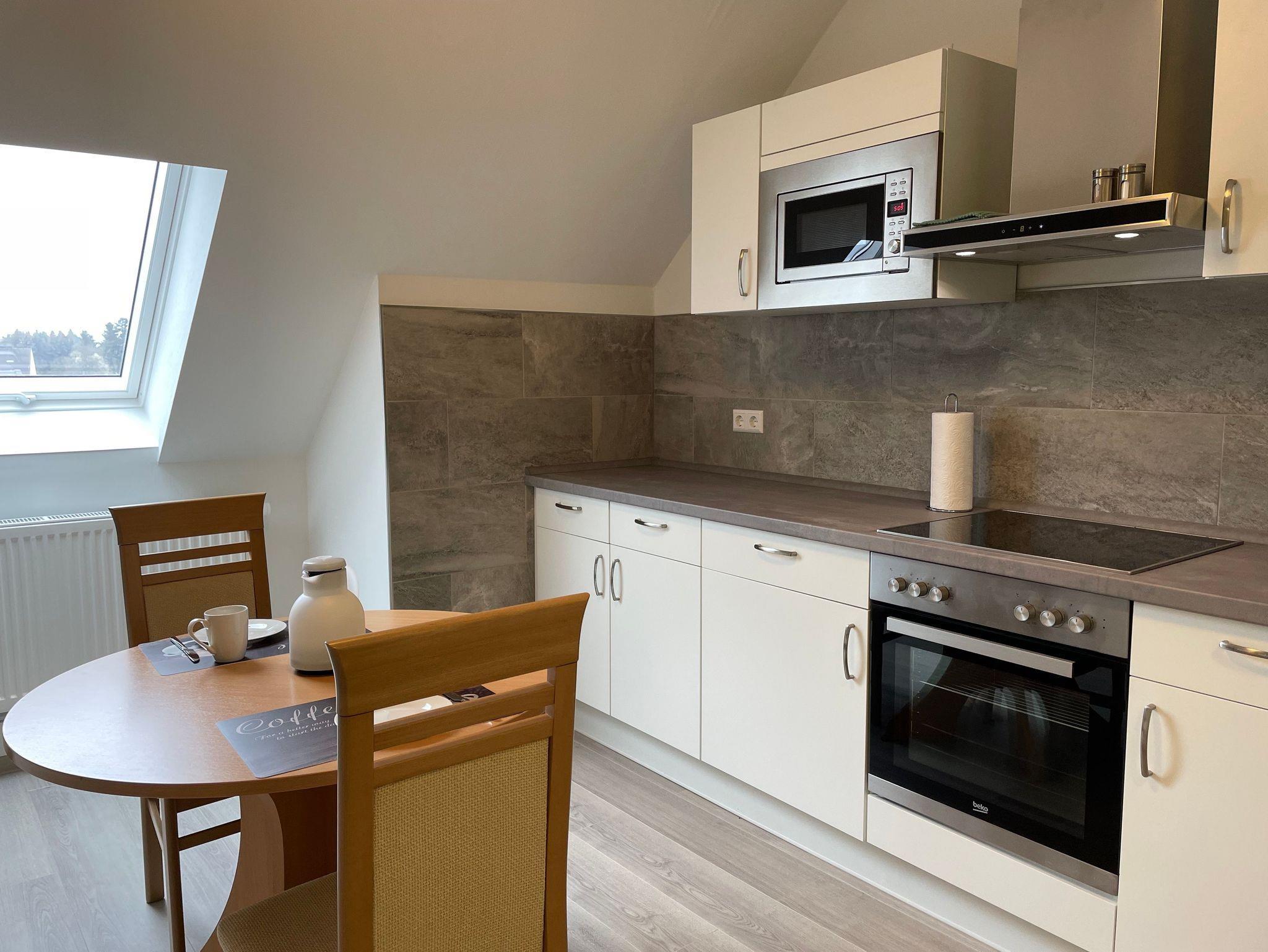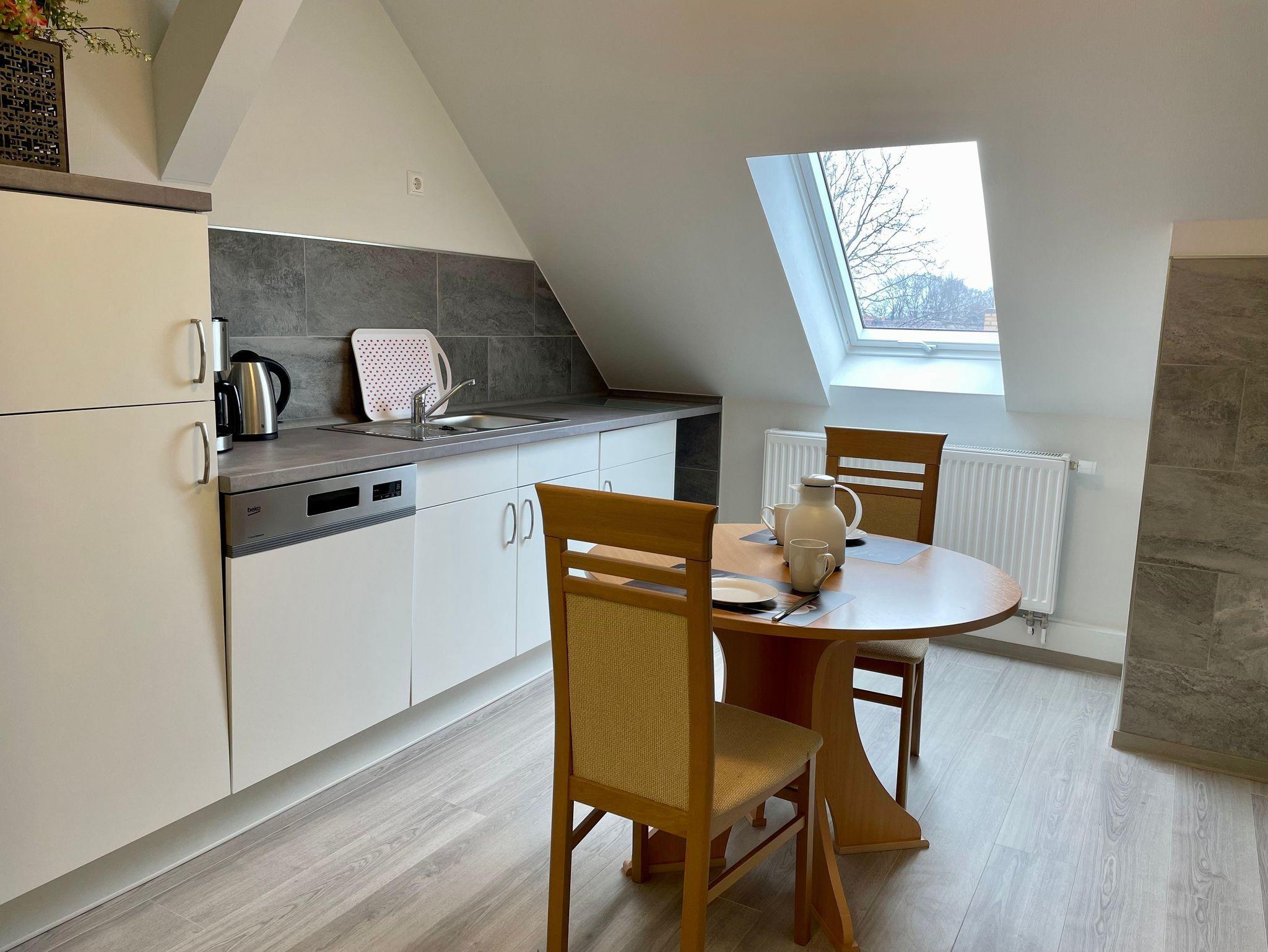 Die helle und moderne Küche verfügt über eine Kaffeemaschine, einen Toaster, einer Mikrowelle und einen Koch/- und Backofen. Ein moderner Geschirrspüler ist als Küchenhelfer dienlich. In der Mitte der Küche befinden sich Tisch und Stühle.