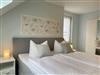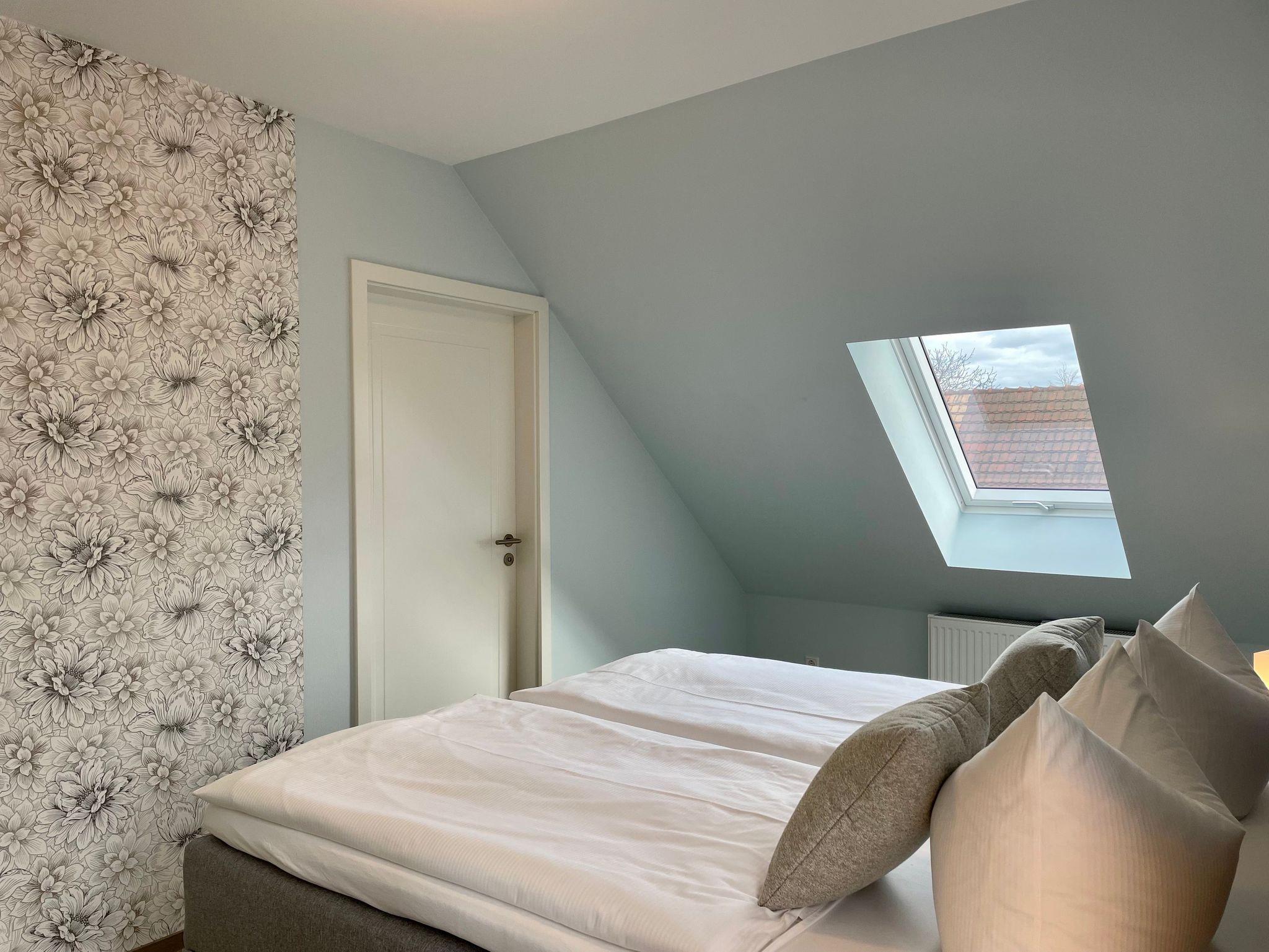 Das separate Schlafzimmer hat ein Dachfenster zur beruhigten Straßenseite und ein Fenster zur Giebelseite des Hauses. Ausgestattet ist das Zimmer mit einem hochwertigen großen Boxspringbett, Kissen und kuscheligen Decken.