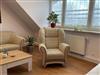 Das gemütliche Wohnzimmer ist mit einem Zweisitzer und einem großen Ohrensessel ausgestattet. Im Wohnbereich befindet sich ein Sideboard mit einem großen Flachbildschirm. Ein Schreibtsich, in der Ecke am Fenster, ist gut für eine Workation platziert.