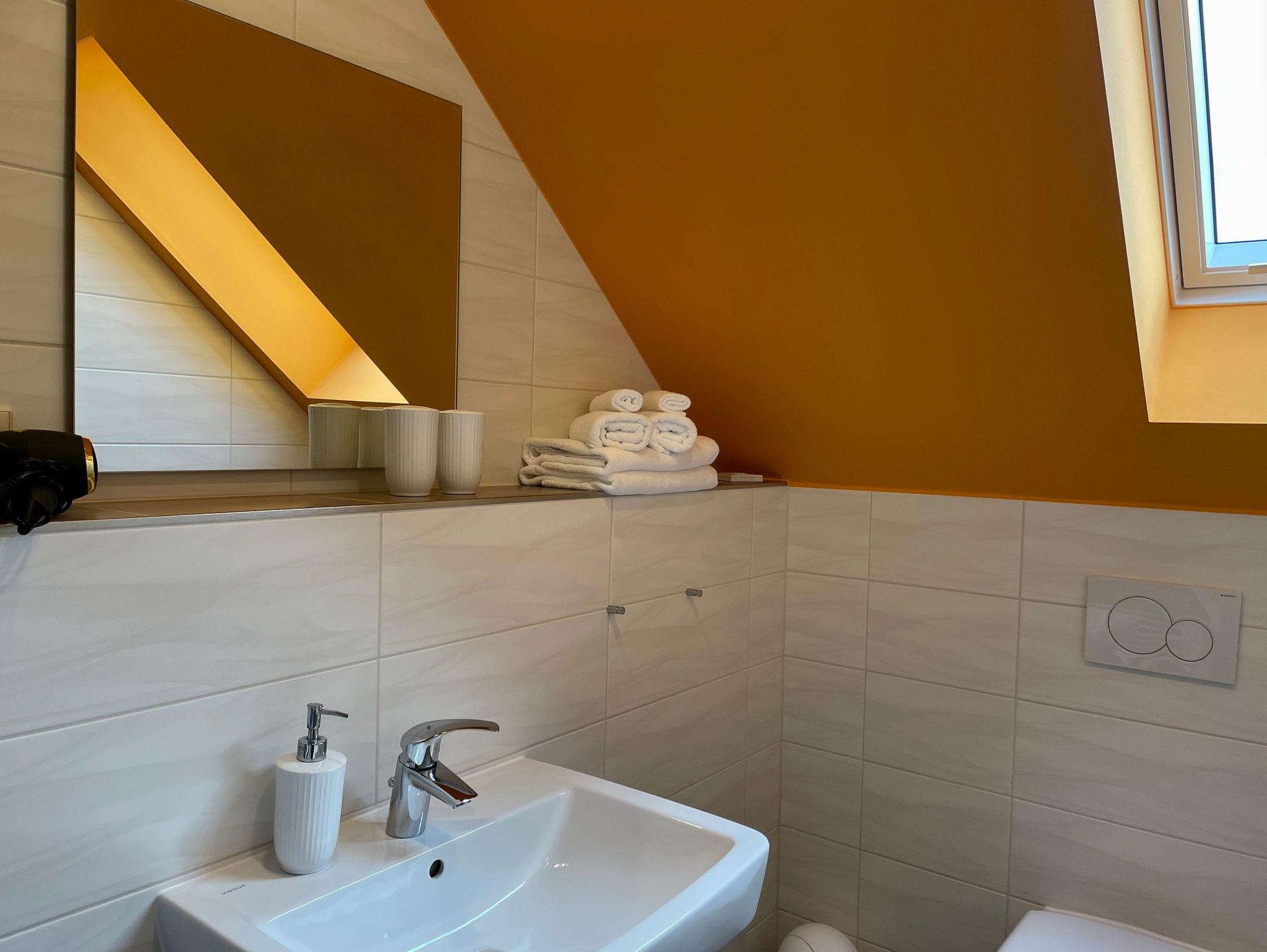 Das separate Bad mit Dusche/ WC schließt sich dem Schlafzimmer an und hat eine ebenerdige große Dusche. Das helle Badezimmer hält Handtücher, Gästehandtücher, einen Föhn und Seife für Sie bereit. Es hat ein Fenster und ist verdunkelbar.