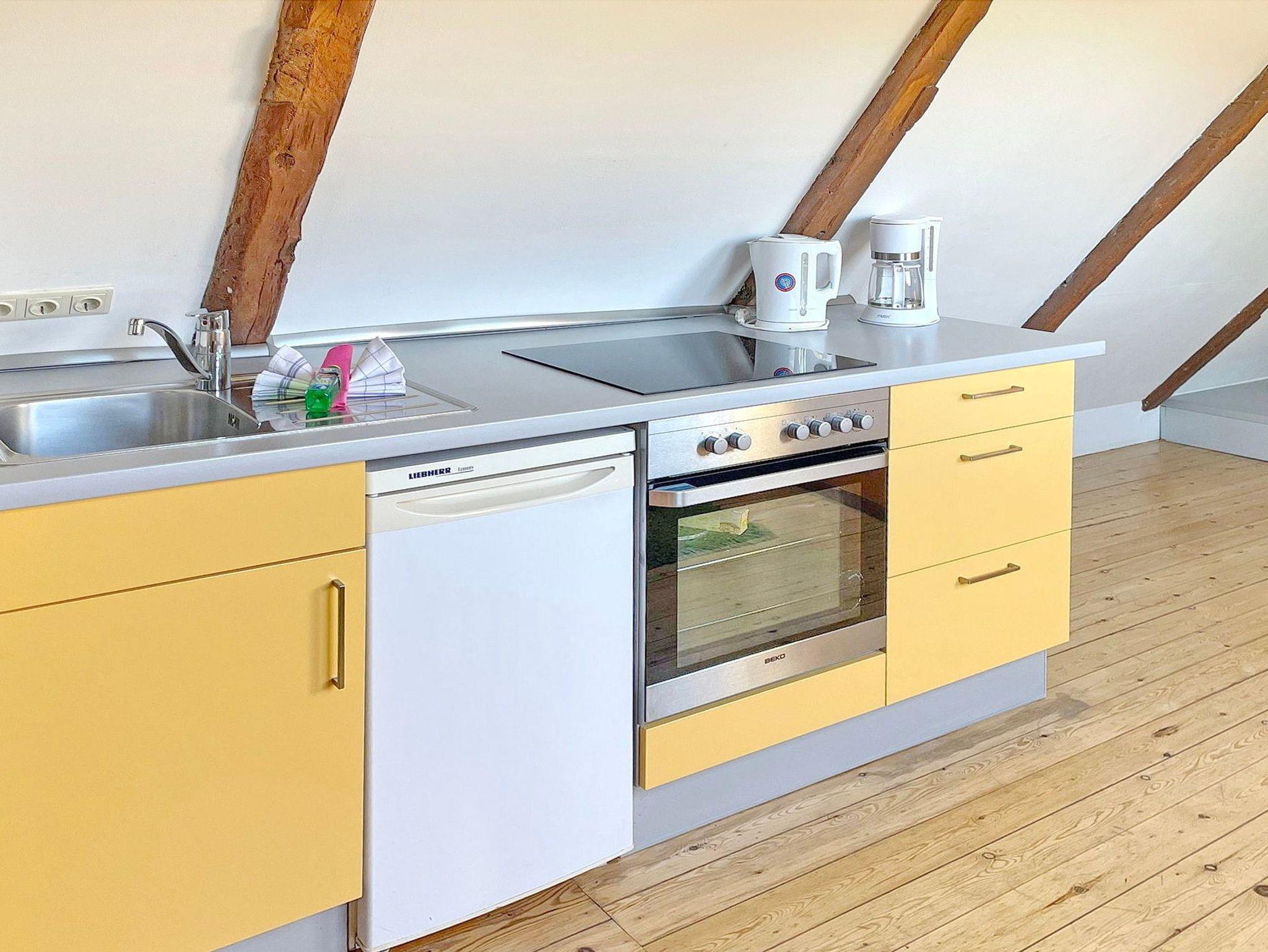 Die Wohnung 2 Monde befindet sich im Dachgeschoss. Sie gleicht einem Studioapartment mit Schlaf-, Wohn-, Küchenbereich. Das Bad ist separat mit Dusche und WC.