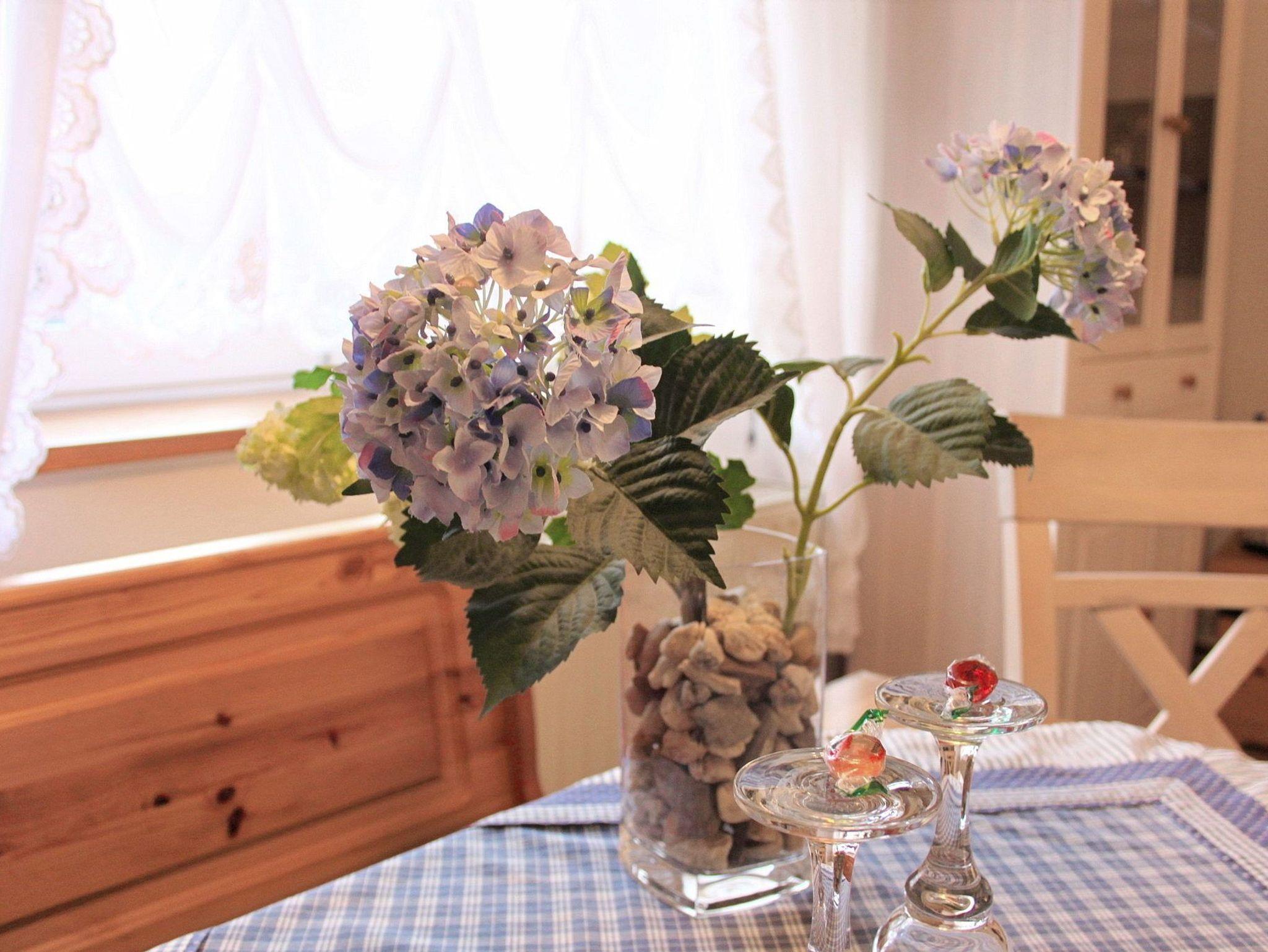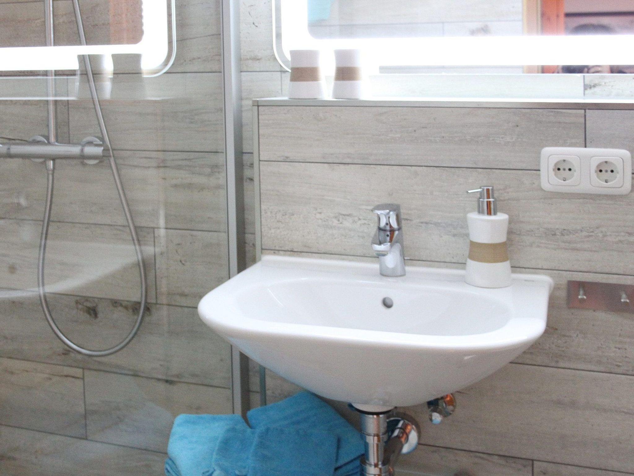 Sie ist hochwertig und mit Liebe zum Detail ländlich eingerichtet. Die Pantryküche befindet sich im Eingang der Ferienwohnung und ist ausgestattet mit einer Spüle, einem Ceran Herd mit zwei Platten, Kühlschrank mit Gefrierfach, Wasserkocher Toaster und Kaffeemaschine. Der Schlafraum bietet neben einem großzügigen Doppelbett (1,80 x 2,00 m), einem Kleiderschrank mit viel Stauraum auch einen Essbereich mit gemütlicher Sitzecke. Sowohl vom Bett als auch von der Sitzecke kann man dem Fernsehprogramm auf dem Flachbild TV folgen. Der Schlafraum verfügt über ausreichend Platz für ein Babyreisebett. Das moderne Bad mit Fliesen in Holzoptik ist mit einer ebenerdigen Dusche und einer Toilette ausgestattet. Über dem Waschbecken befindet sich ein großer beleuchteter Spiegel. Außerdem sind ein Föhn sowie Handtuchtrockner vorhanden. Aus Rücksicht auf andere Gäste ist das Rauchen in der Wohnung nicht gestattet. WLAN ist vorhanden und kostenfrei.