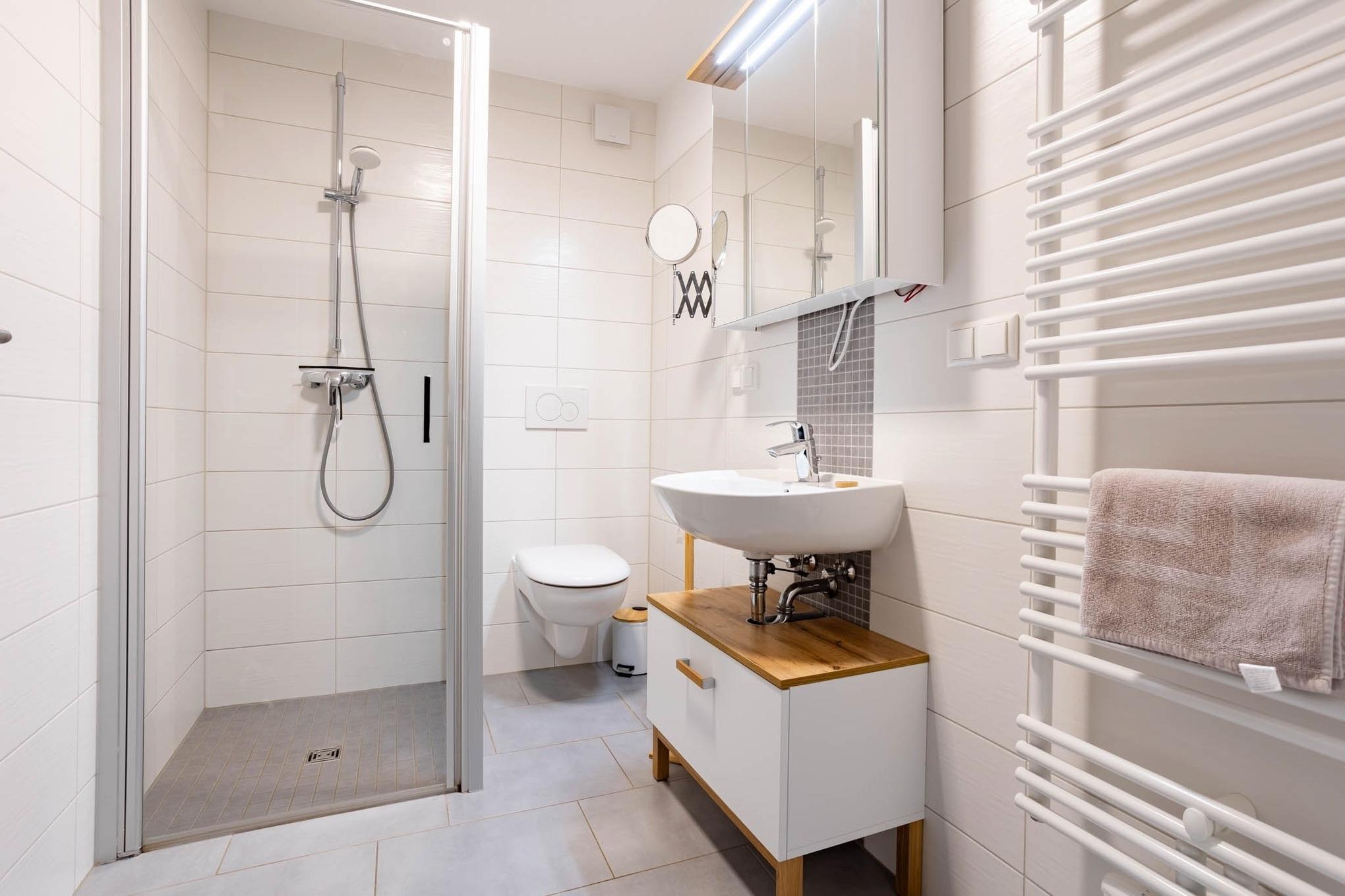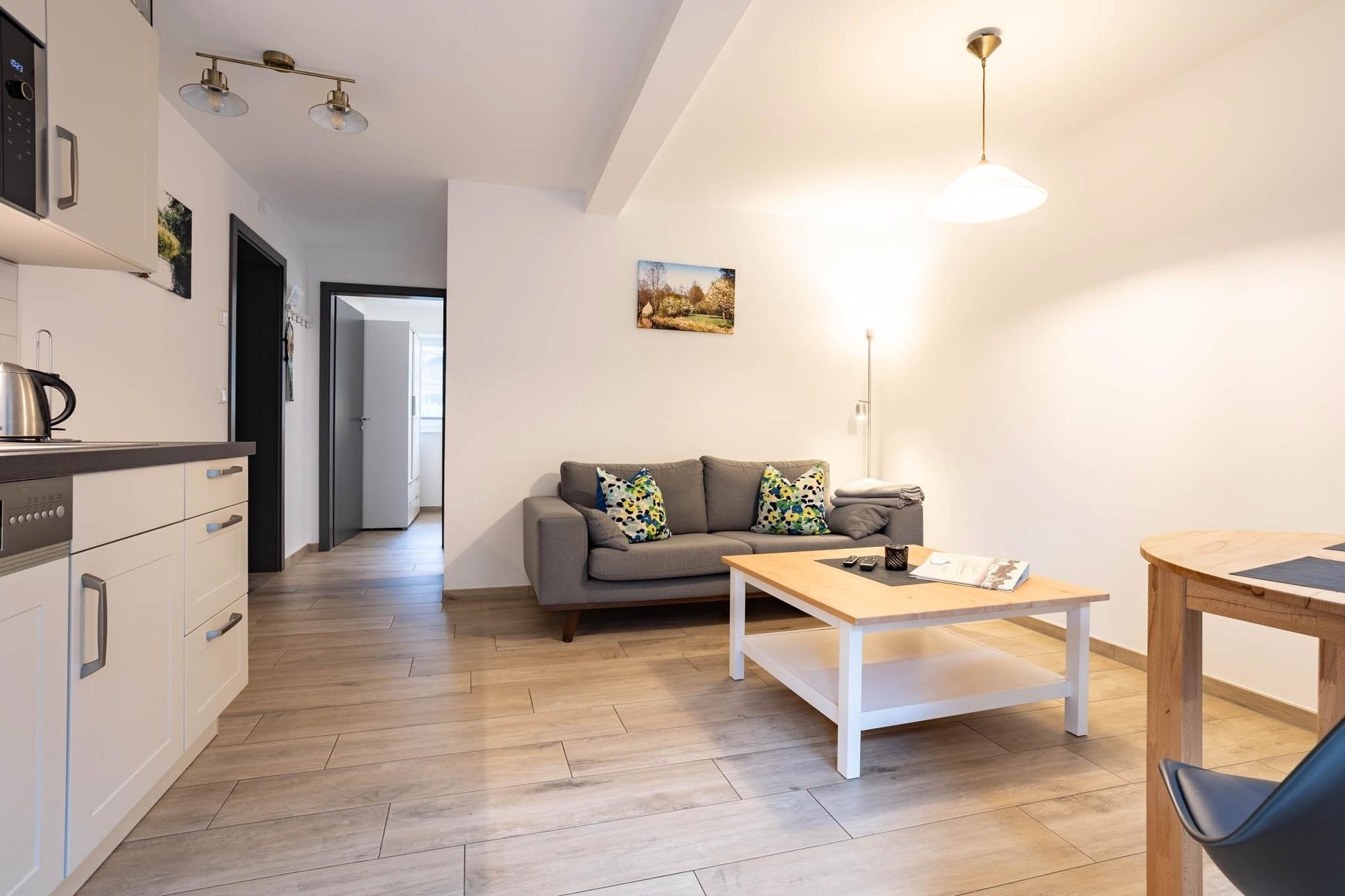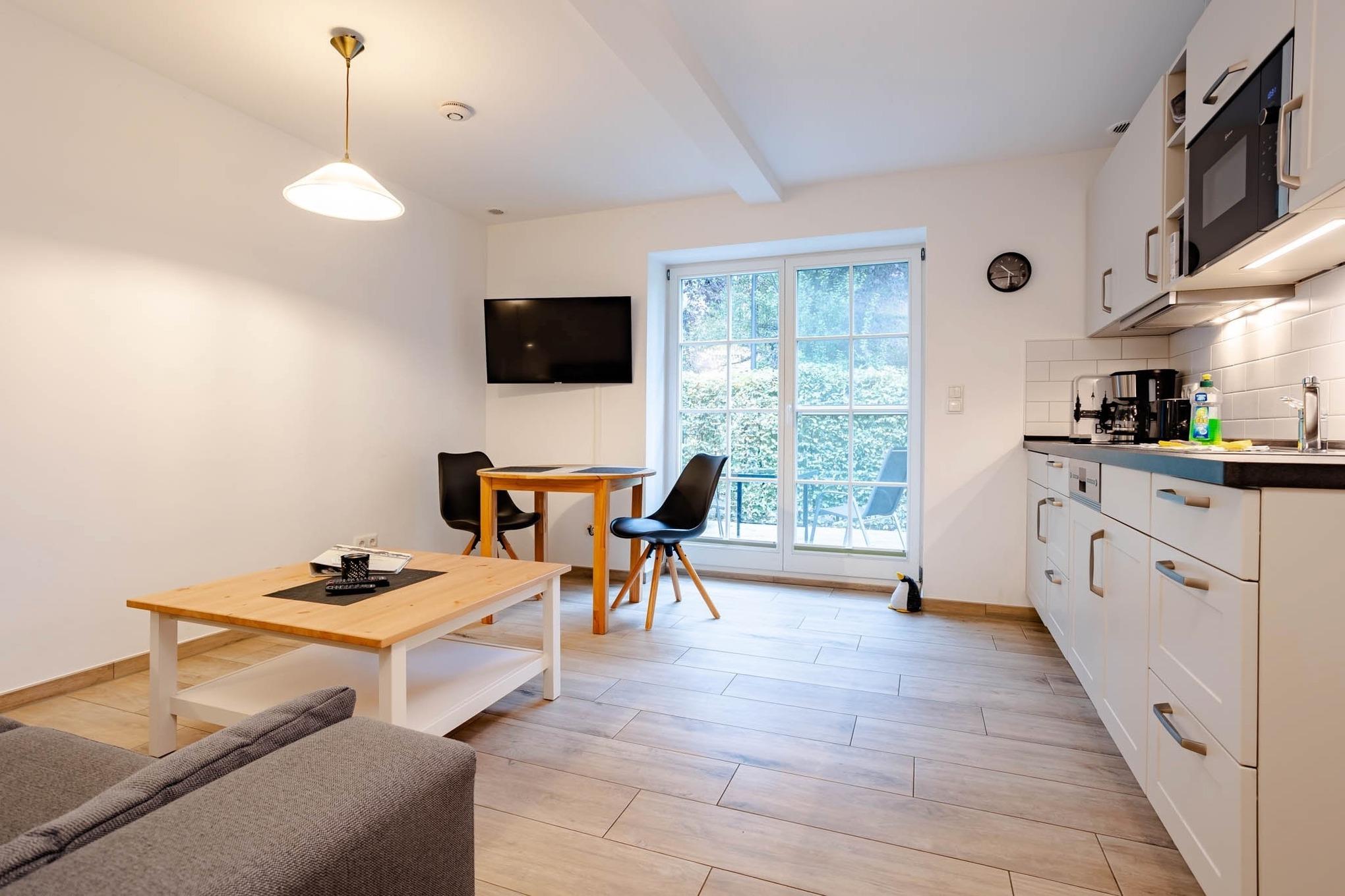 Kuschelige 2-Zimmer-Ferienwohnung für zwei Personen mit Fussbodenheizung, vollausgestatteter Küchenzeile, Duschbad und getrenntem Schlafzimmer mit eigener Terrasse.