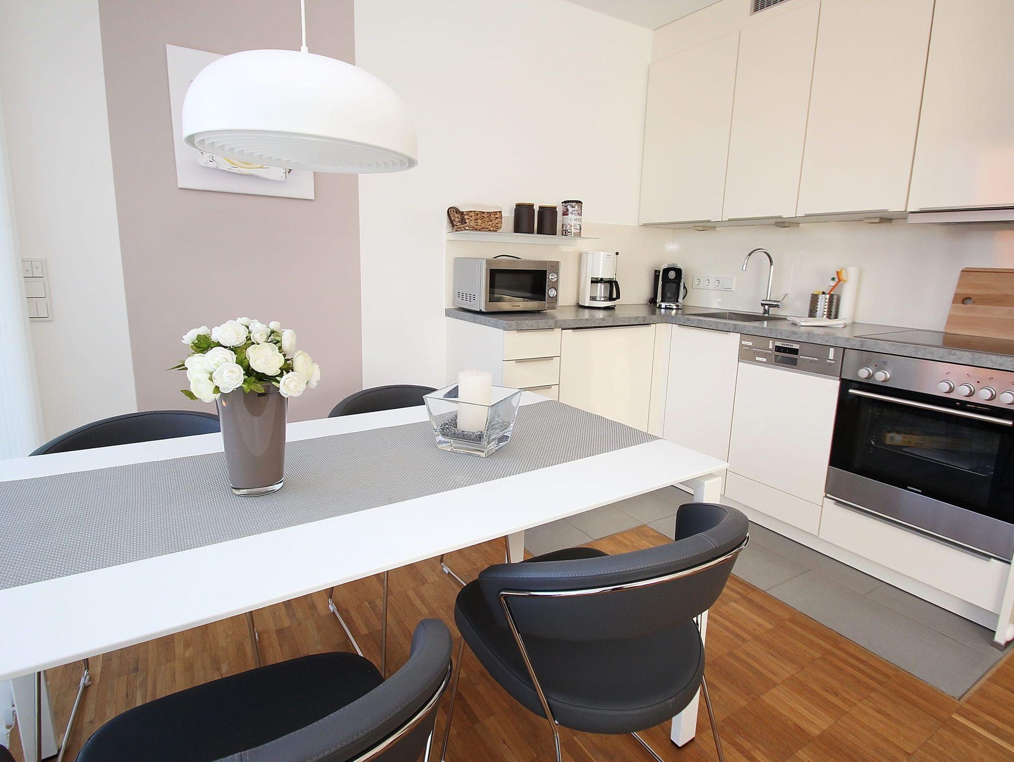 Balkon, Küche, Geschirrspüler, Mikrowelle, Duschbad/WC, Fön, TV, Stereoanlage, W-Lan, Aufzug, Abstellmöglichkeit für Fahrräder, inkl. Außenstellplatz vorm Haus.