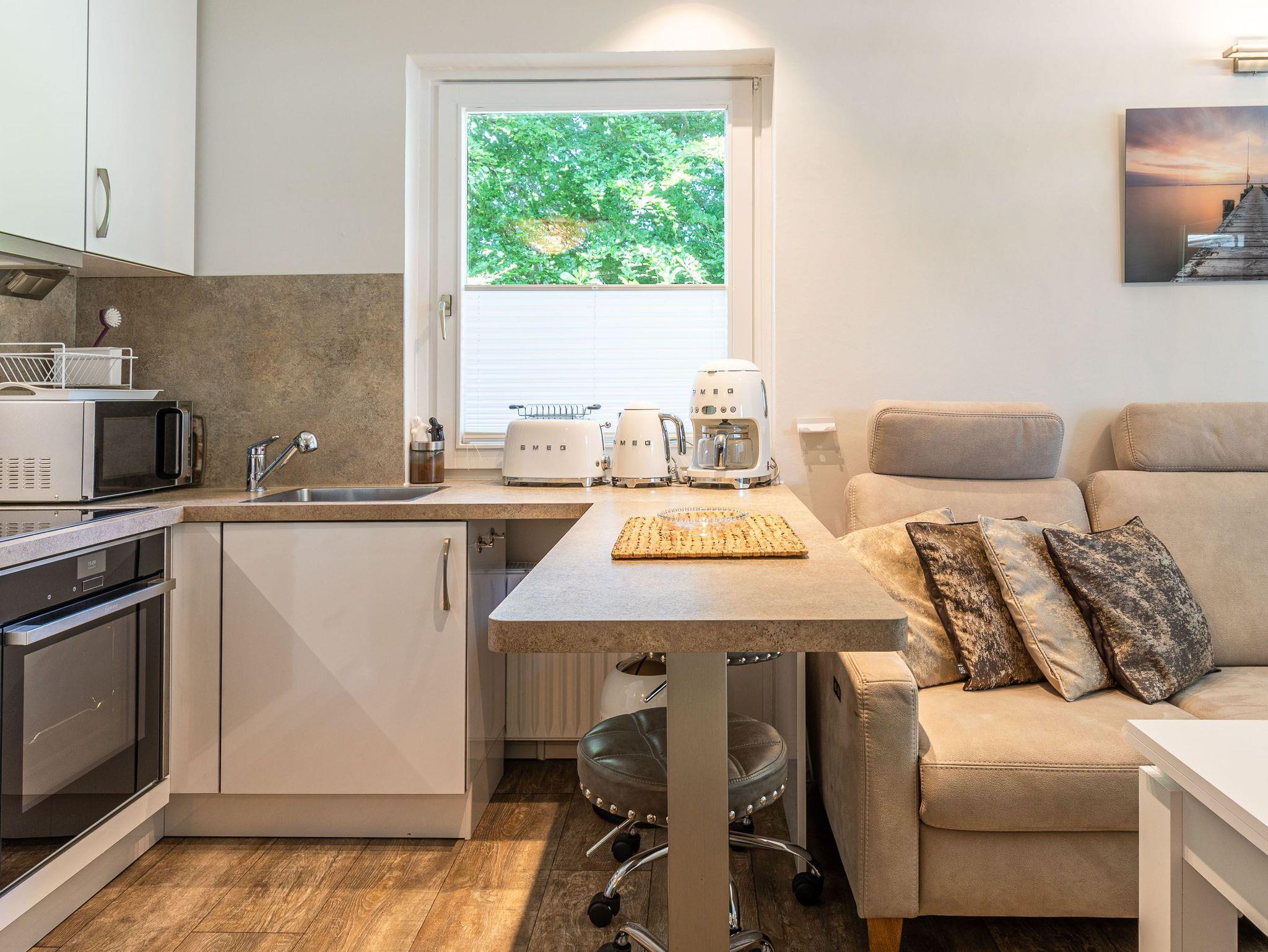 Das Appartement befindet sich in der 2. Etage in einer ruhigen, gepflegten Wohnanlage mit einer großen Sonnenterasse und ist nur wenige Schritte vom Strand entfernt. Es lädt sofort zum Wohlfühlen ein. Im hellen Wohnbereich steht eine gemütliche Eckcouch gegenüber der offenen Küche. In der Wohnraumnische befindet sich ein schönes Doppelbett (160 cm x 200 cm) und ein Kleiderschrank. Im kleinen Schlafzimmer steht ein Einzelbett (120 cm x 200 cm). Abgehend vom Flur erreichen Sie das helle Duschbad und das separate WC. Genießen Sie Ihr Frühstück bei Sonnenschein auf der schönen Terrasse bei herrlicher Umgebung unmittelbar am Strand.