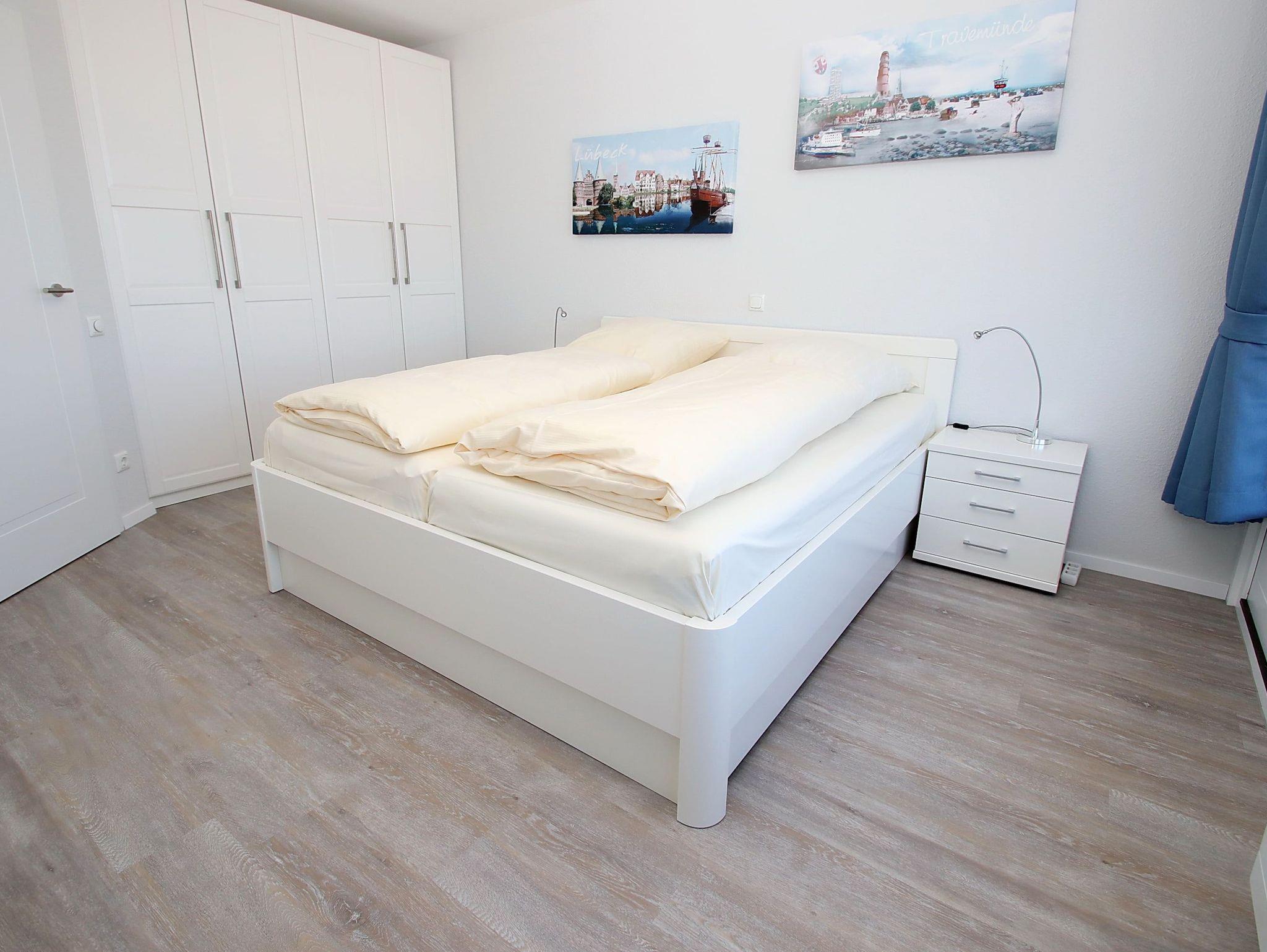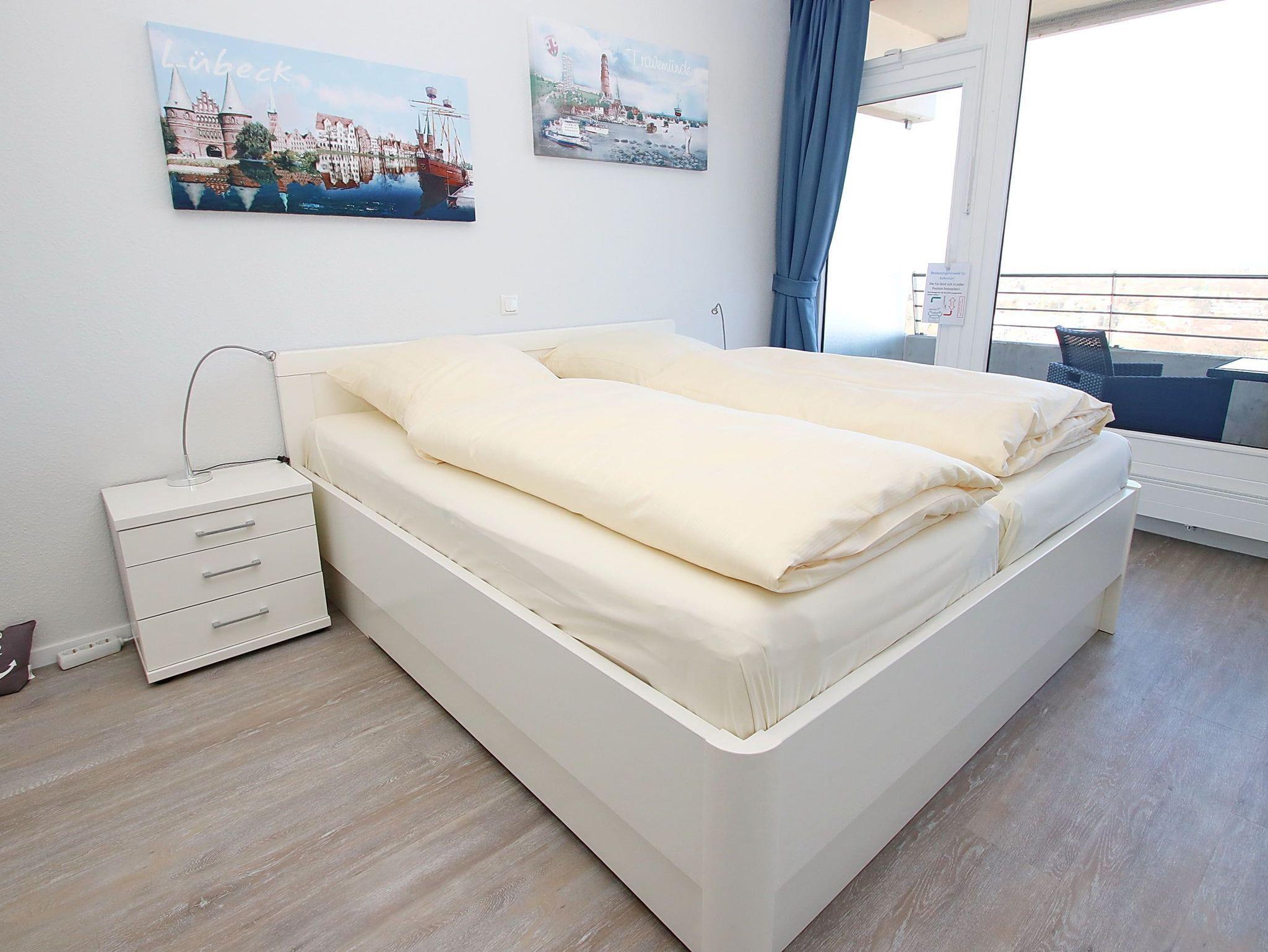 Direkt am Strand erwartet Sie hier ein modernes, im maritimen Stil möbliertes 2-Zimmer-Appartement mit allem Komfort zum Wohlfühlen. Im Wohnraum befinden sich eine gemütliche Eckcouch mit einem Couchtisch sowie ein Esstisch mit vier Stühlen. Dank der gut ausgestatteten Küchenzeile, die sich ebenfalls im Wohnraum befindet, können Sie entscheiden, ob Sie selber kochen oder sich durch die kulinarische Küche Travemündes schlemmen möchten. Im Schlafzimmer stehen ein bequemes Doppelbett (2x 90 cm x 200 cm) und ein Kleiderschrank. Das Duschbad, das Sie vom Flur erreichen, ist in warmen Farben gehalten. Die sehr geschmackvoll eingerichtete Wohneinheit lässt keine Wünsche offen und lädt zu einem wunderschönen Urlaub an der Ostsee ein. Den großen Balkon erreichen Sie von beiden Zimmern. Hier genießen Sie einen fantastischen Blick auf den Strand und die Lübecker Bucht.