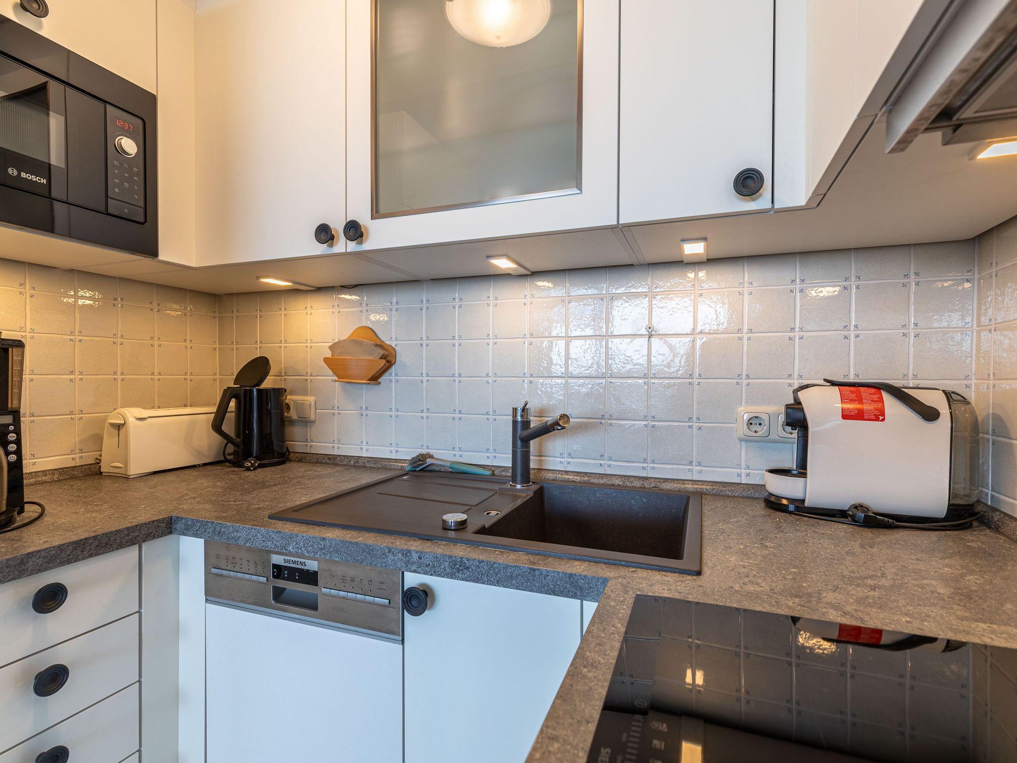 Umlaufende Loggia von ca. 26 m², offene Einbauküche, Mikrowelle, Geschirrspüler, Waschmaschine/Trockner, Duschbad/WC, Fön, 2x TV, Stereoanlage mit Digitalradio, kostenl. W-Lan, Aufzug, inkl. Tiefgaragenstellplatz (Einfahrtshöhe: 1,85 m).