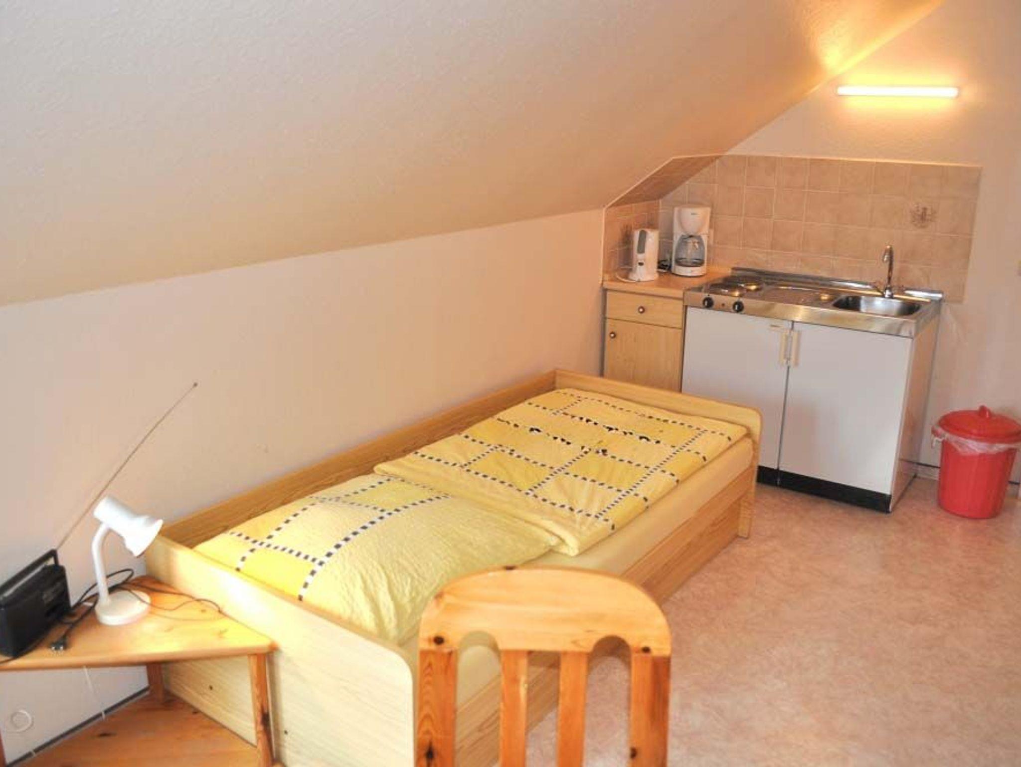 Schlafzimmer 1: 2 Plattenherd, Einzelbett, Essecke, Geschirr, Kaffeemaschine, Kochtöpfe, Küchenschrank, Küchenzeile, Kühlschrank, Radio, Wasserkocher