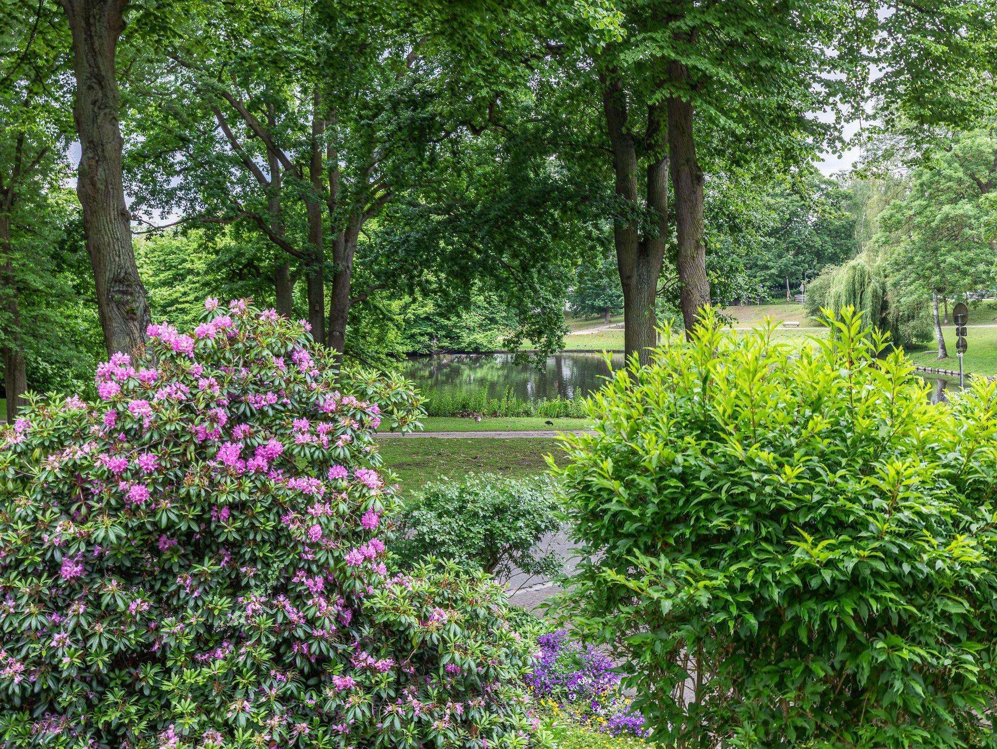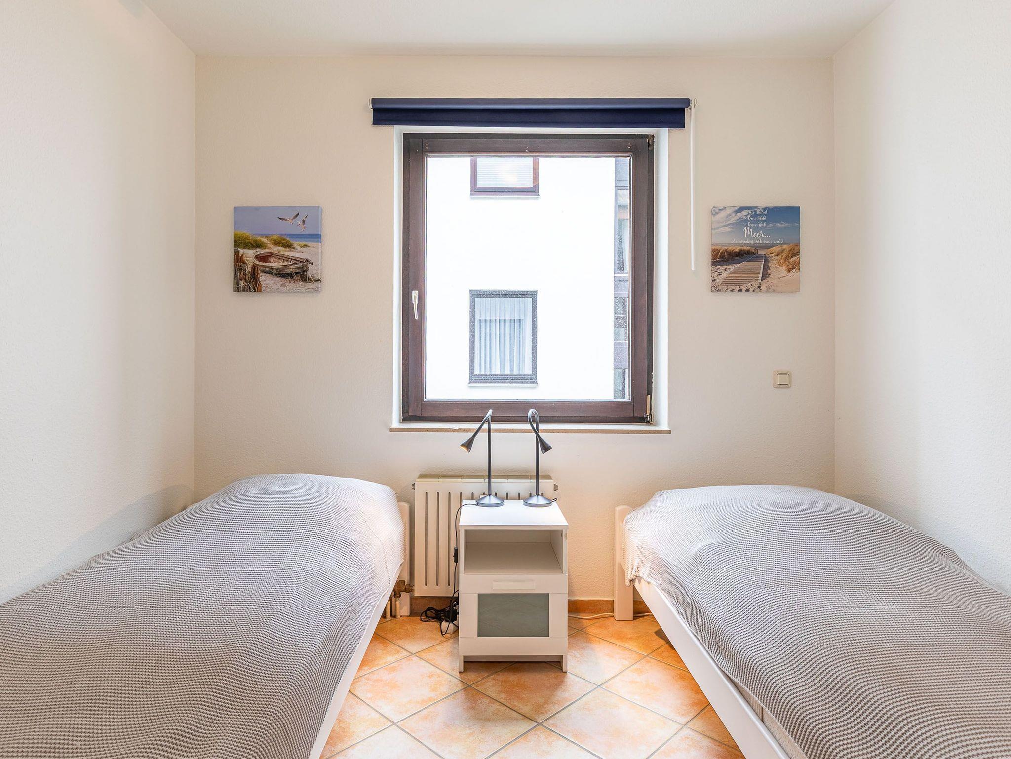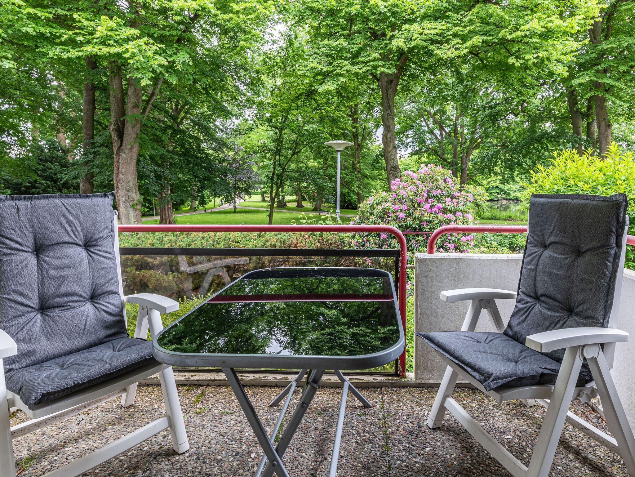 Diese großzügig geschnittene 3-Zimmer-Wohnung verläuft über zwei Ebenen. Sie bietet ausreichend Platz für einen Urlaub mit der ganzen Familie. Im Hochparterre befindet sich der Wohnraum mit kleinem Erker, der mit einer gemütlichen Couch, einem Tisch, einem Relaxsessel mit Fußhocker am Fenster und einem Wohnzimmerschrank möbliert ist. Die Küche geht vom Wohnbereich ab. Ebenfalls finden Sie auf dieser Ebene ein Schlafzimmer mit zwei Einzelbetten (je 90 cm x 200 cm) und zwei Kleiderschränken sowie das Badezimmer. Im Souterrain, durch eine Wendeltreppe vom Wohnzimmer erreichbar und mit Zugang zur überdachten Terrasse, stehen eine Couch, ein Sessel mit Tisch, ein komfortables Doppelbett (2x 90 cm x 200 cm) und ein Kleiderschrank. Vom Balkon im Hochparterre genießen Sie den herrlichen Blick auf die schöne Parkanlage.