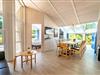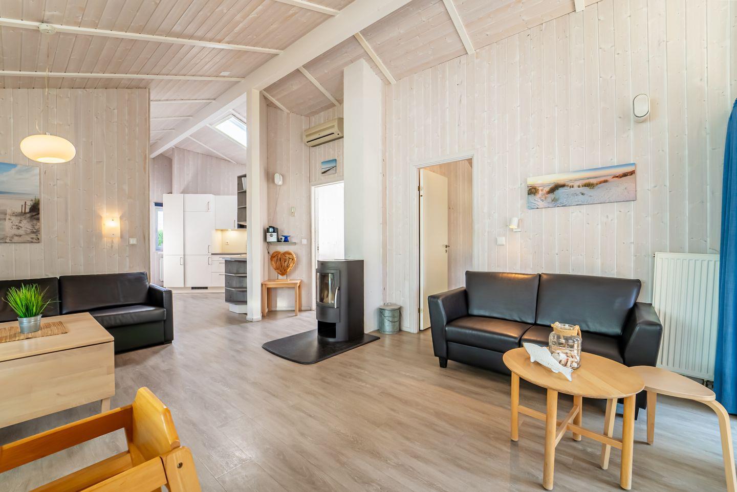 Der große Essbereich und die offene Küche sind ideal für gemeinsame Stunden in großer Runde. Ein modernes Sofa und ein einladender Essbereich schaffen eine gemütliche Atmosphäre. Der Kaminofen sorgt für Wärme, während der Flachbild-TV, das Radio mit CD-Spieler und der DVD-Player für Unterhaltung sorgen. Große Fenster mit Vorhängen garantieren eine angenehme Privatsphäre.