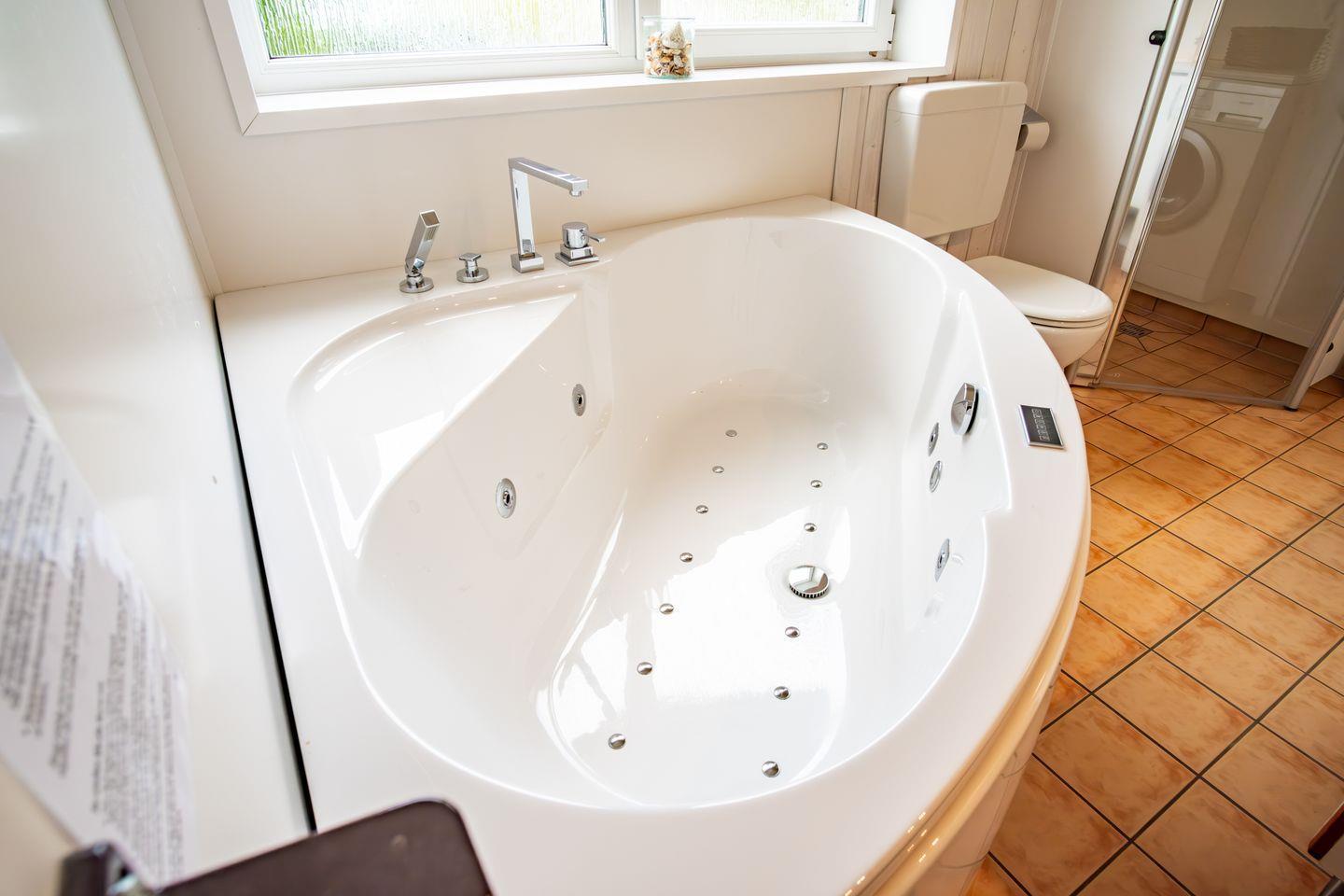 Das Badezimmer bietet eine Sauna, einen Whirlpool (für bis zu 2 Personen), eine bodengleiche Dusche, WC und ein Waschbecken.