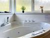 Das Badezimmer bietet eine Sauna, einen Whirlpool (für bis zu 2 Personen), eine bodengleiche Dusche, ein WC und ein Waschbecken.