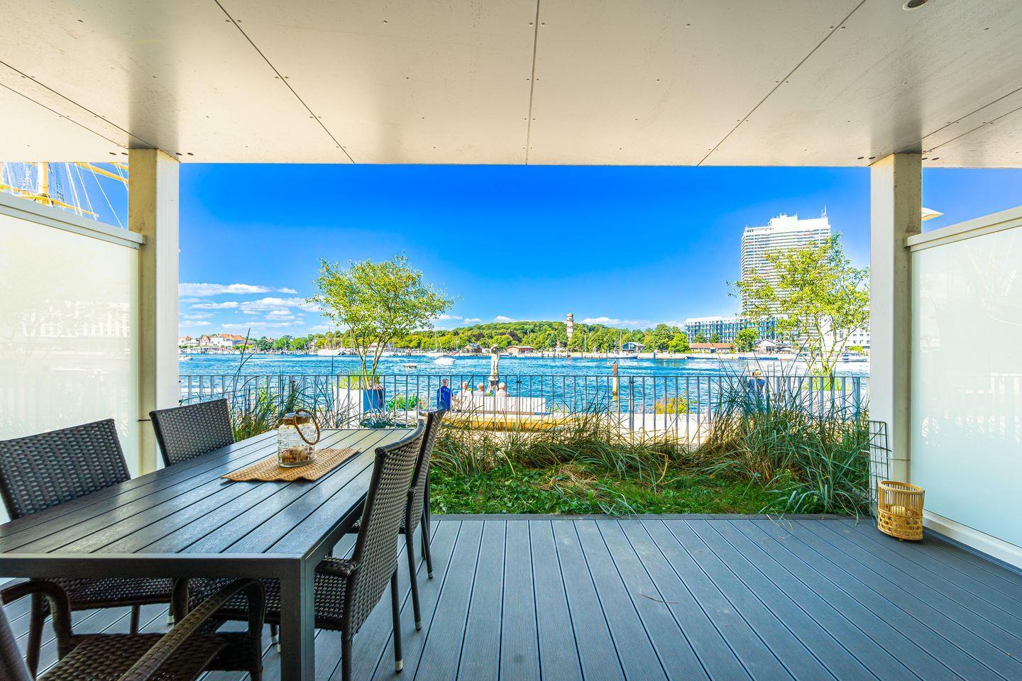 Die überdachte Terrasse mit Gartenmöbeln ist der perfekte Ort, um die frische Seeluft zu genießen und den beeindruckenden Meer- und Strandblick auf Dich wirken zu lassen.