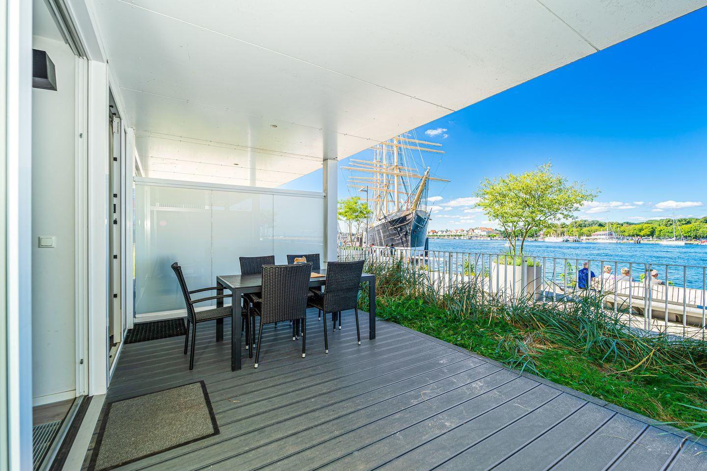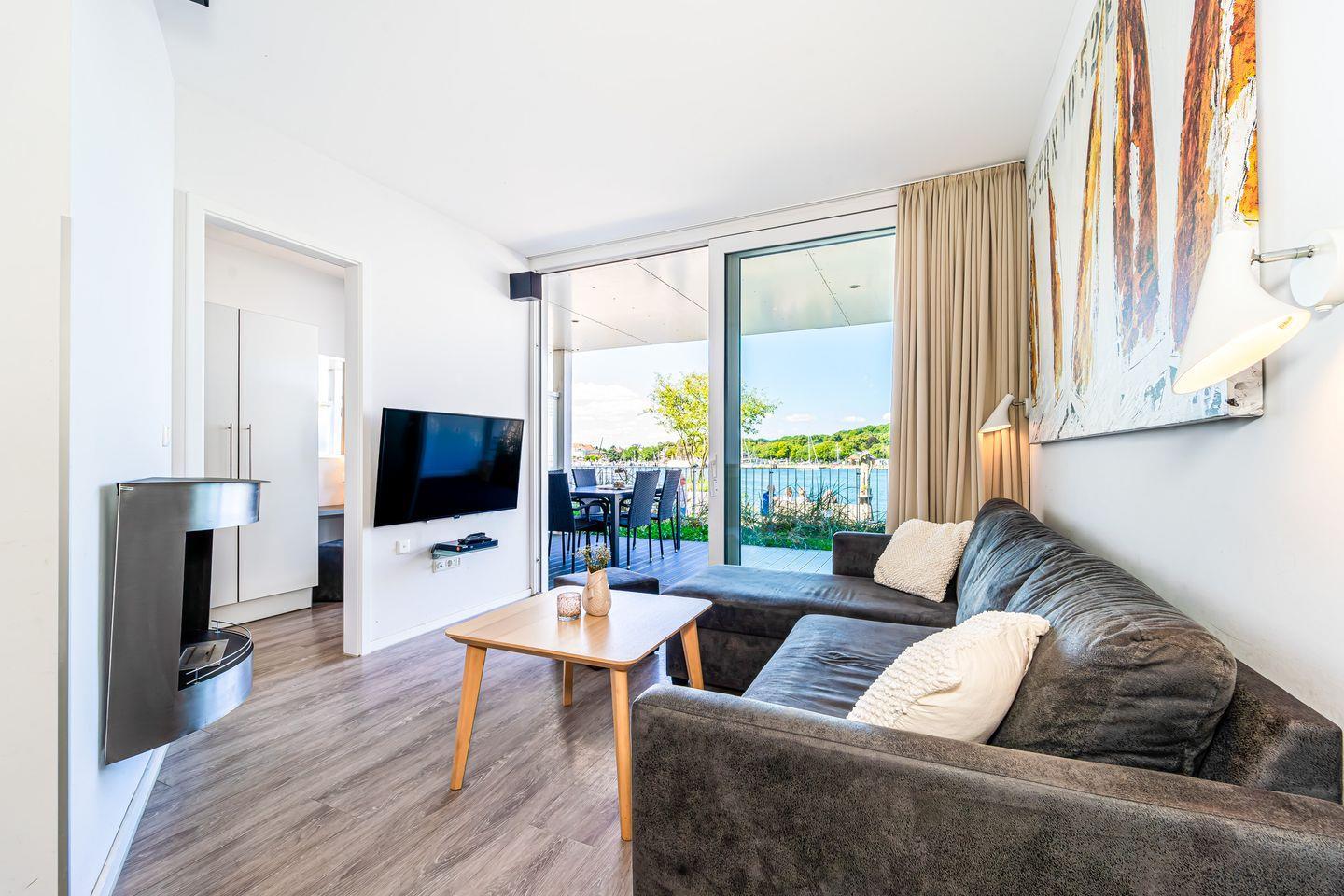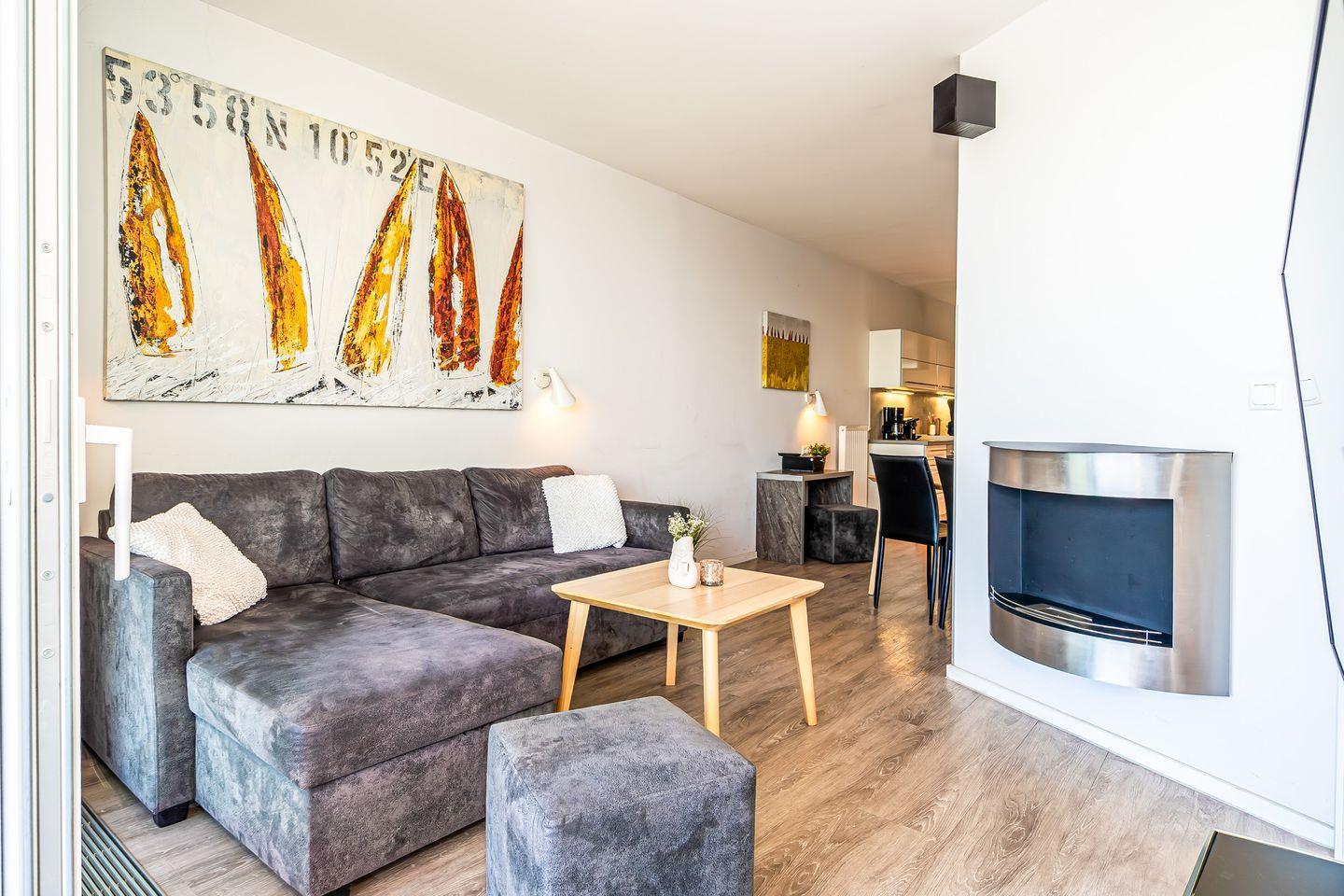 Der Wohnbereich ist hochwertig eingerichtet mit einem Sofa, HiFi-Anlage, Blu-ray-Player und zwei Flachbild-TVs. Ein besonderes Highlight ist der Bioethanolkamin, der abends für eine warme und behagliche Atmosphäre sorgt. Das Sofa lässt sich bei Bedarf in zwei bequeme Schlafplätze verwandeln. Durch die großen Fenster kannst Du jederzeit den traumhaften Panoramablick über den Segelhafen, die Travemündung, das Museumsschiff „Passat“ und die vorbeiziehenden Skandinavienfähren genießen.