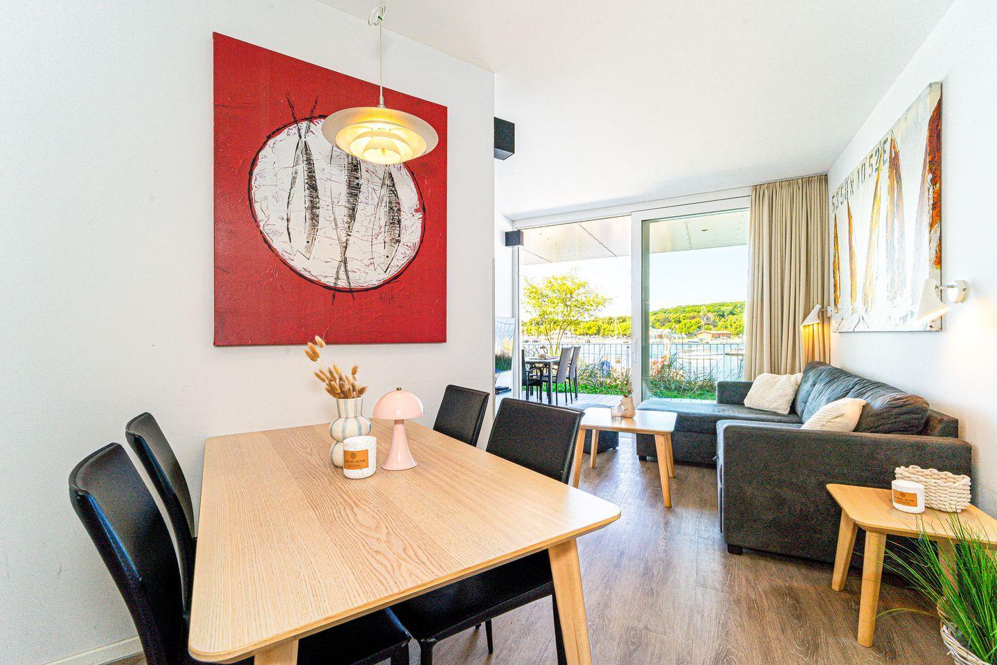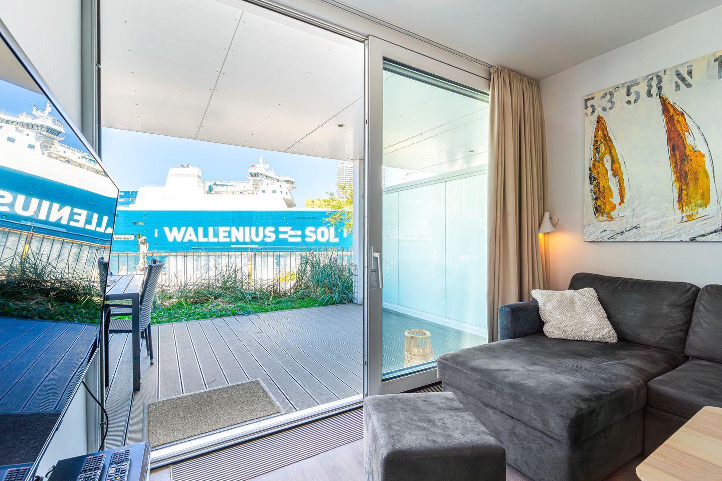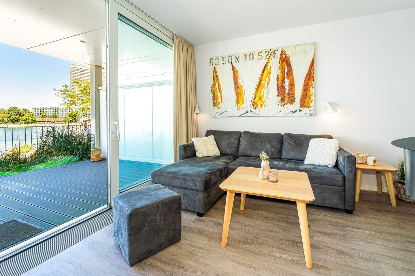 Der Wohnbereich ist hochwertig eingerichtet mit einem Sofa, HiFi-Anlage, Blu-ray-Player und zwei Flachbild-TVs. Ein besonderes Highlight ist der Bioethanolkamin, der abends für eine warme und behagliche Atmosphäre sorgt. Das Sofa lässt sich bei Bedarf in zwei bequeme Schlafplätze verwandeln. Durch die großen Fenster kannst Du jederzeit den traumhaften Panoramablick über den Segelhafen, die Travemündung, das Museumsschiff „Passat“ und die vorbeiziehenden Skandinavienfähren genießen.