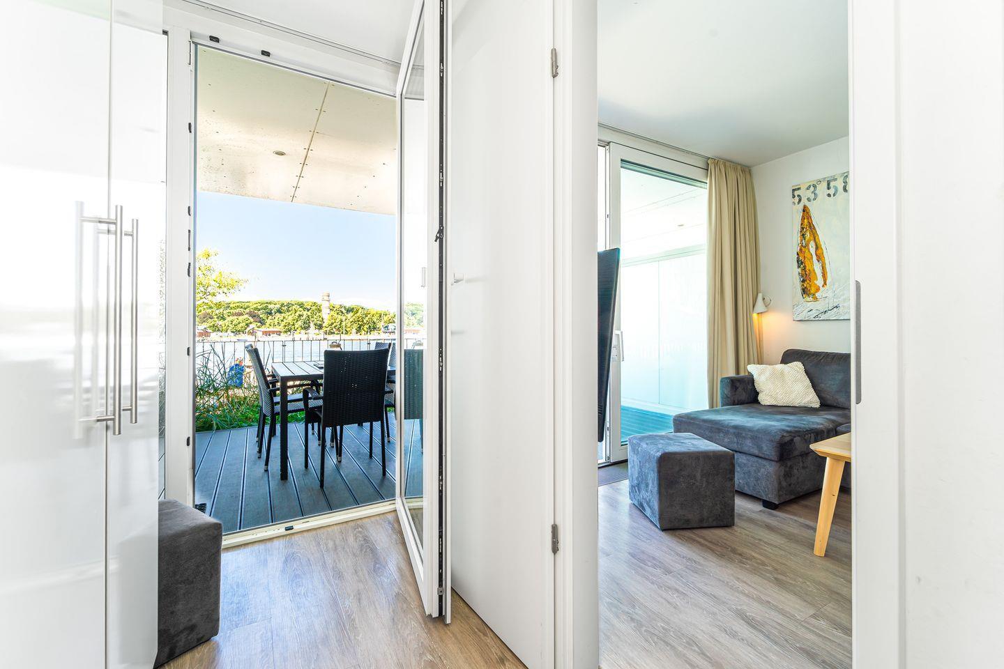 Das Schlafzimmer bietet ein komfortables Doppelbett sowie ausreichend Stauraum. Von hier aus hast Du ebenfalls einen wunderbaren Blick aufs Wasser – und dank einer eigenen Terrassentür gelangst Du direkt ins Freie. So kannst Du morgens die frische Meeresluft genießen oder den Abend entspannt mit Aussicht ausklingen lassen.