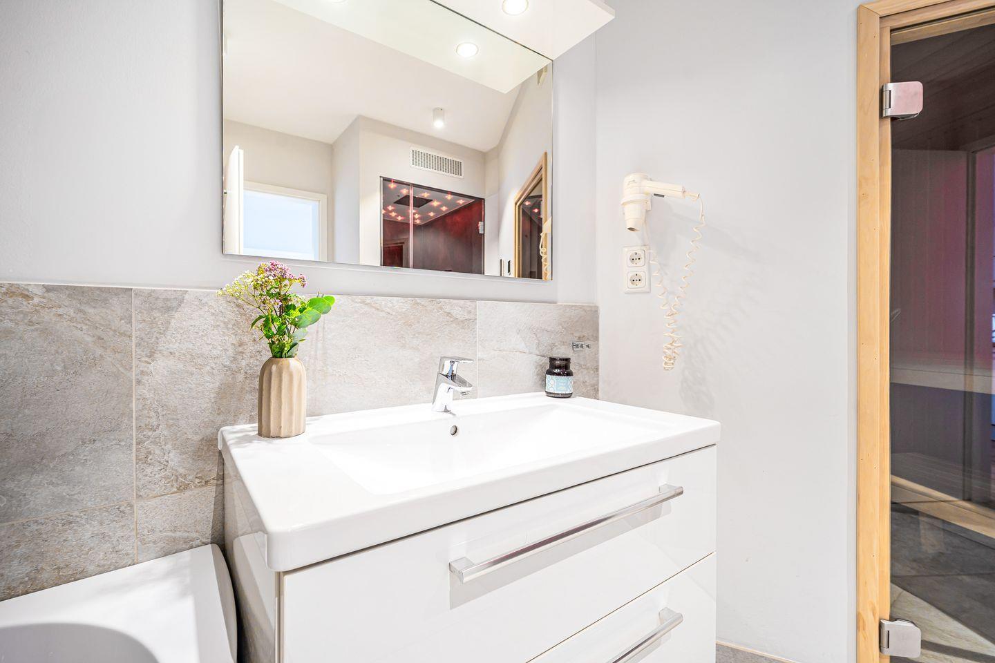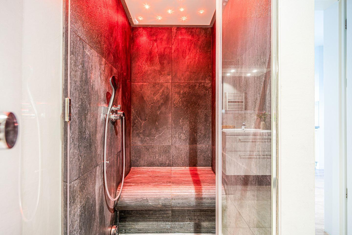 Ein Highlight ist Dein ganz persönlicher Wellnessbereich im Badezimmer: eine Sauna, eine Badewanne mit Whirlpool Funktion und ein Dampfbad mit integrierter Regendusche sorgen für pure Entspannung.