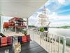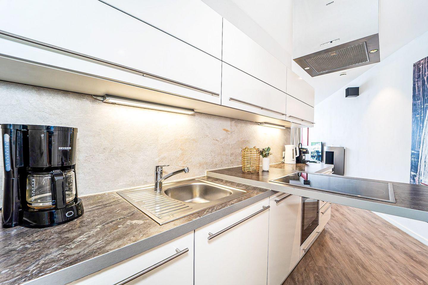 Der lichtdurchflutete Wohnbereich ist mit Sofa, Sesseln, HiFi-Anlage, zwei Flachbild-TVs und einem Schreibtisch ausgestattet. Für gemütliche Stunden sorgt der Bioethanolkamin, der eine besonders behagliche Atmosphäre schafft. Durch die großen Panoramafenster genießt Du von hier aus den eindrucksvollen Ausblick auf den Segelhafen, die Travemündung, das Museumsschiff „Passat“ und die vorbeiziehenden Skandinavienfähren.