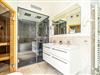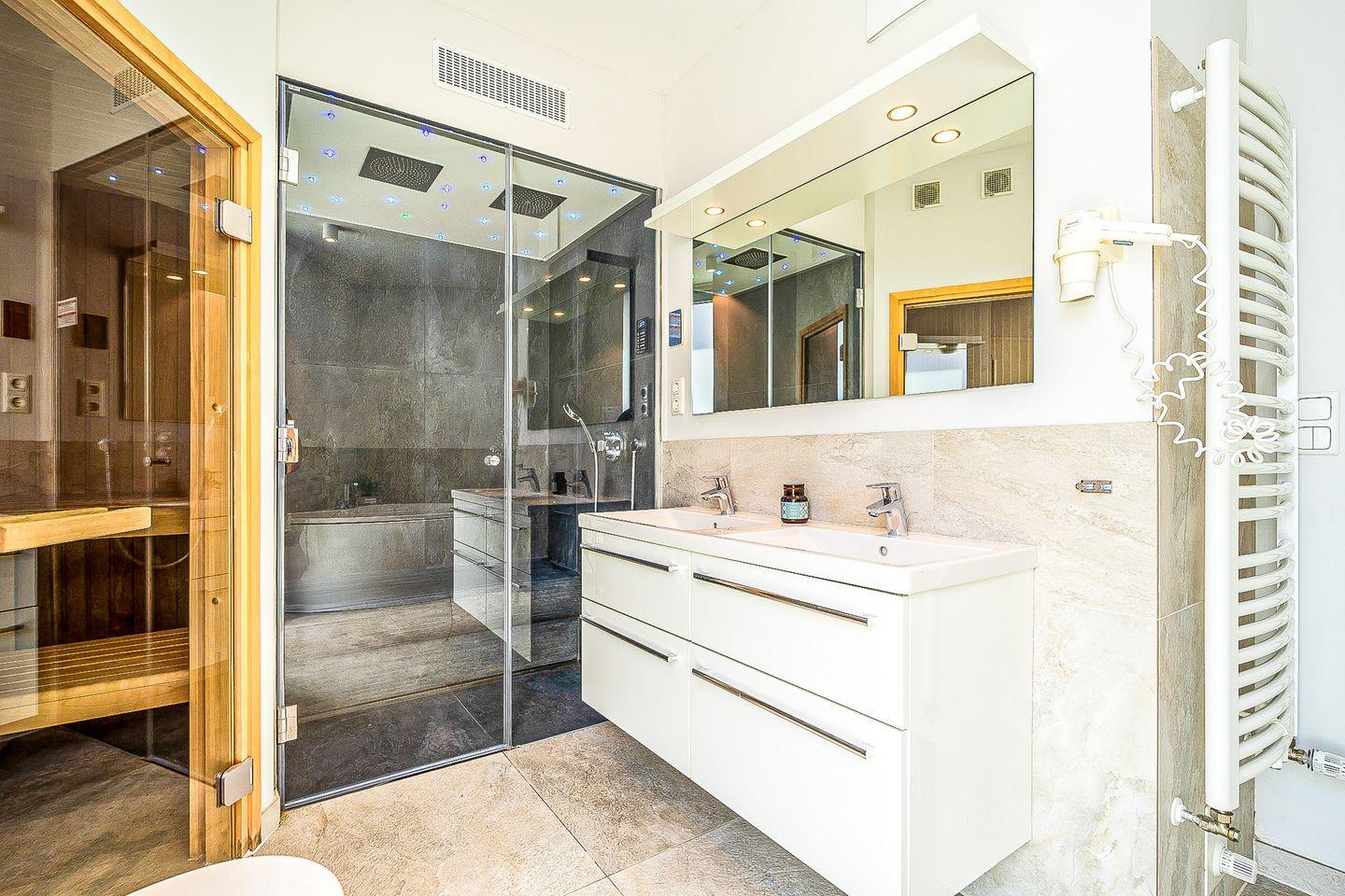 Das luxuriöse Badezimmer wird zu Deinem persönlichen Wellnessbereich: eine moderne Badewanne mit wohltuender Whirlpool-Funktionsowie, ein Dampfbad mit integrierter Doppelregendusche sowie eine Sauna lassen keine Wünsche offen.