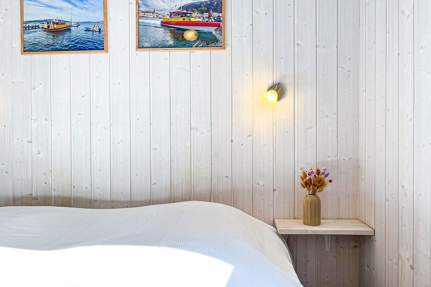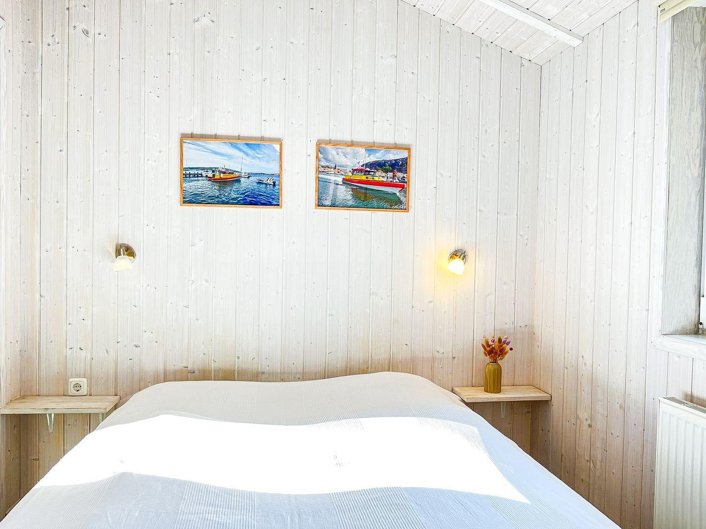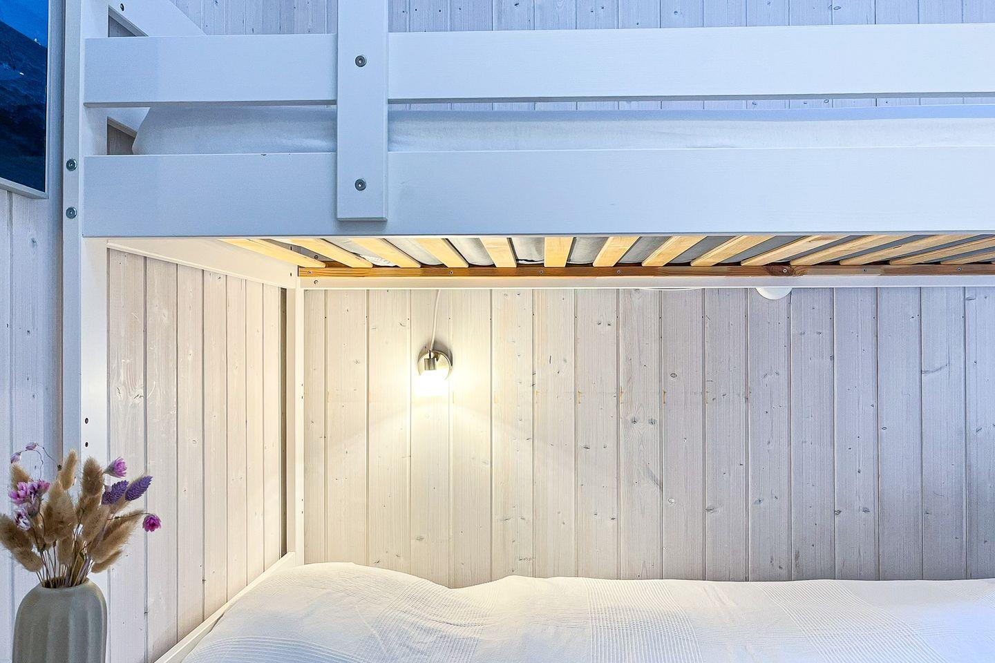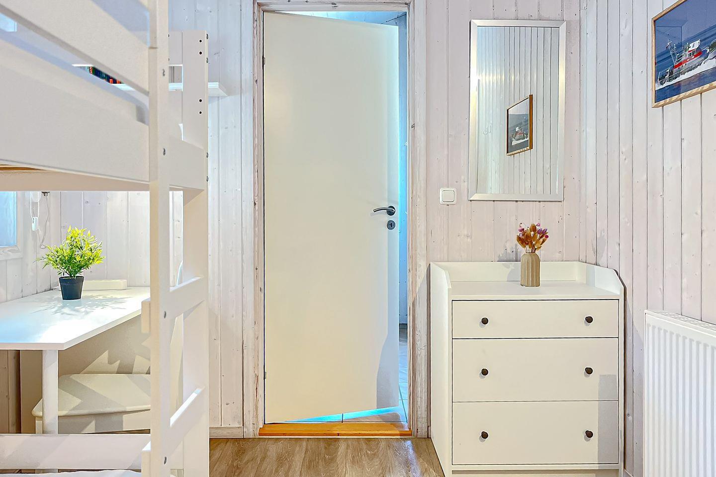 Das Haus verfügt über zwei Schlafzimmer – ideal für bis zu vier Personen. Ein Schlafzimmer ist mit einem gemütlichen Doppelbett ausgestattet, das andere bietet ein praktisches Hochbett sowie einen Schreibtisch – perfekt zum Lesen, Arbeiten oder Spielen. Beide Zimmer verfügen über ausreichend Stauraum für Deine Urlaubssachen.