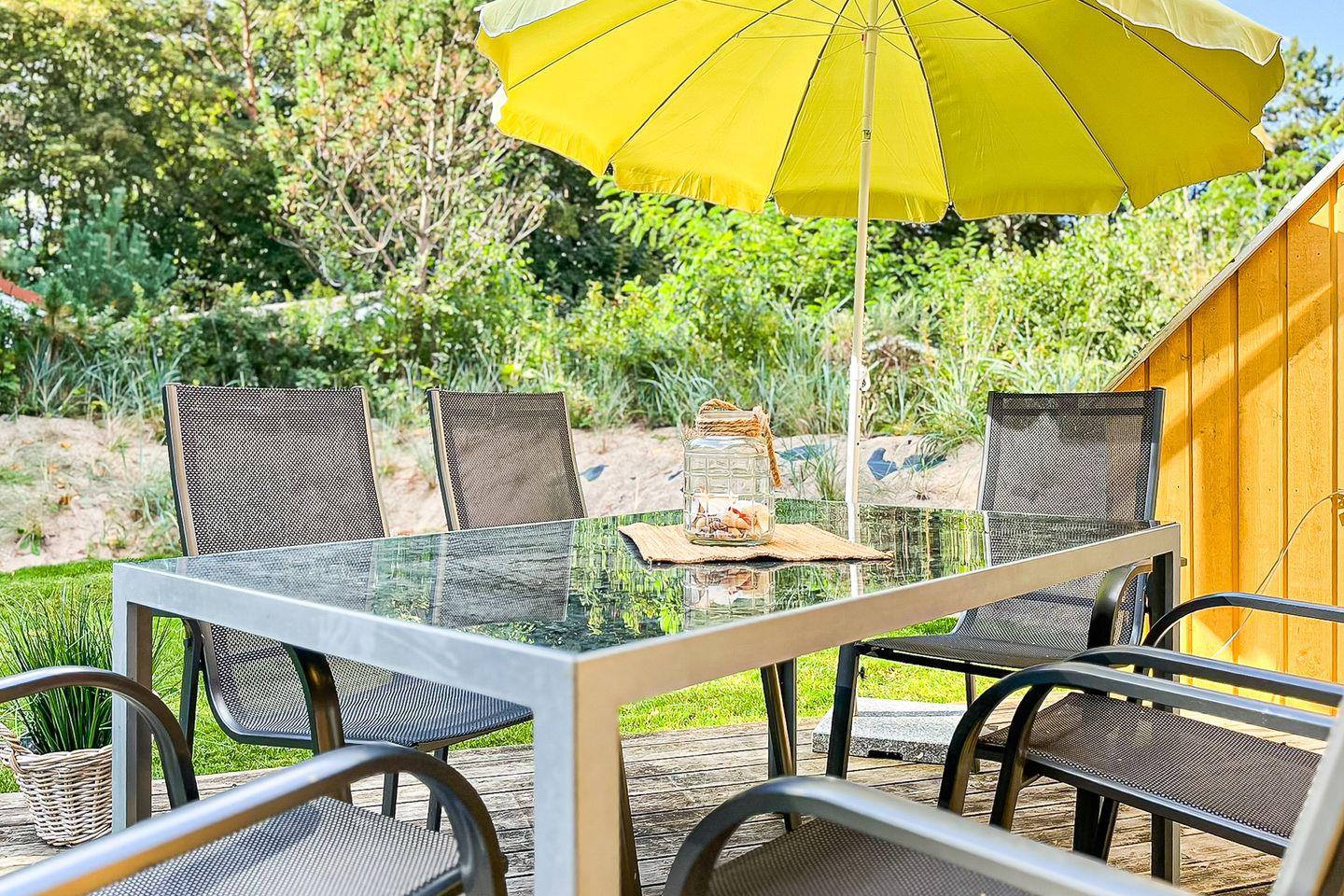 Die private Terrasse mit Gartenmöbeln, Sonnenschirm und Blick ins Grüne lädt zum Frühstück im Freien oder zum entspannten Grillabend ein – ein Holzkohlegrill steht Dir zur Verfügung! Ein besonderes Highlight ist zudem die hauseigene Sauna, die für wohltuende Entspannungsmomente während Deines Aufenthalts sorgt.