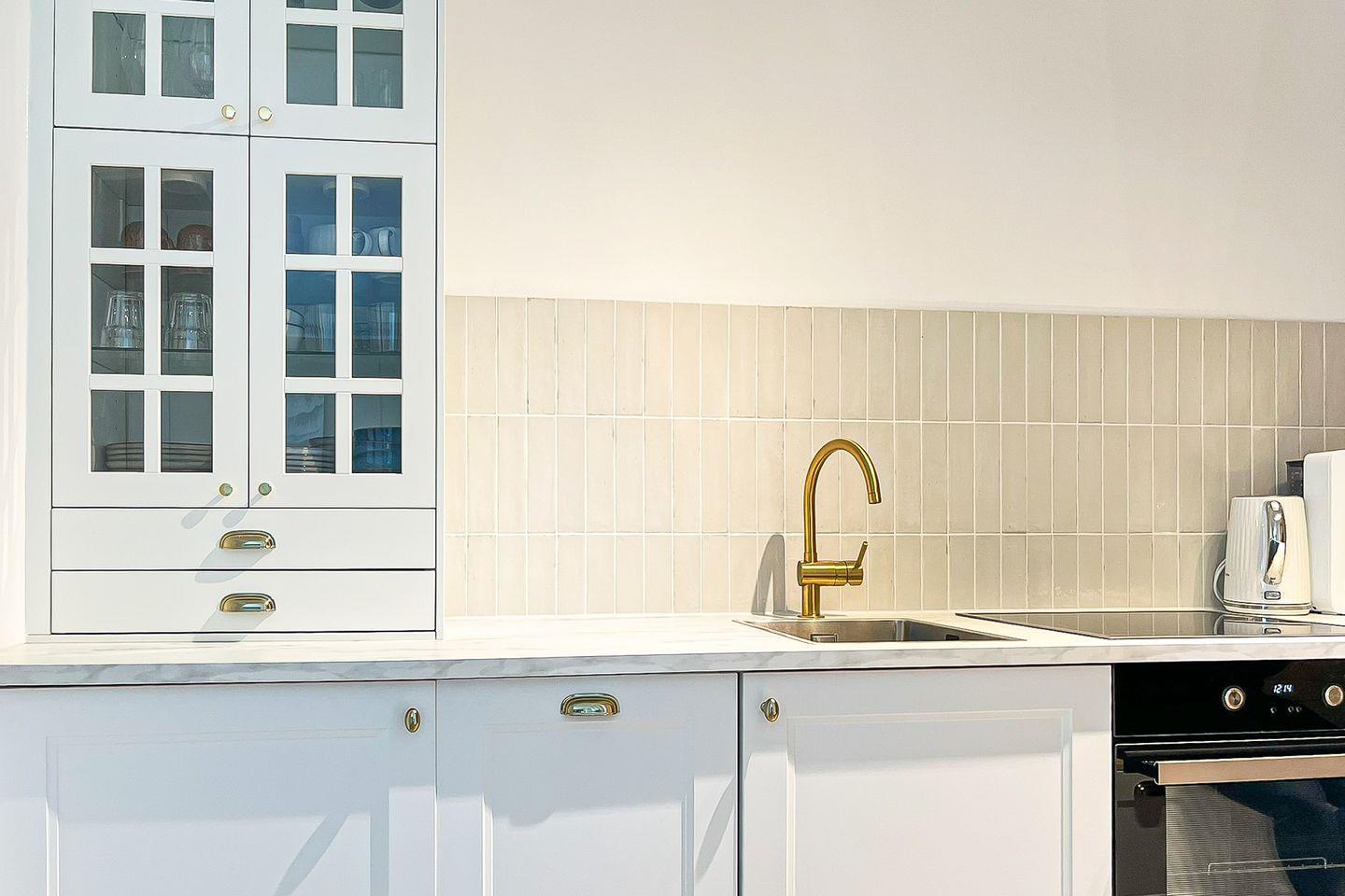 Die offene Küche ist funktional und elegant zugleich. Sie ist mit einem Induktionsherd samt Backofen, Kühlschrank mit Gefrierfach, Geschirrspülmaschine, Kaffeemaschine, Wasserkocher und Toaster vollständig ausgestattet. Ausreichend Geschirr, Besteck, Gläser und Kochutensilien sind selbstverständlich vorhanden. Der Essbereich ist harmonisch in den Wohnraum integriert und lädt zum gemeinsamen Kochen und Genießen ein.