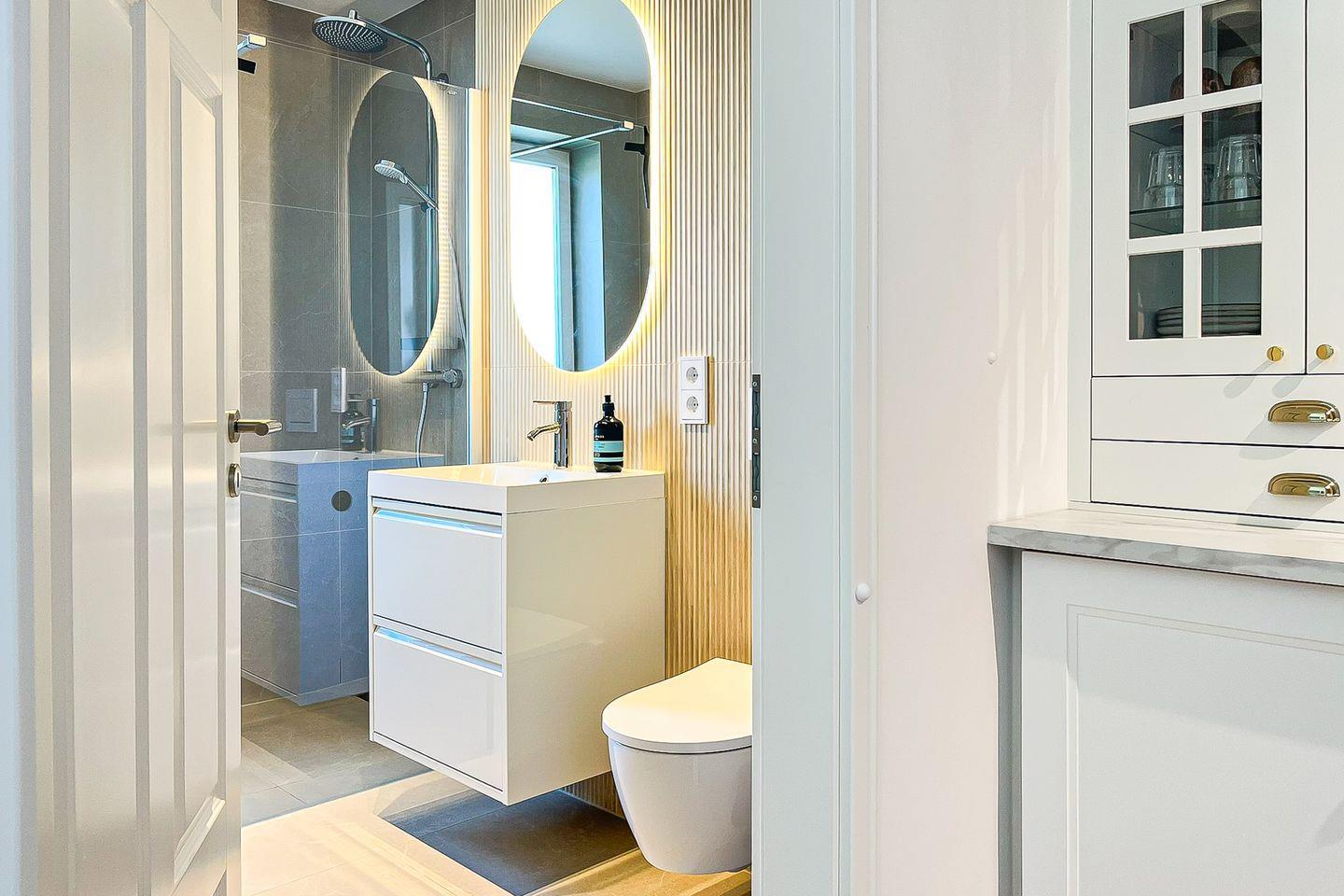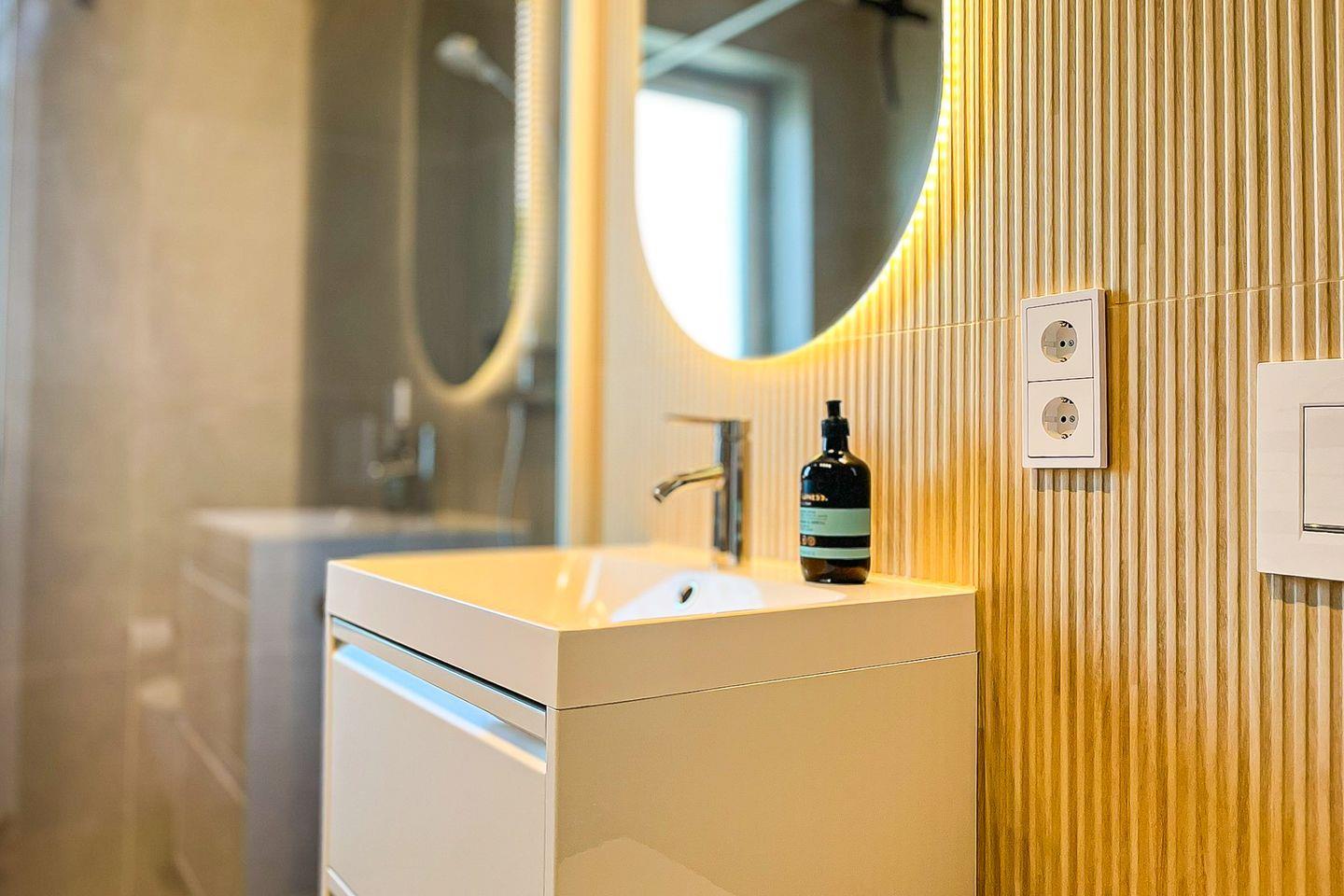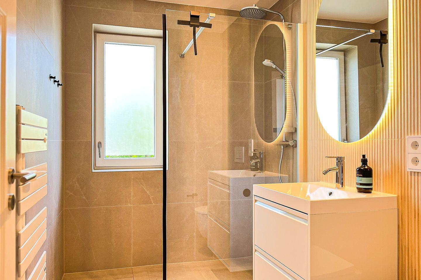 Das moderne Tageslichtbad ist hell gefliest und verfügt über eine bodengleiche Dusche, ein WC, einen Handtuchheizkörper sowie einen Haartrockner.