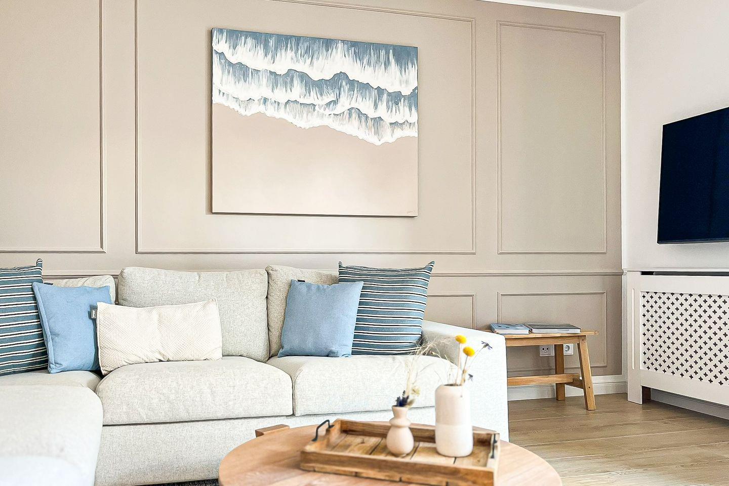 Das helle Wohnzimmer lädt mit seiner gemütlichen Sitzecke und einem hochwertigen Flachbild-TV zu entspannten Abenden ein. Ein bequemes Schlafsofa (ca. 140 x 200 cm) bietet zwei zusätzliche Schlafmöglichkeiten.