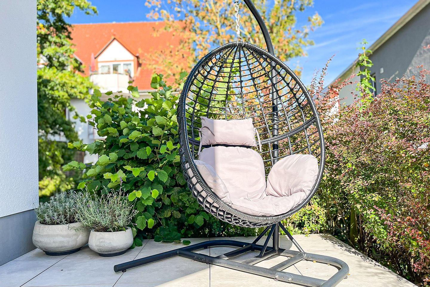 Bodentiefe Fenster verleihen dem Raum eine einladende, freundliche Atmosphäre. Von hier aus gelangen Sie auf die möblierte Terrasse mit Gartenmöbeln, die viel Platz für gemeinsame Mahlzeiten oder erholsame Stunden im Freien bietet.