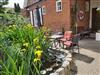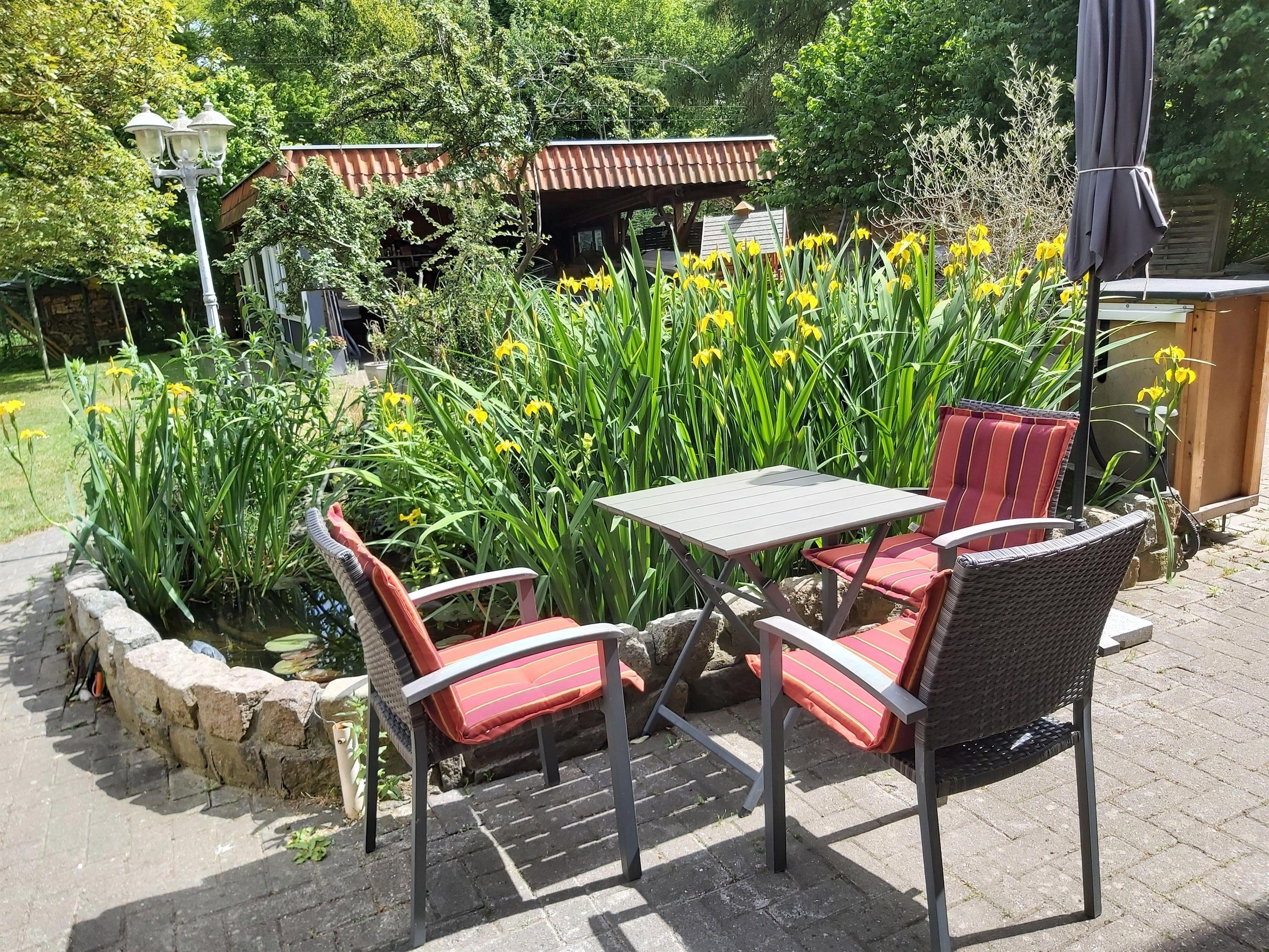 Auf dem Hof steht Ihnen eine kleine Sitzgelegenheit an unserem Teich zur Verfügung.